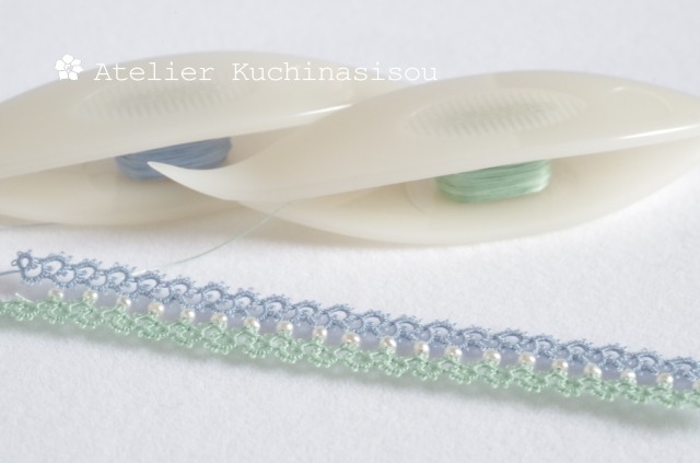 先日の新作【タティングブレードと淡水パールのピアス〈茉莉花〉】の手染めバージョンを編んでいます♪