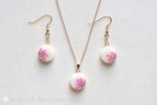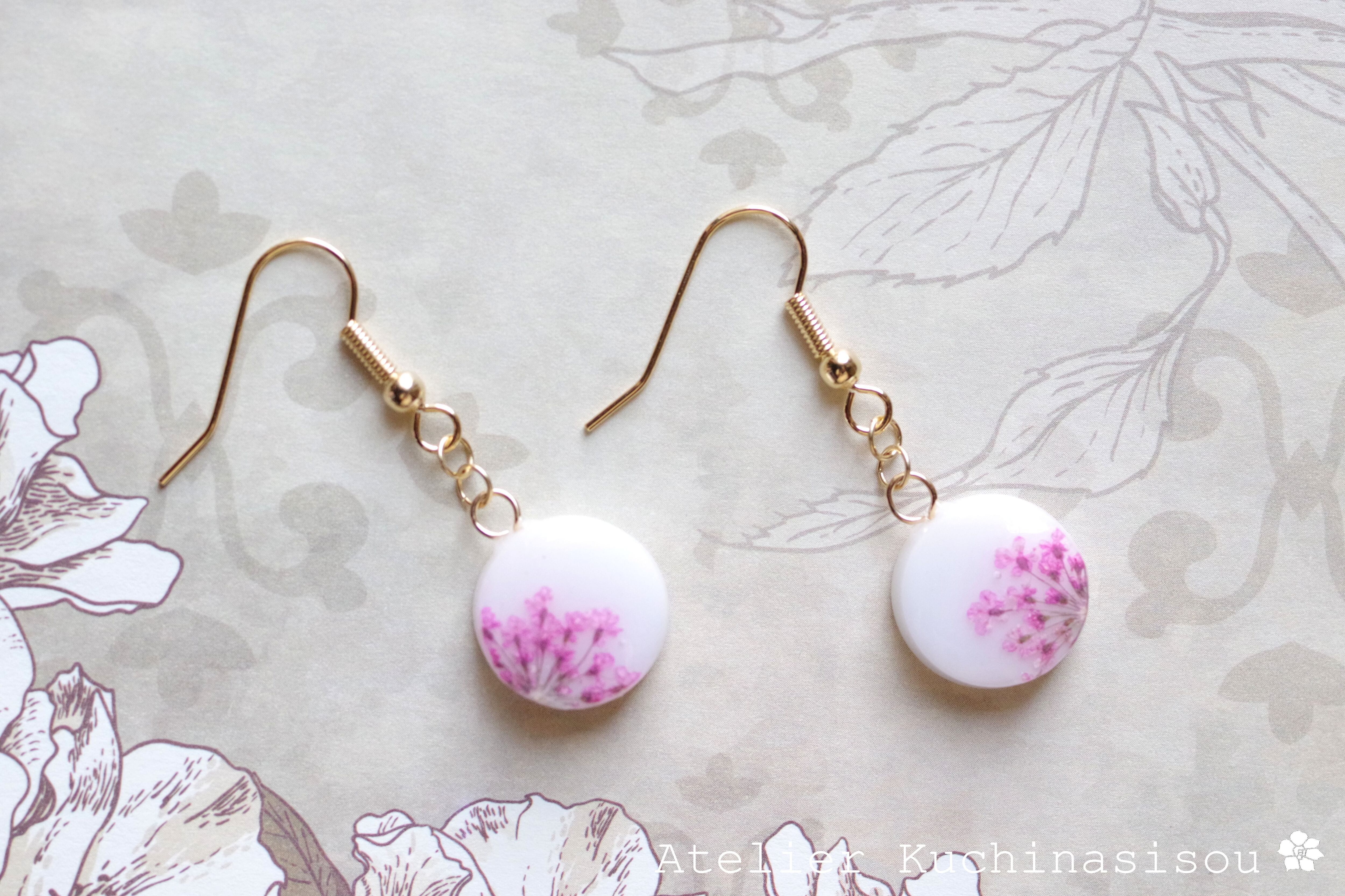 明るく可憐なピンクのレースフラワーを白いレジンにあしらった愛らしいピアス。