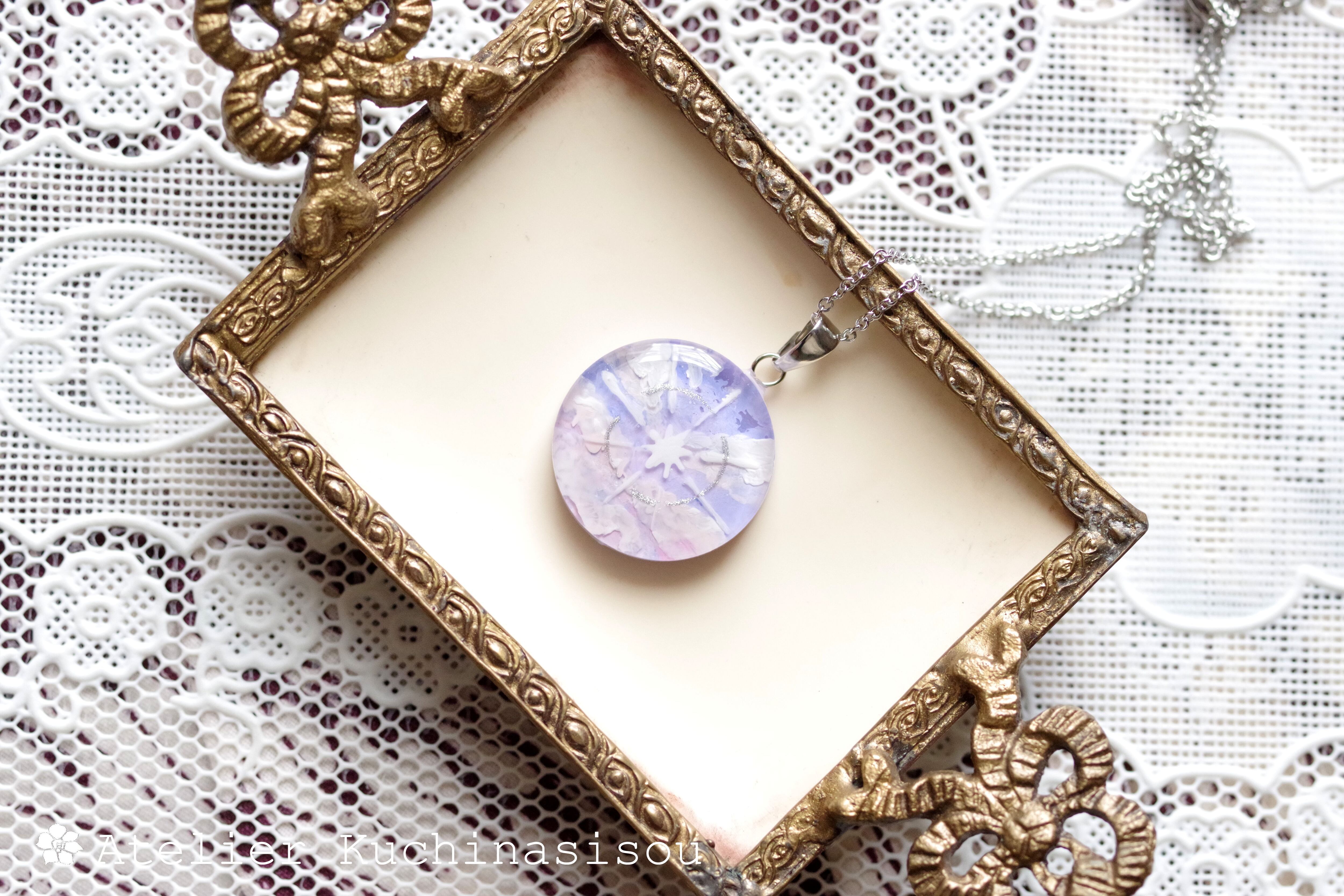 明け方の紫色の雲と昇る朝日の光線を描きこんだペンダント。