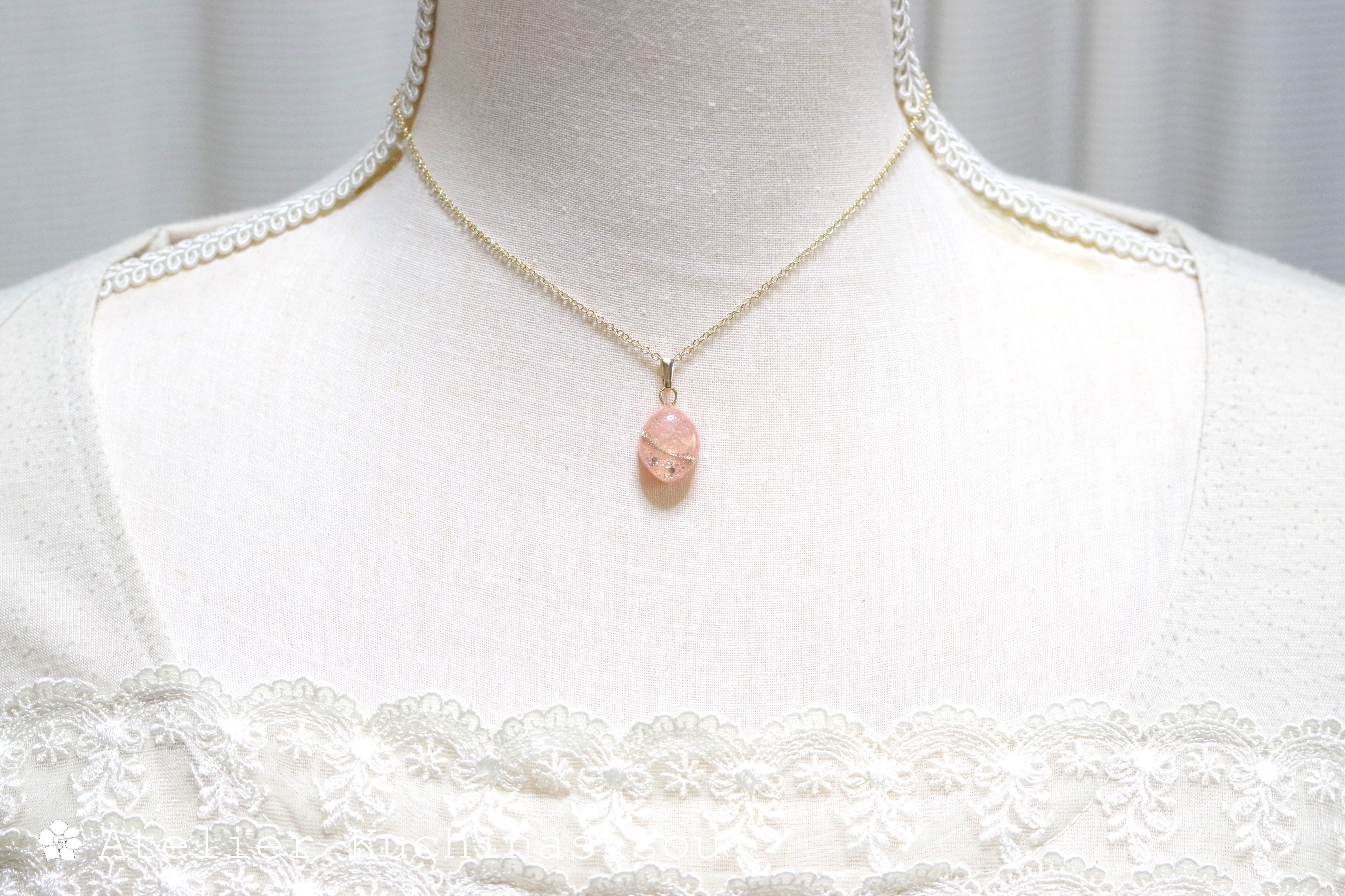 エレガントなローズピンクのマーキス型のレジンにゴールドの装飾を施したペンダント。