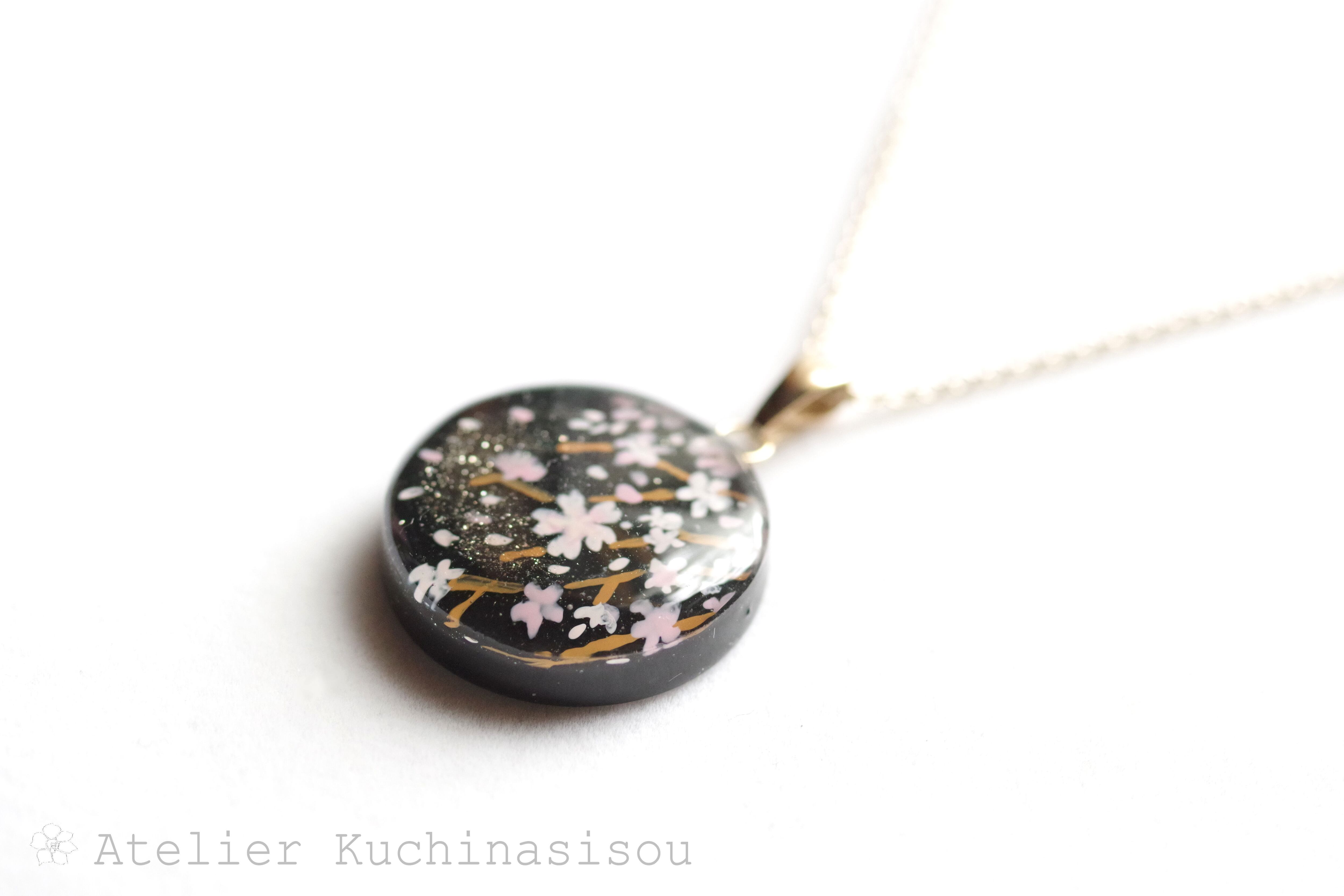 夜を思わせる黒い背景に枝垂れ桜を描きこんだ雅なペンダント。