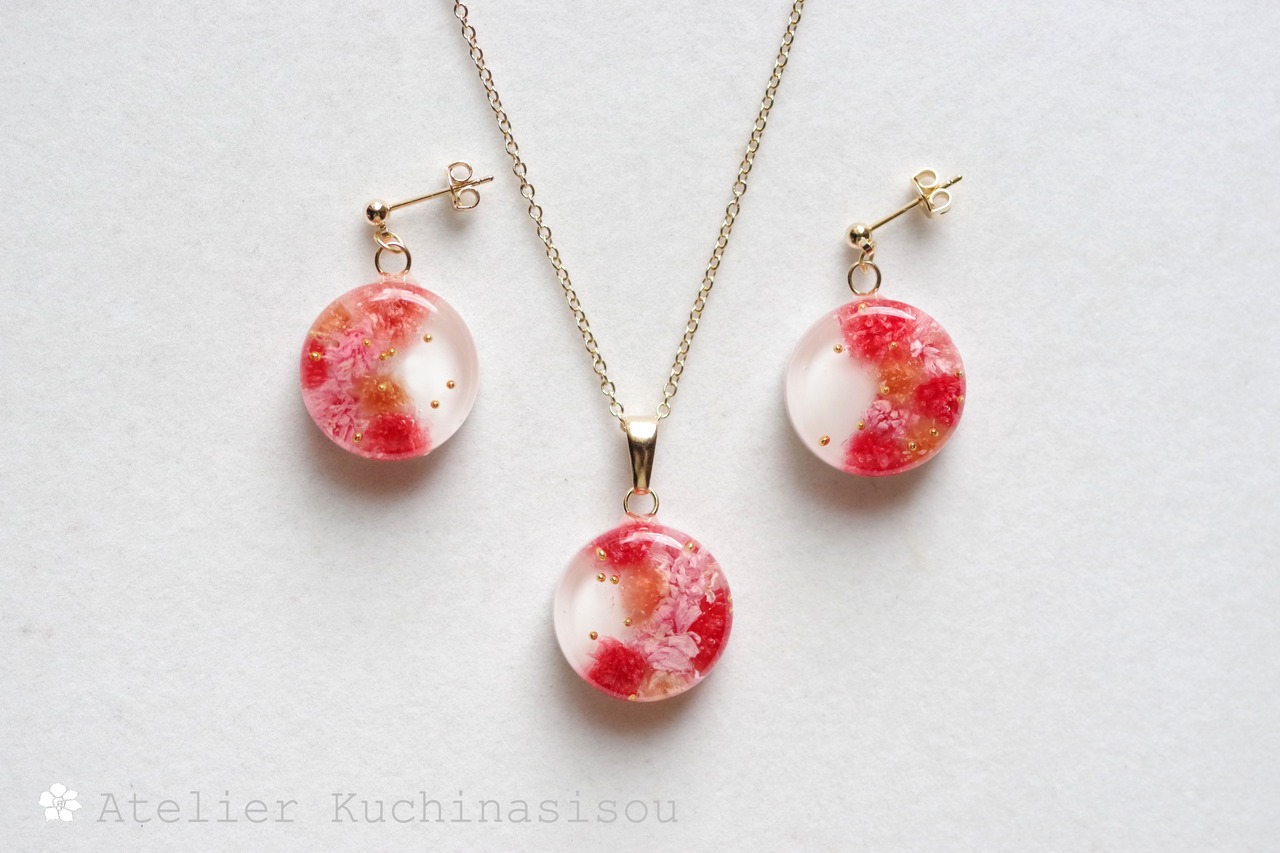 ピンクと赤のお花をぎゅっと詰め込んだブーケのような可憐なピアス。