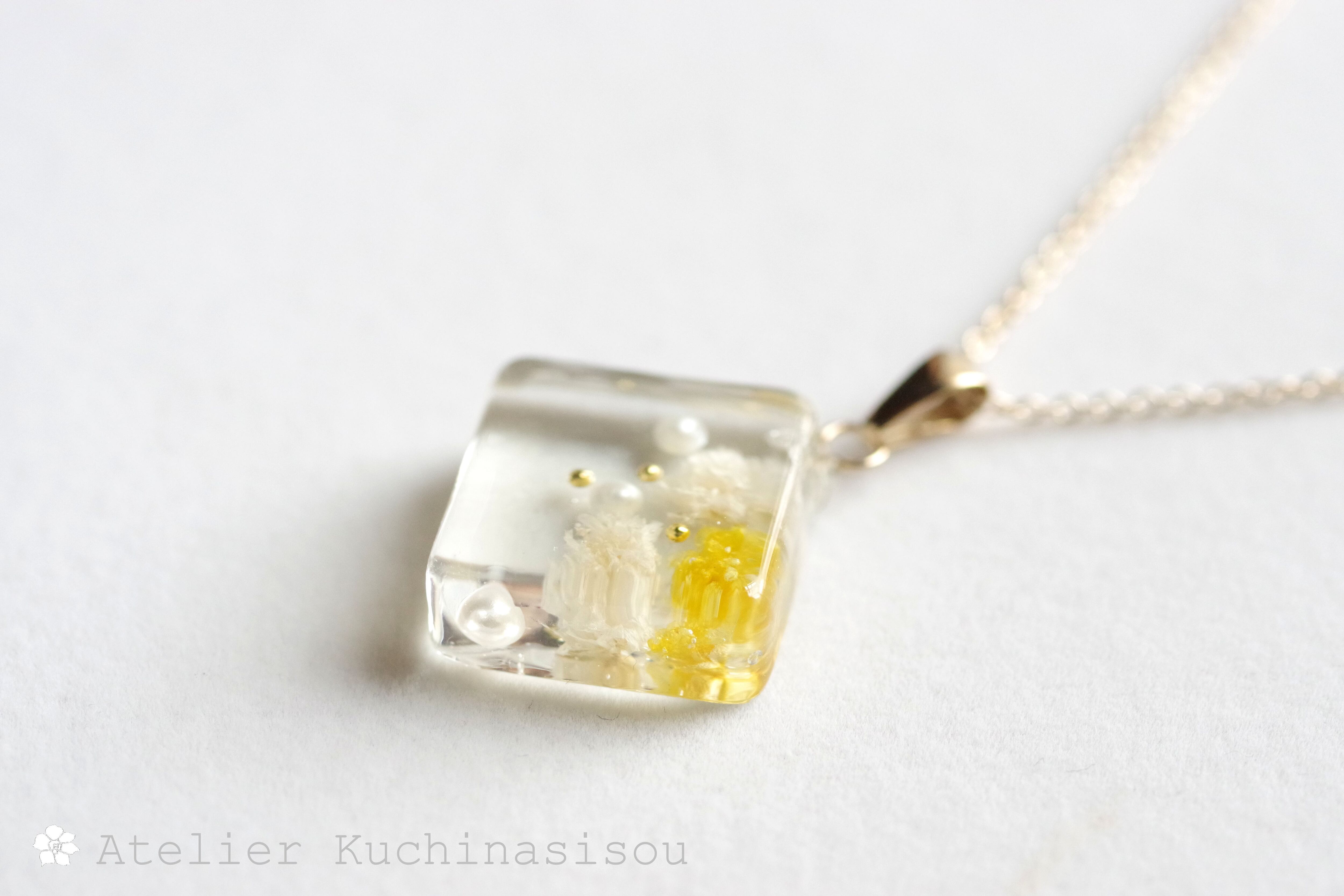 四角いレジンに黄色とオフホワイトのお花、パール、ブリオンを沈めたペンダント。
