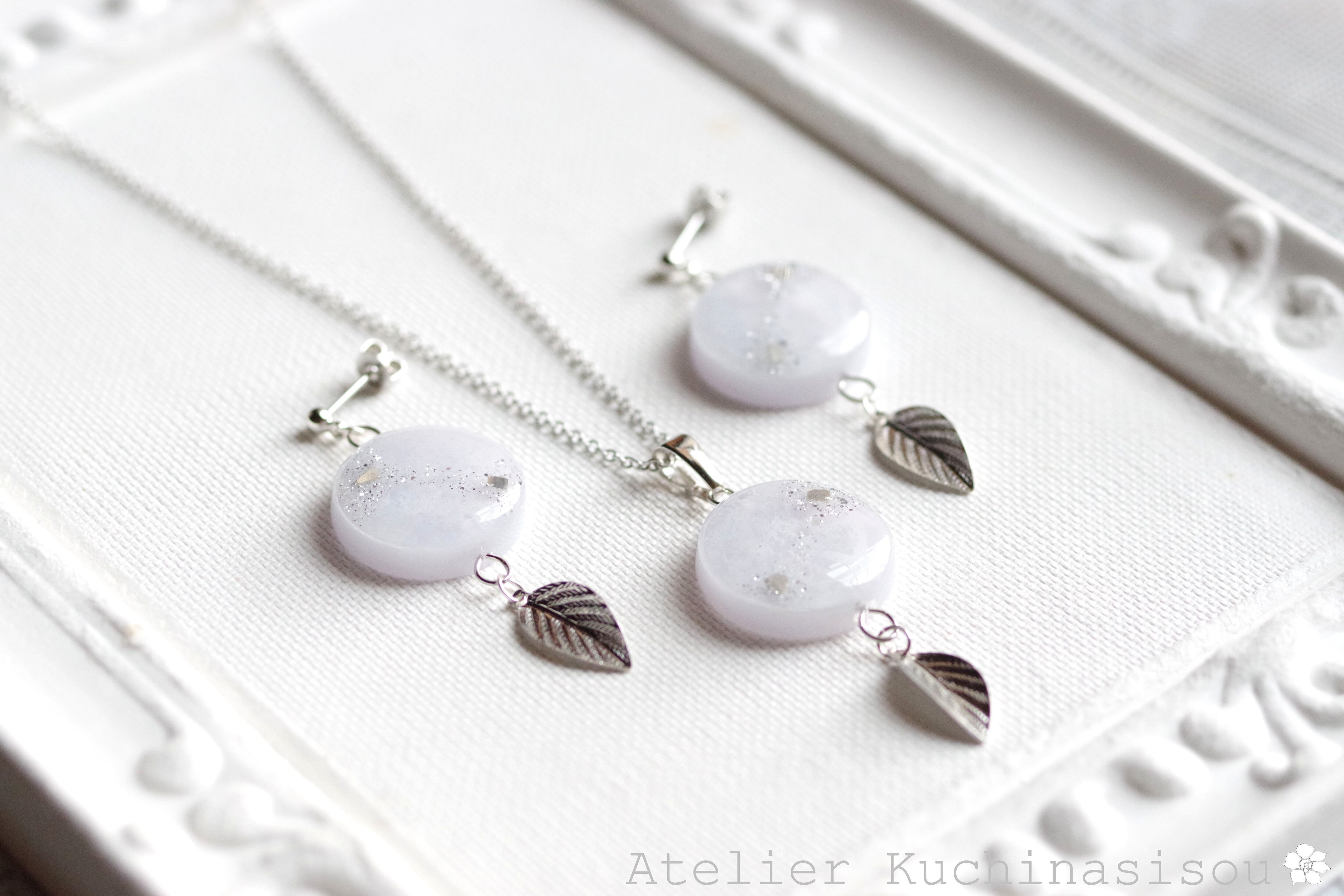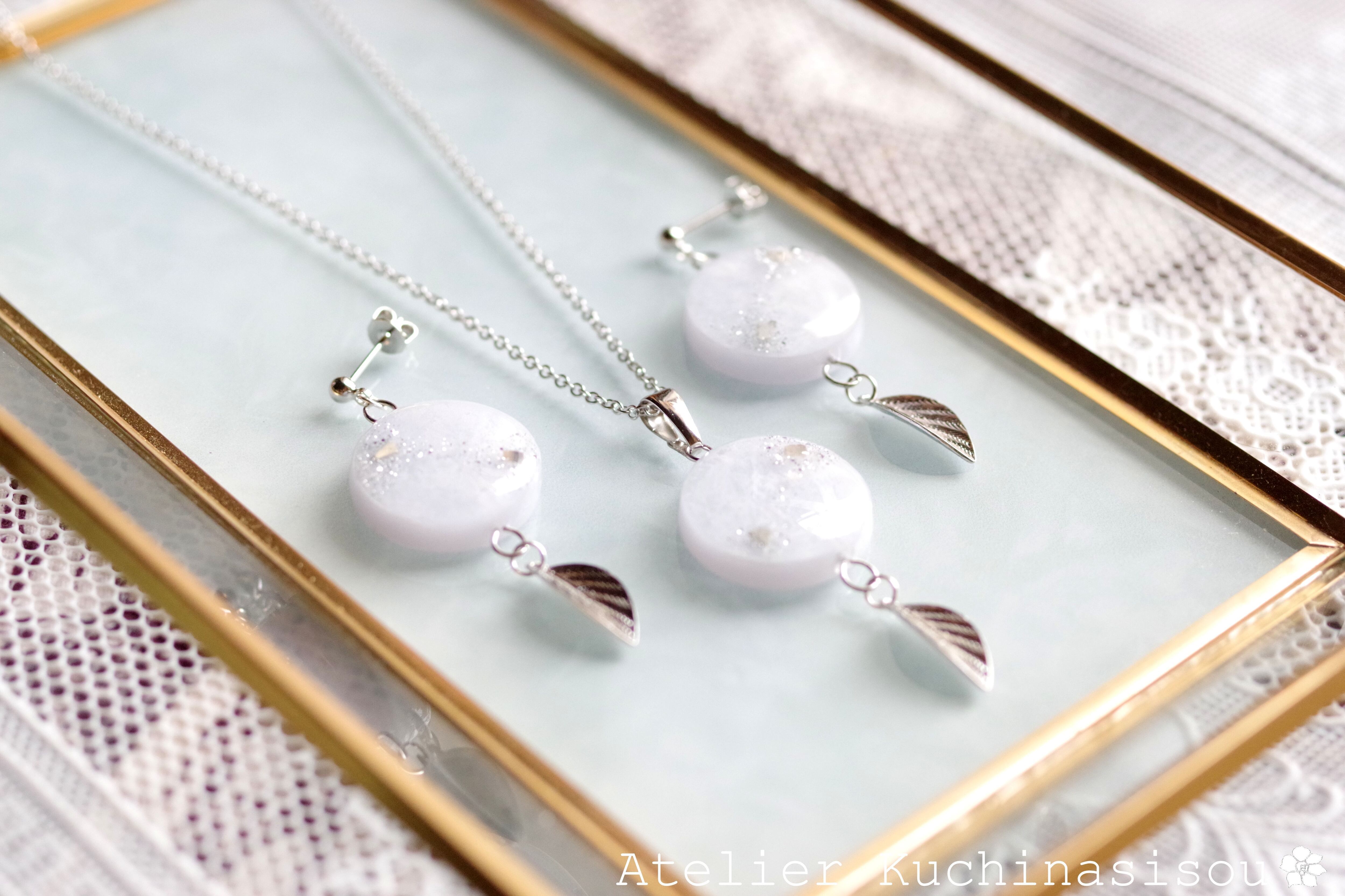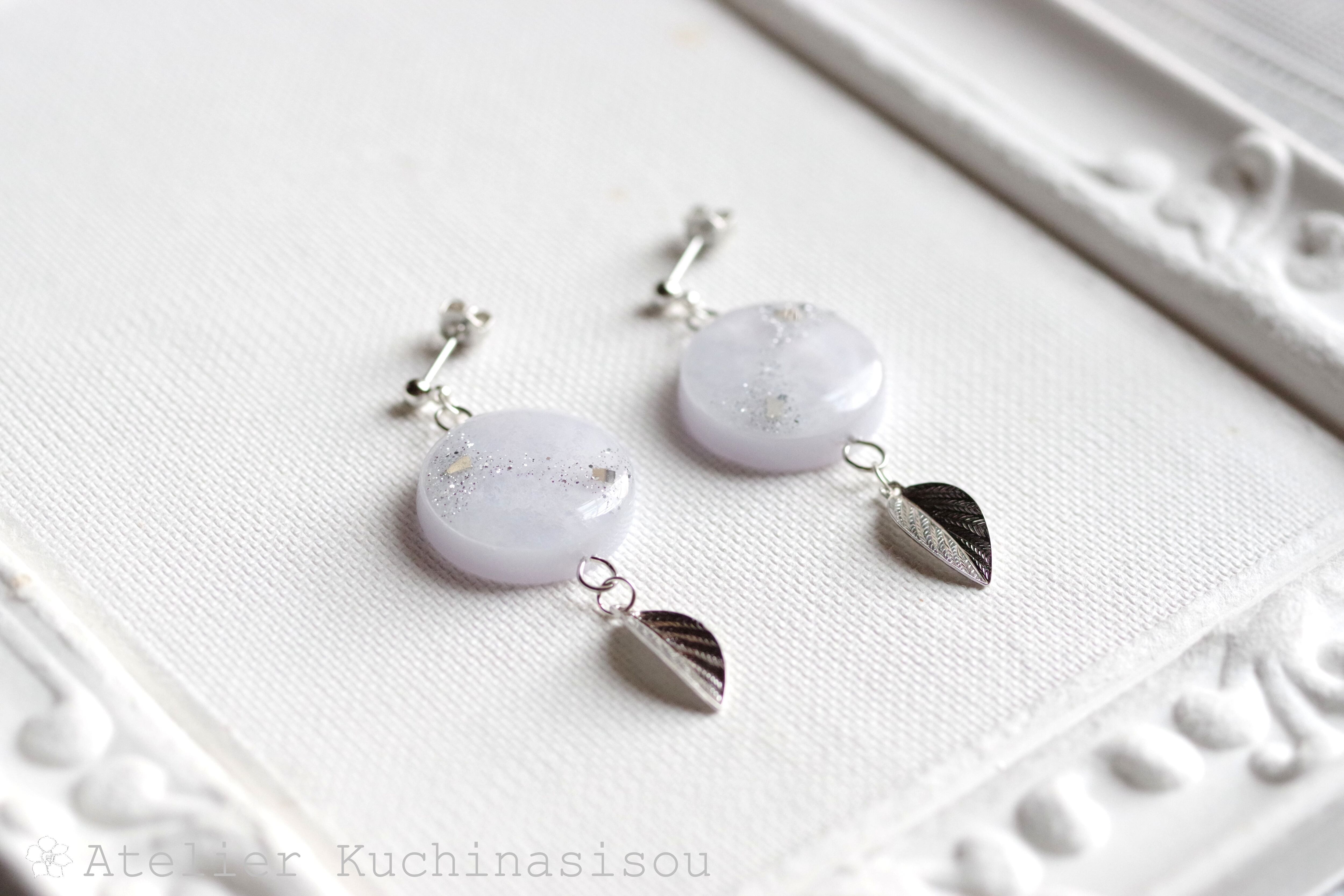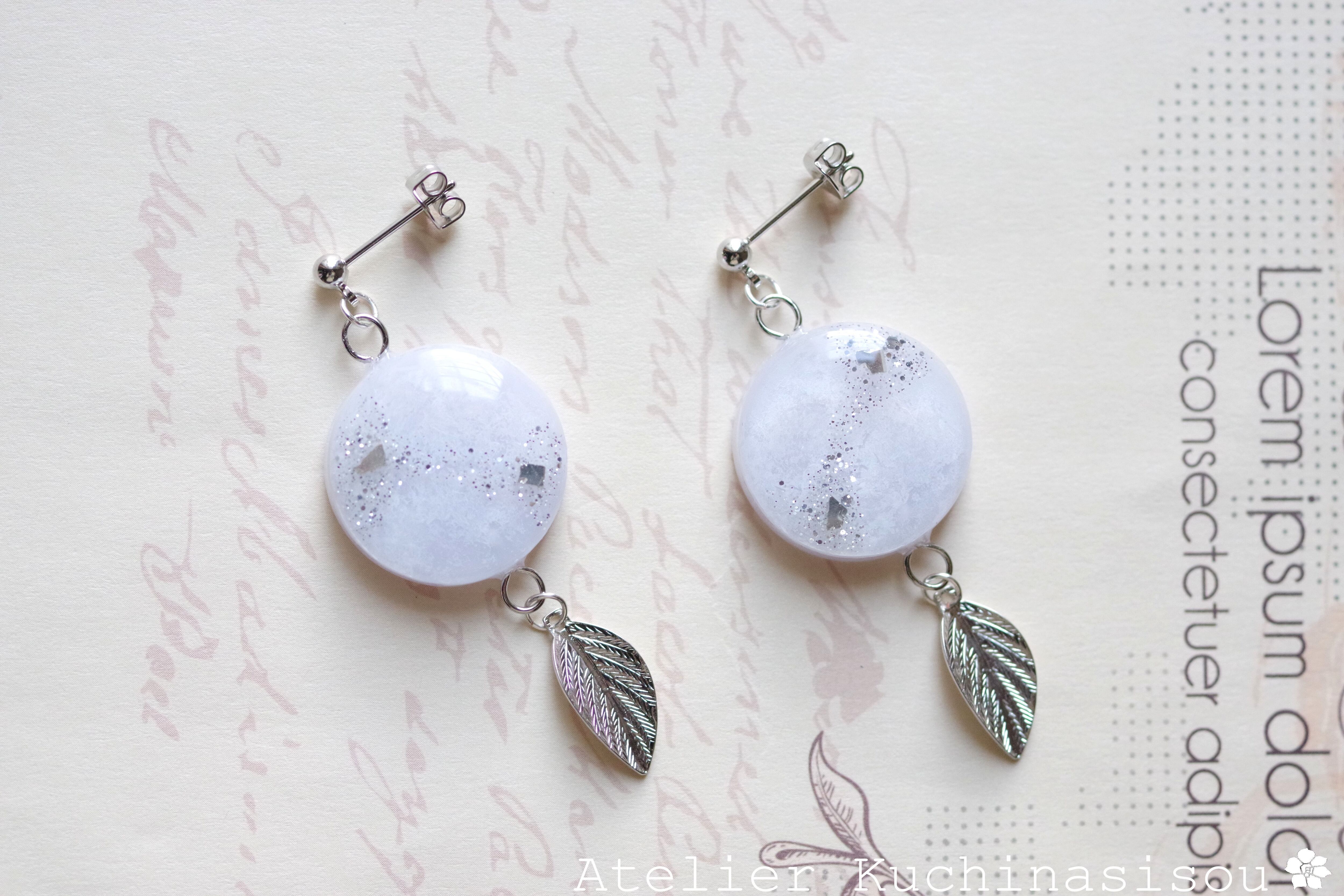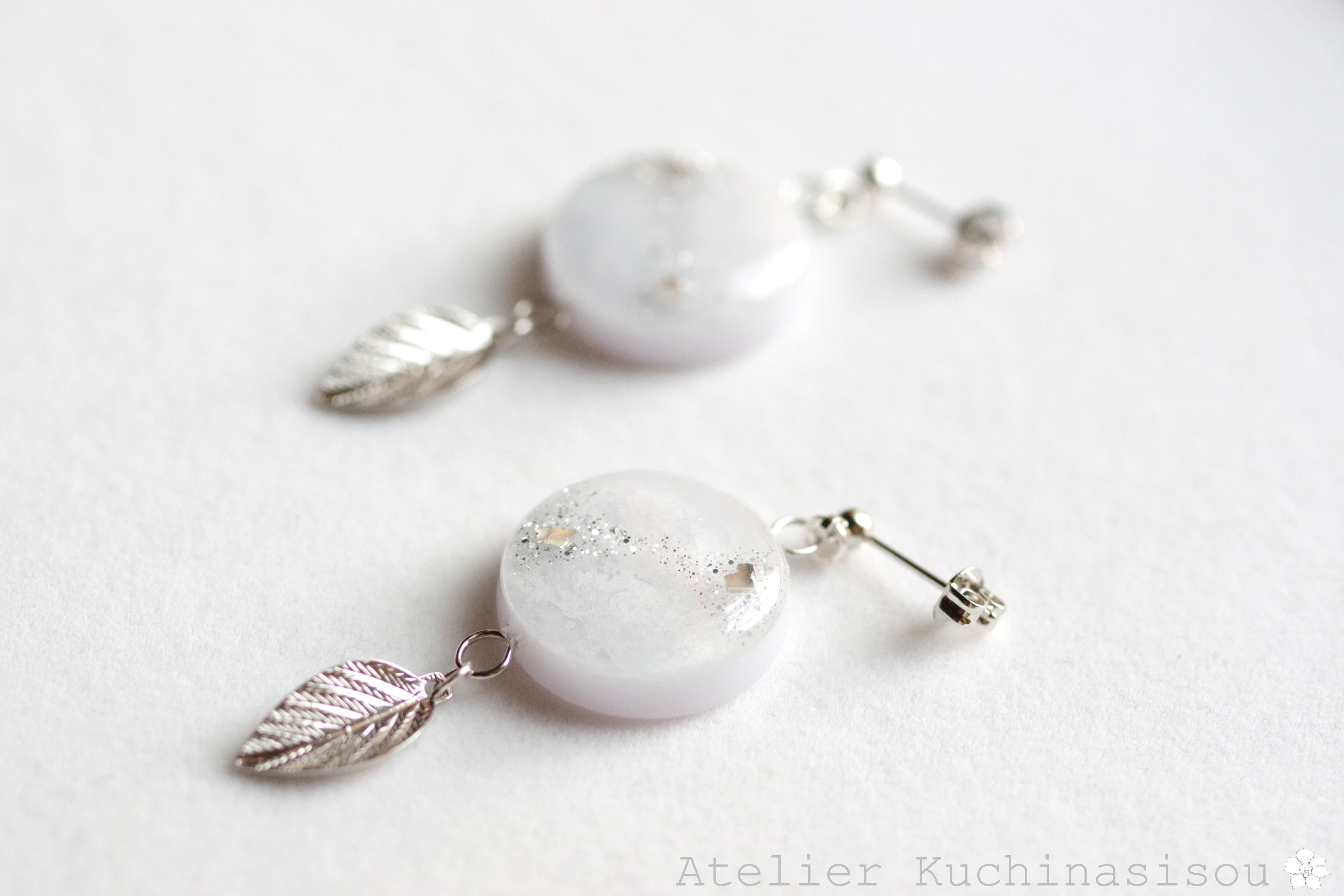 レジンアート ラウンドモチーフと葉っぱチャームのピアス〈在りし昔のことなれど〉