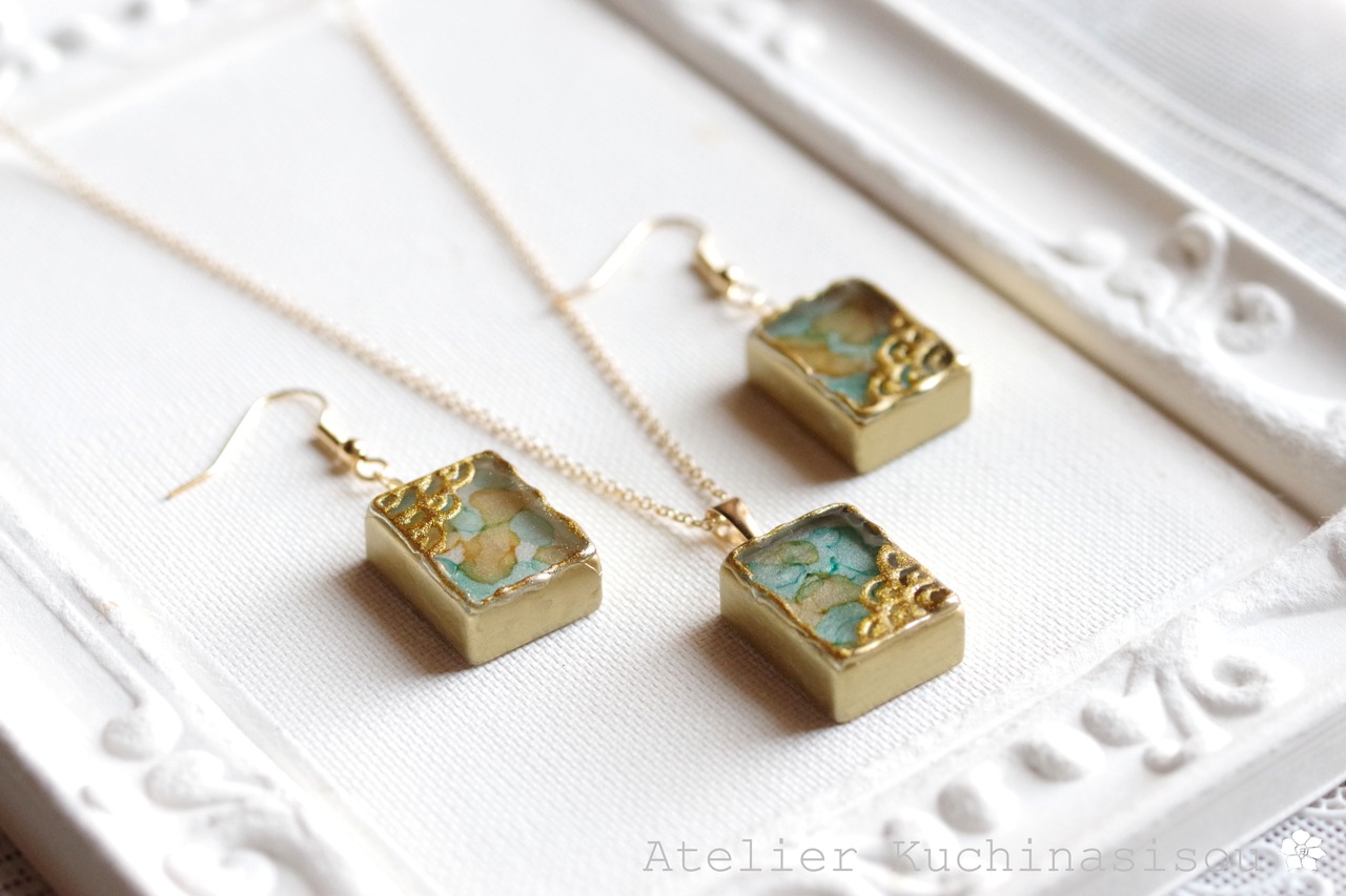 グリーンとブラウンが滲みあうレジンを金色で縁取り、青海波模様を描いた、小さな玉手箱のようなピアス。