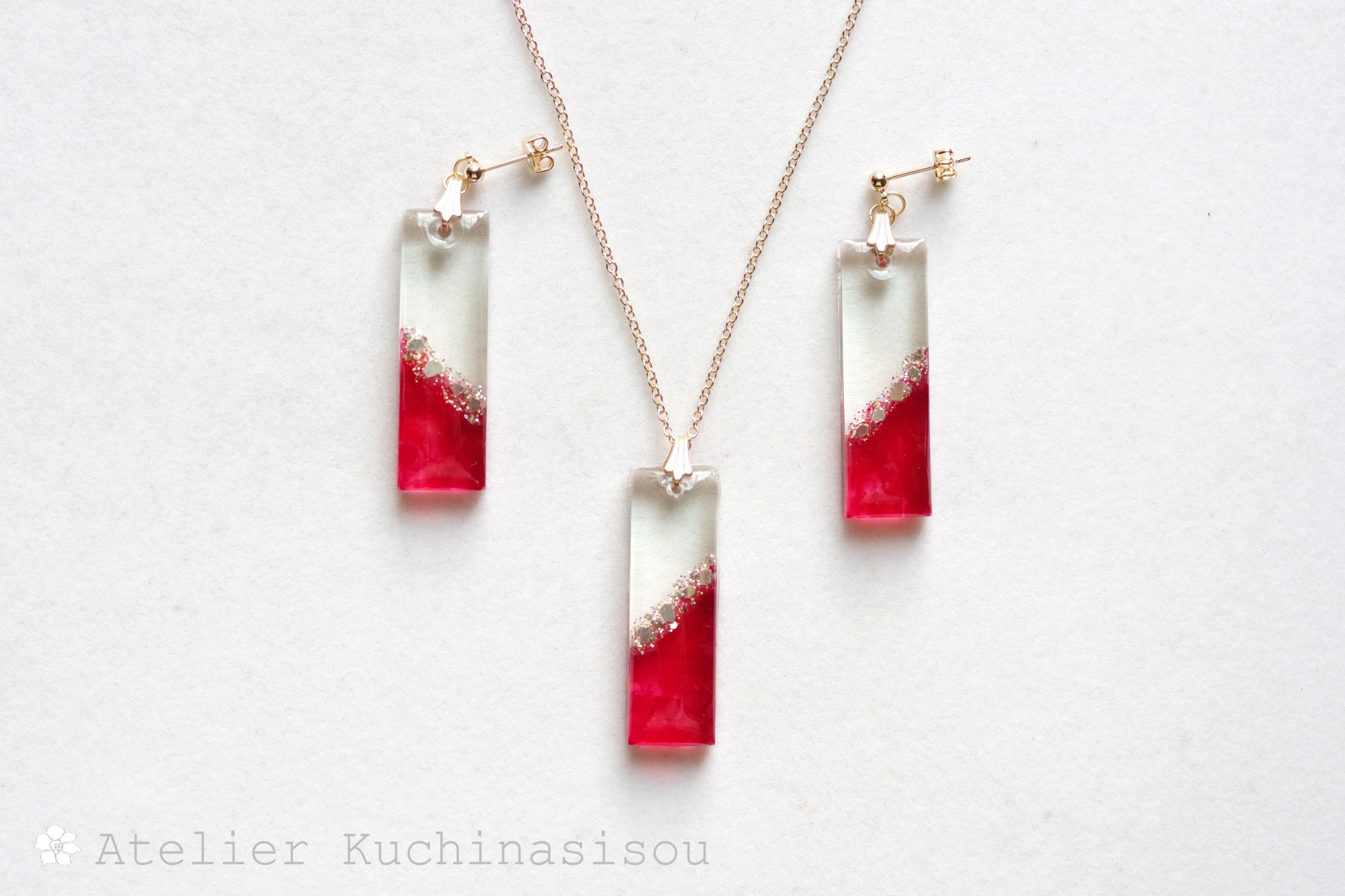 長方形のレジンを数種類の赤とピンクで染めたペンダント。