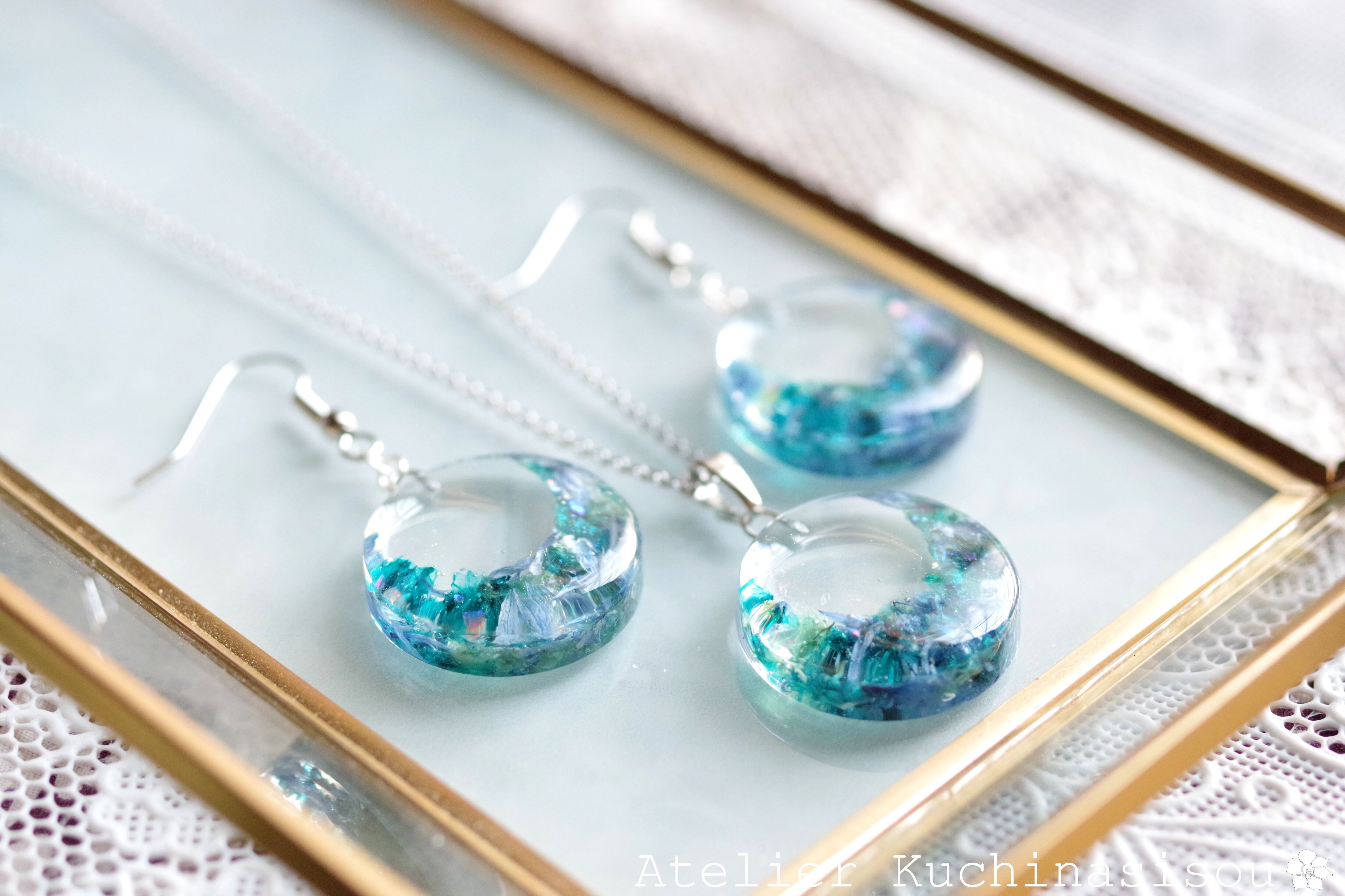 青いお花の花びらを敷き詰め、ブルーのラメを乗せたピアス。