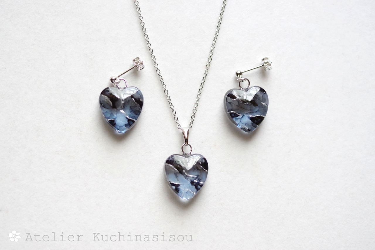 滲みあう黒とグレー、そしてシルバーのラインが優雅でシックなハートのペンダント。