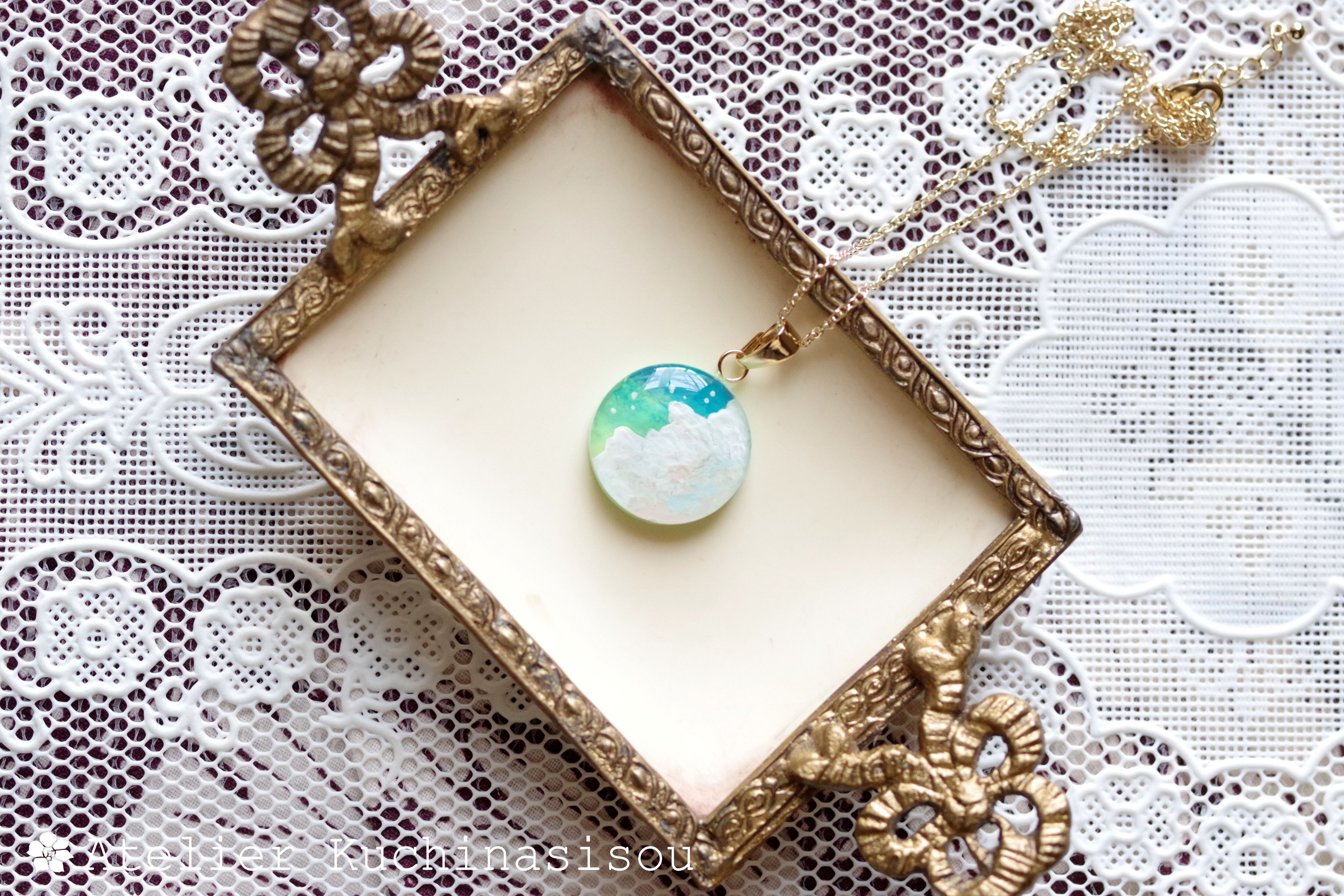 鮮やかな空に降る雨粒と雲が情緒のある可憐なペンダント。