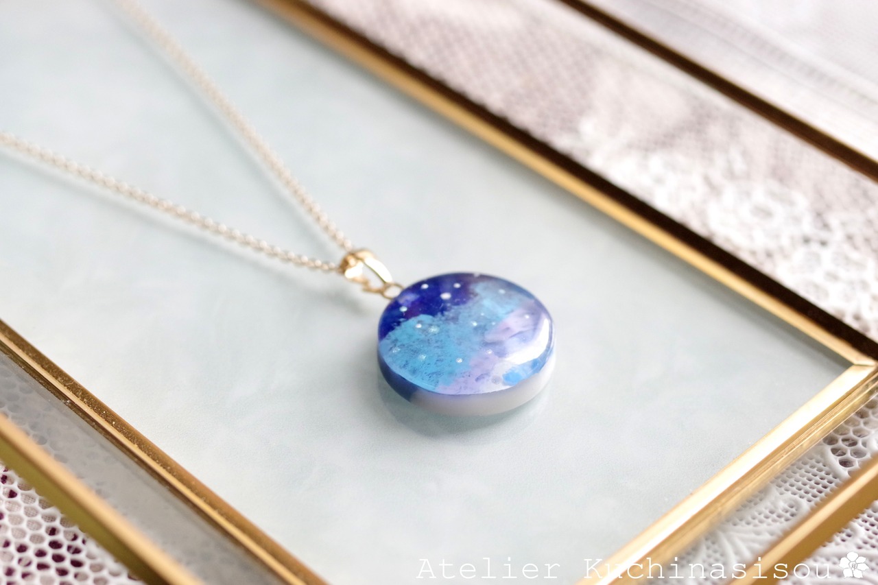 夜空に雨雲が広がり、降っている雨の白い粒が華やかなアクセントになっている梅雨にぴったりのアクセサリーです。