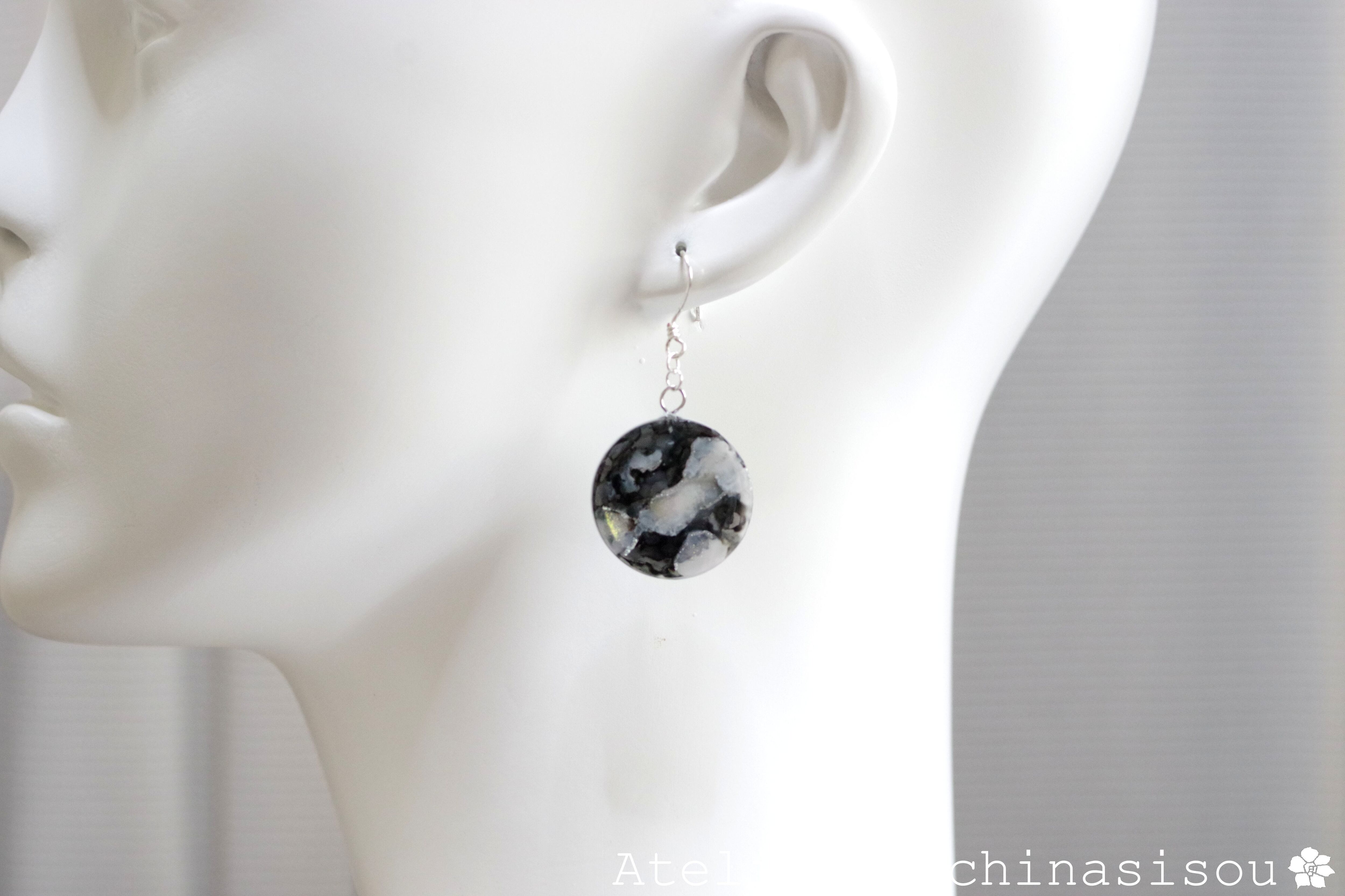 黒と白の二色が織りなす、モノトーンの、月面の模様を思わせるデザインがクールでマニッシュなピアス。