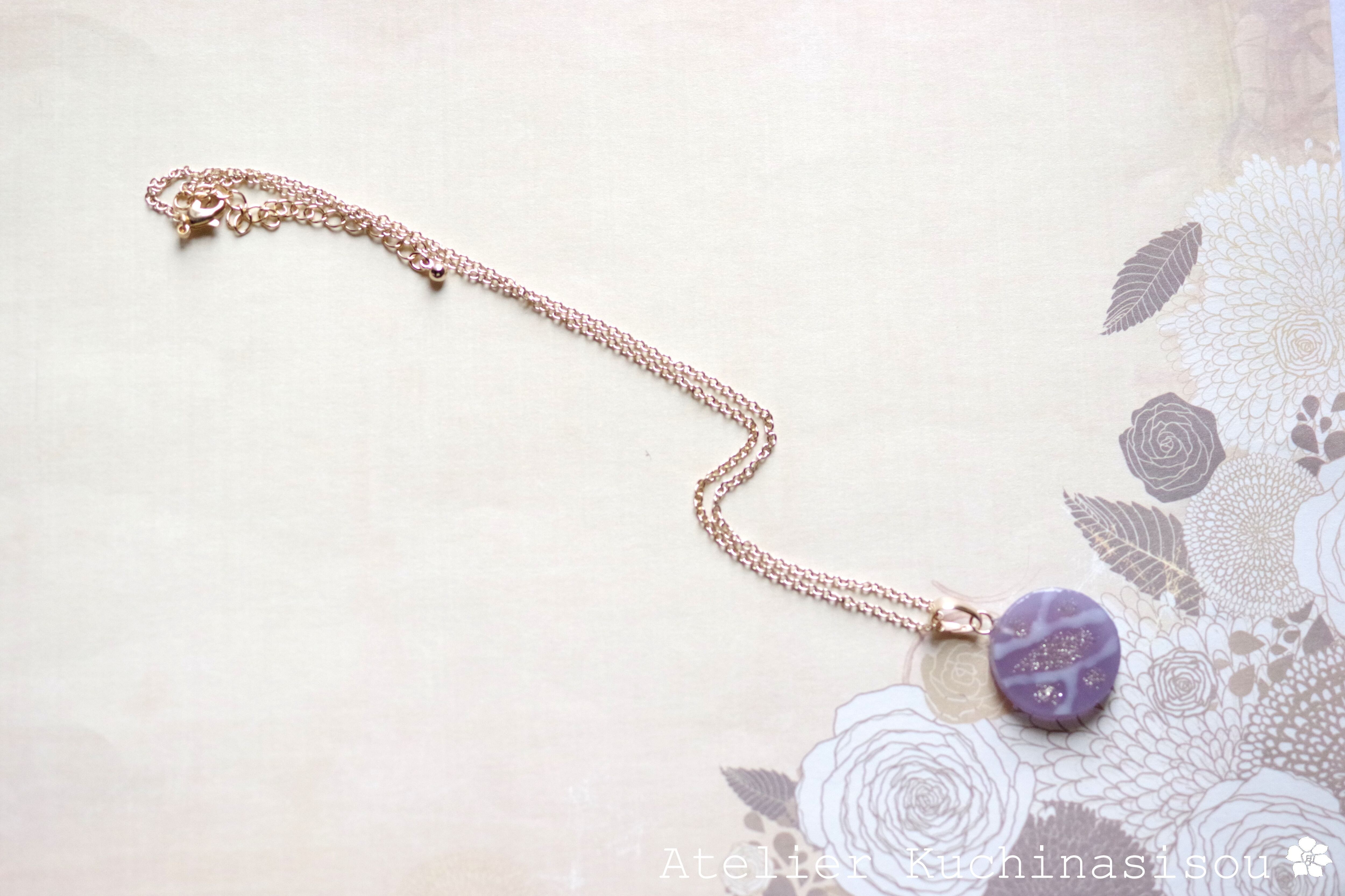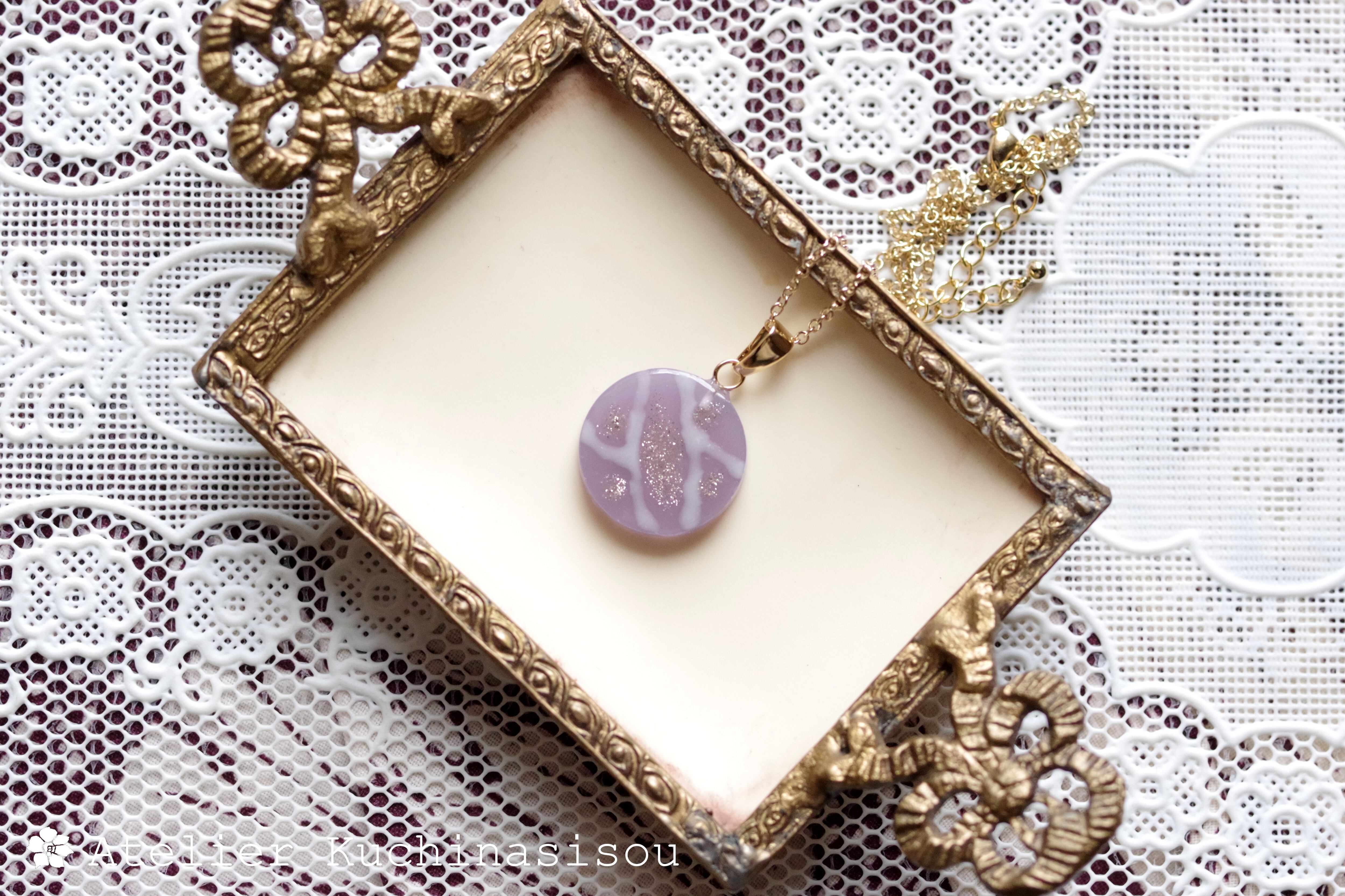 半透明の紫にラメを乗せ、水面のような模様を描いた、優しく淑やかなペンダント。