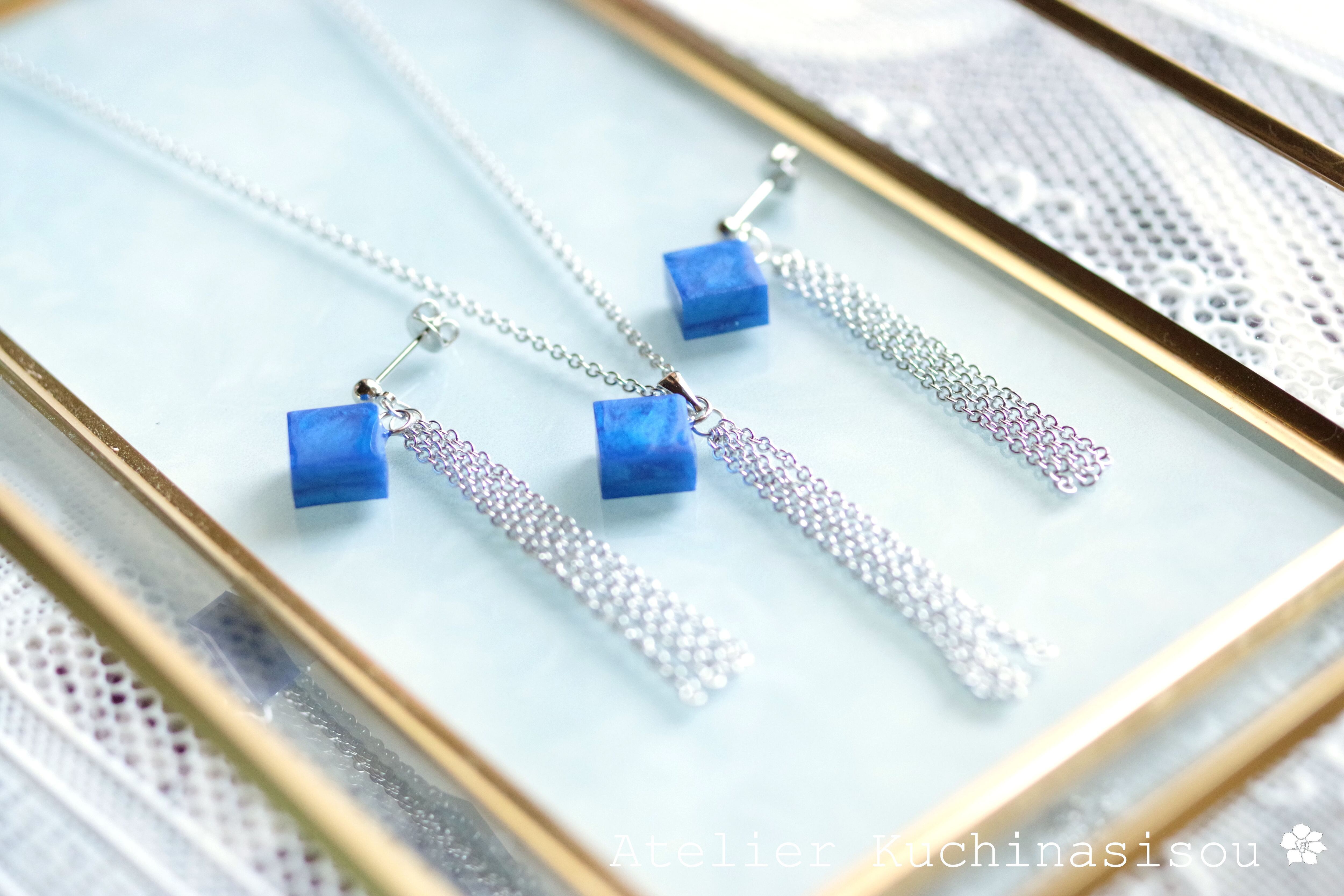 光沢のあるコバルトブルーのキューブとシルバーのフリンジが耳元で揺れる様子が可憐なピアス。
