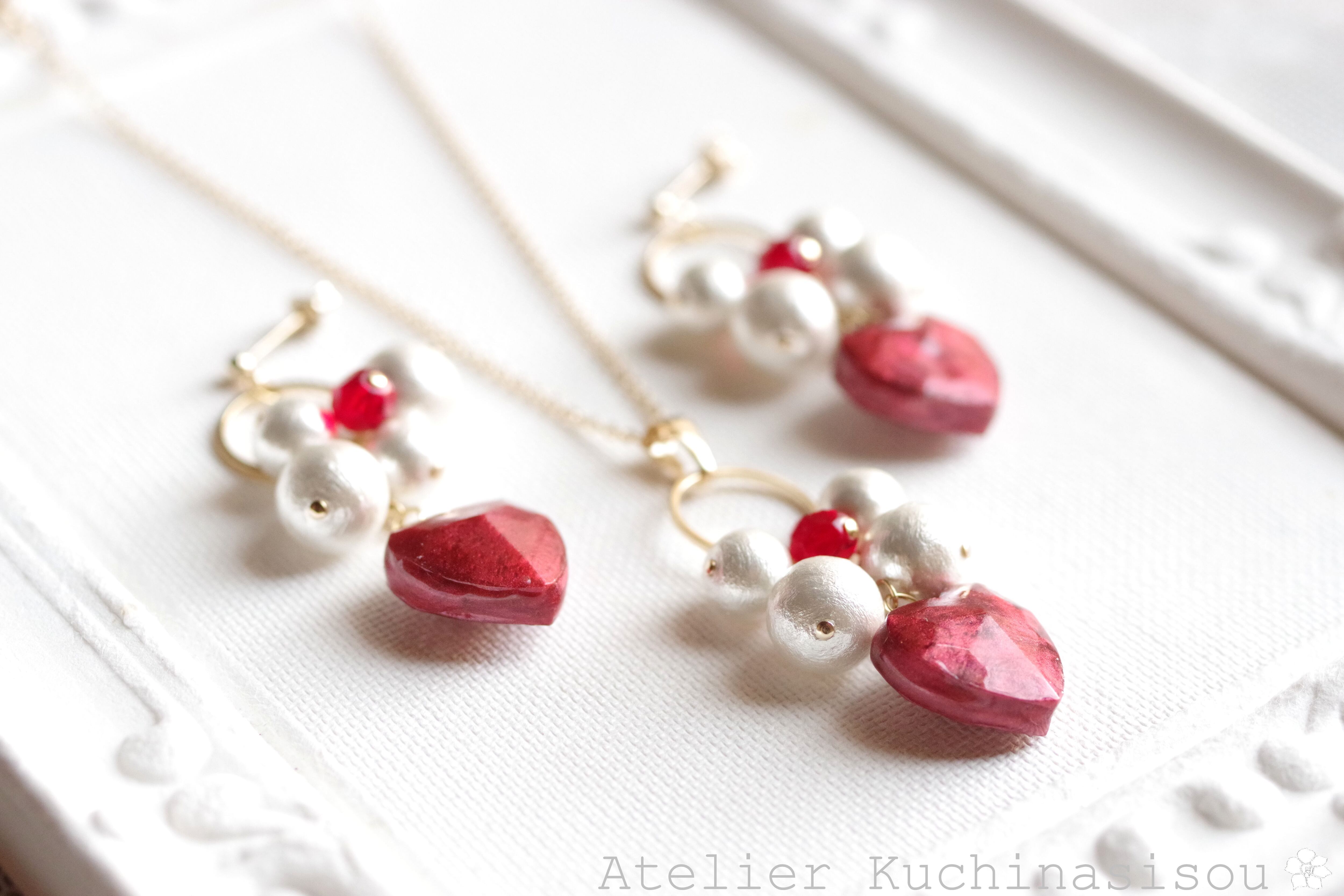 コットンパールの中で一つだけ色の違う赤色のチェコビーズがきらめく様が可憐なアクセントになっています。
