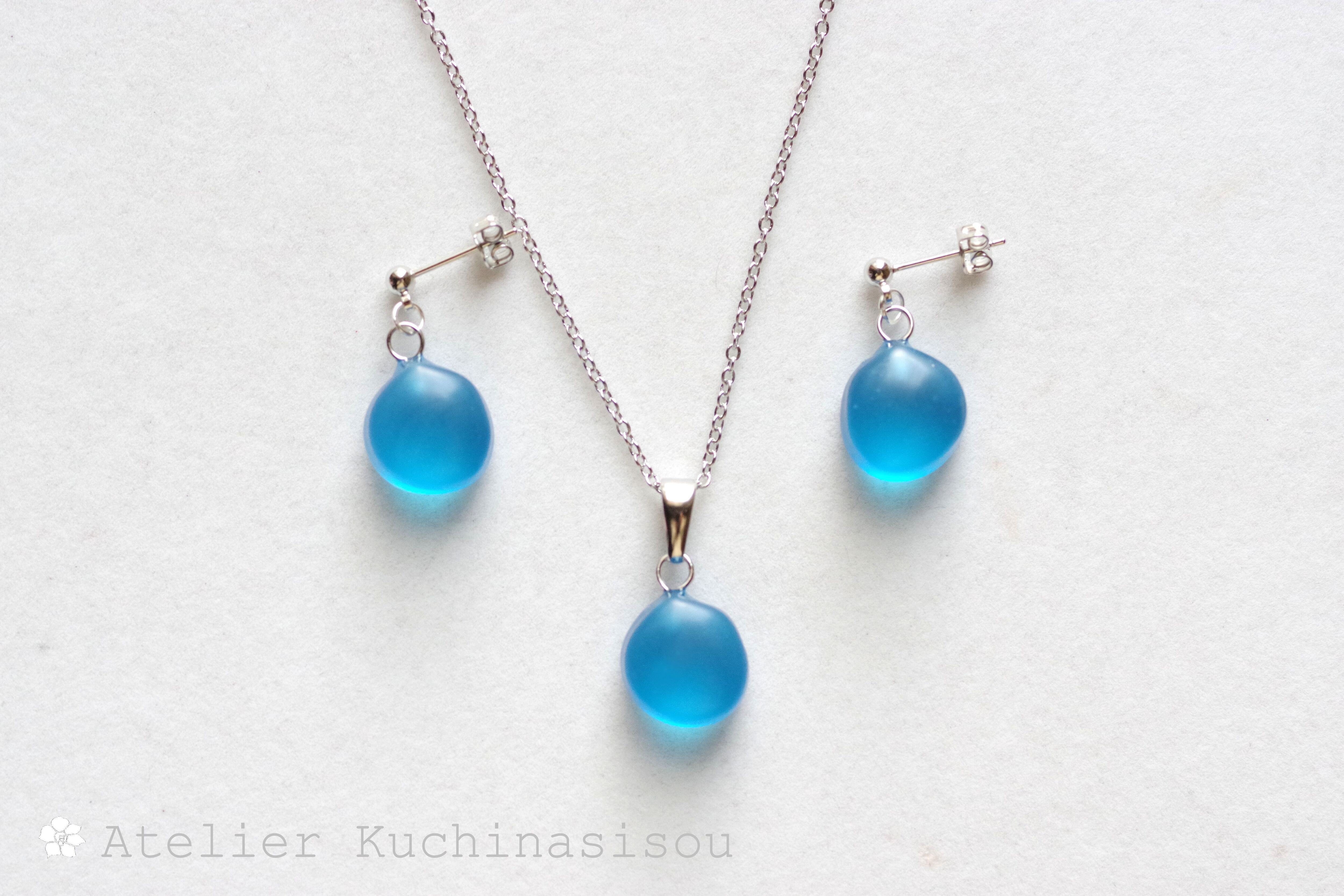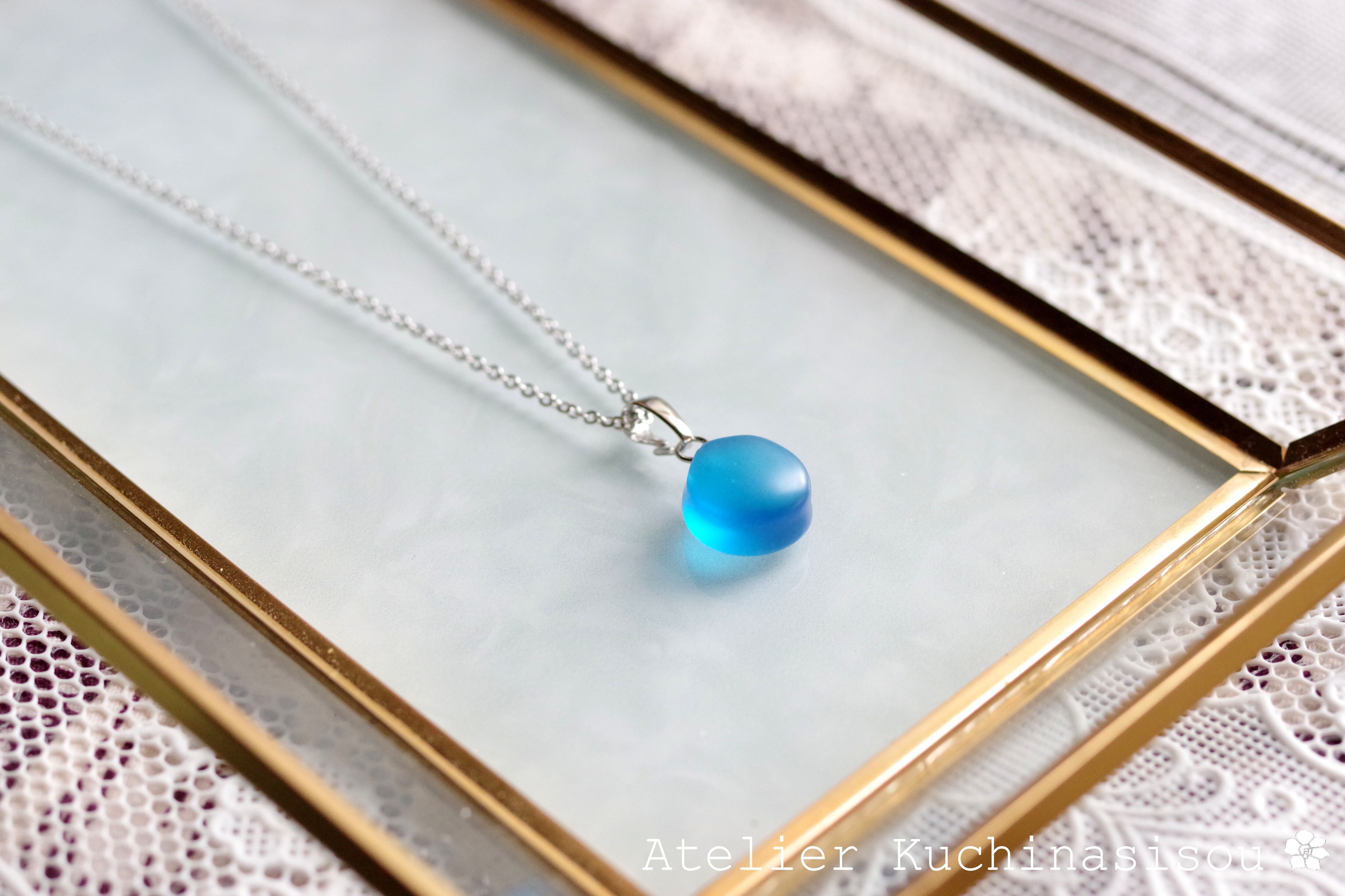 すりガラスのような柔らかな青色の風合いと、ほのかな透明感が美しいペンダント。