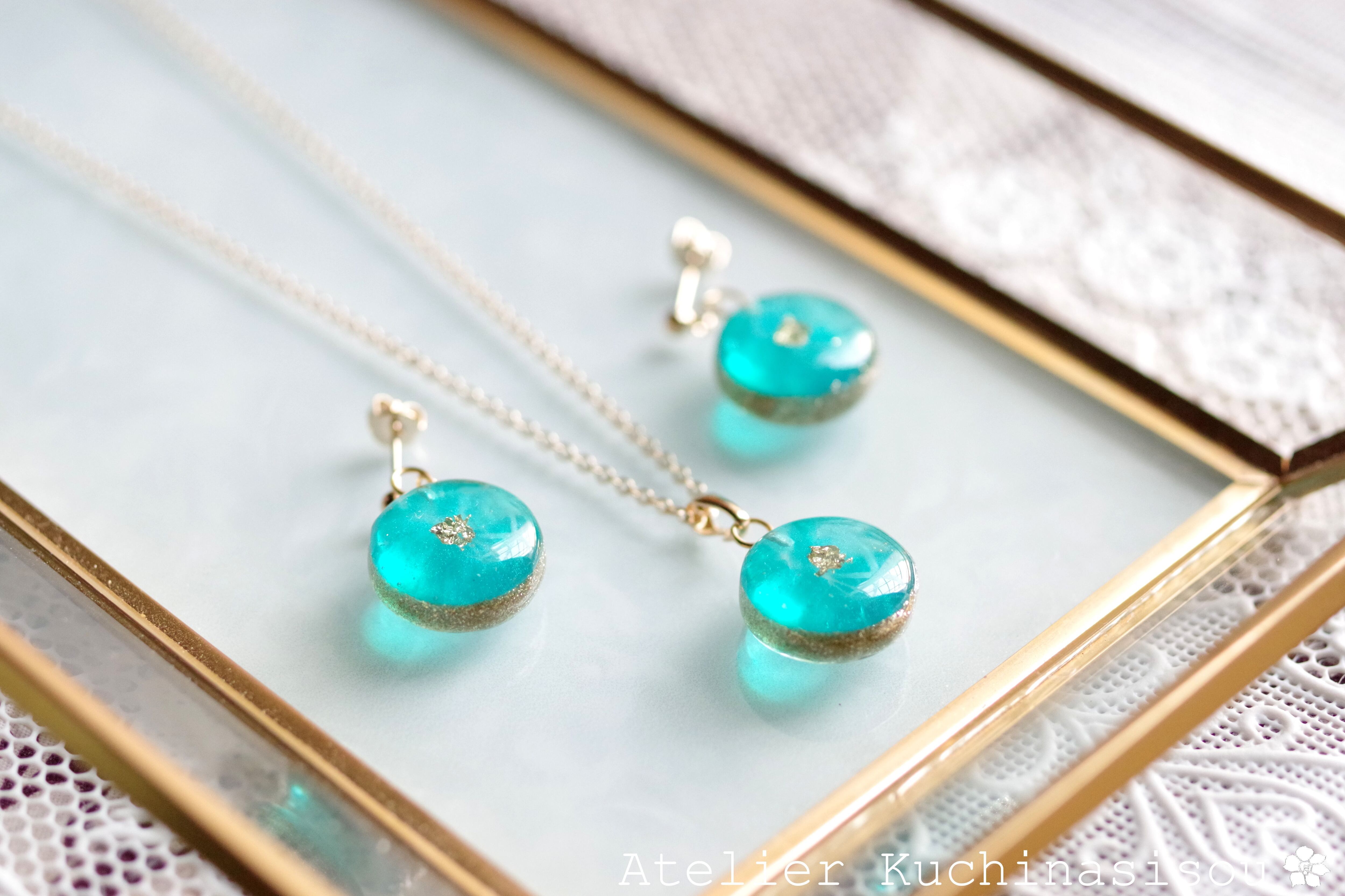 鮮やかな緑色のレジンを円形に固めて、側面にゴールドをあしらった上品なペンダント。