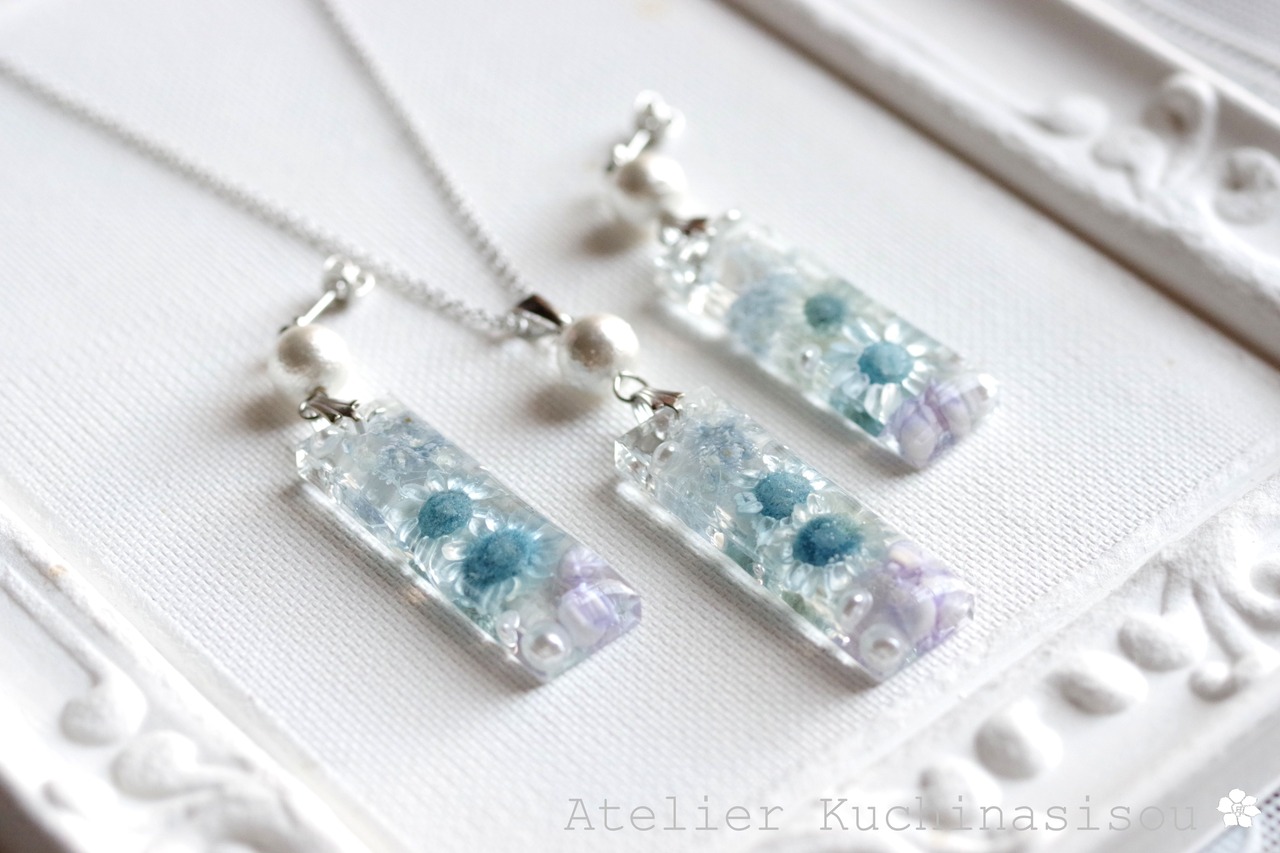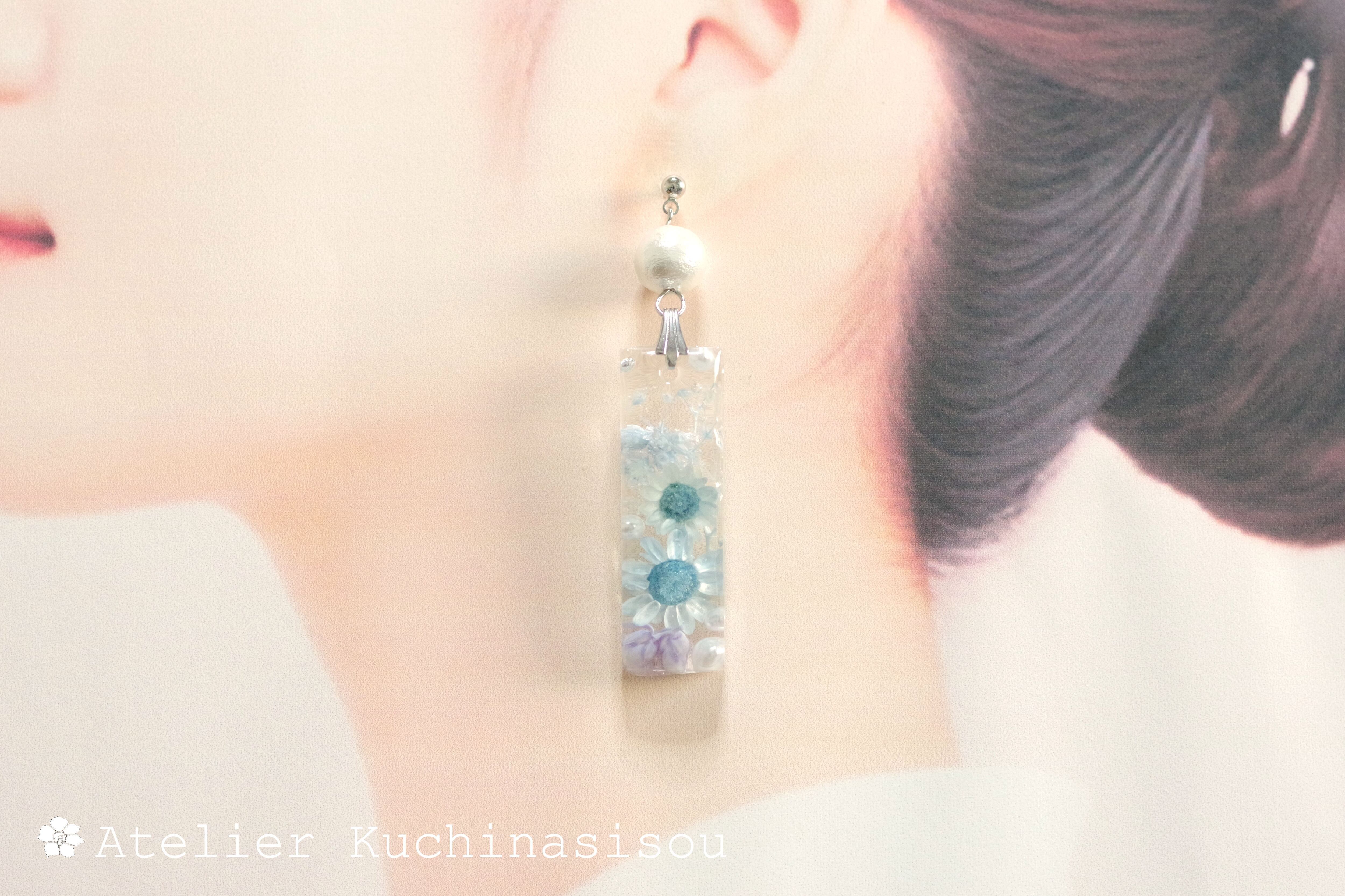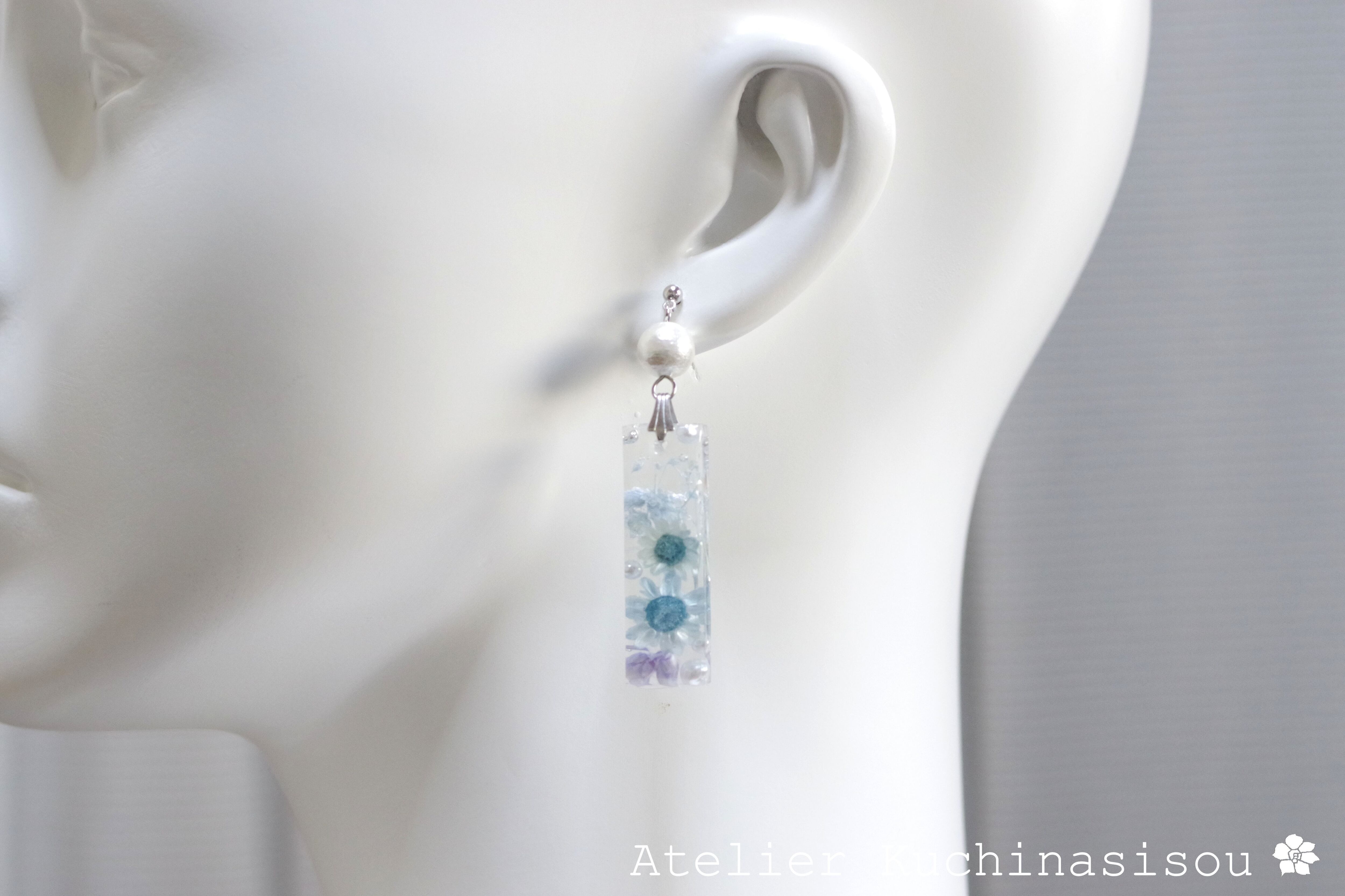 長方形のレジンに青いお花二輪とつぼみ、葉を入れ、パールやブリオンを添えたシンプルながらも華やかなピアス。