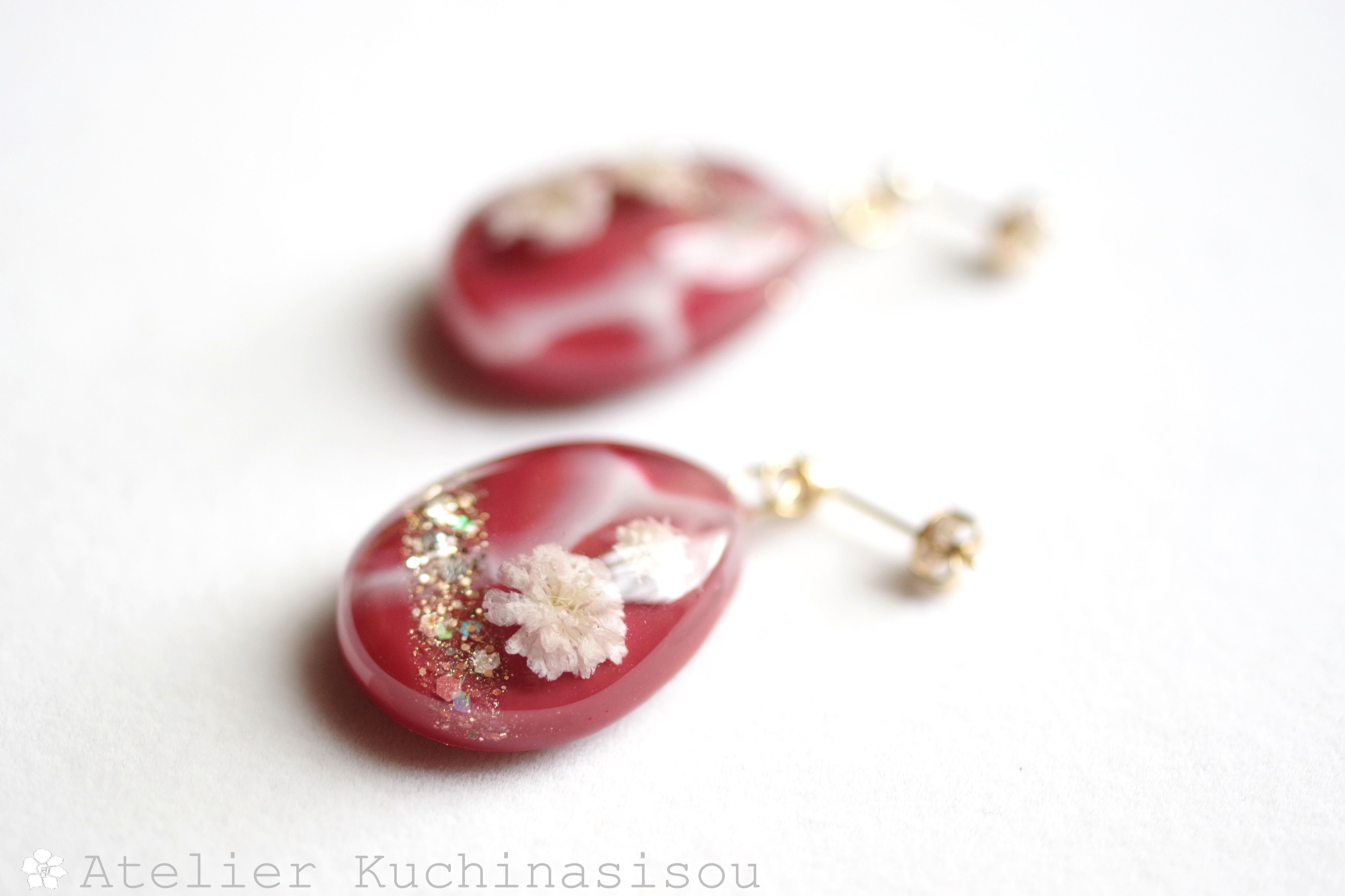 ドロップ型のレジンにお花を二輪咲かせた可憐で大人っぽいピアスです。