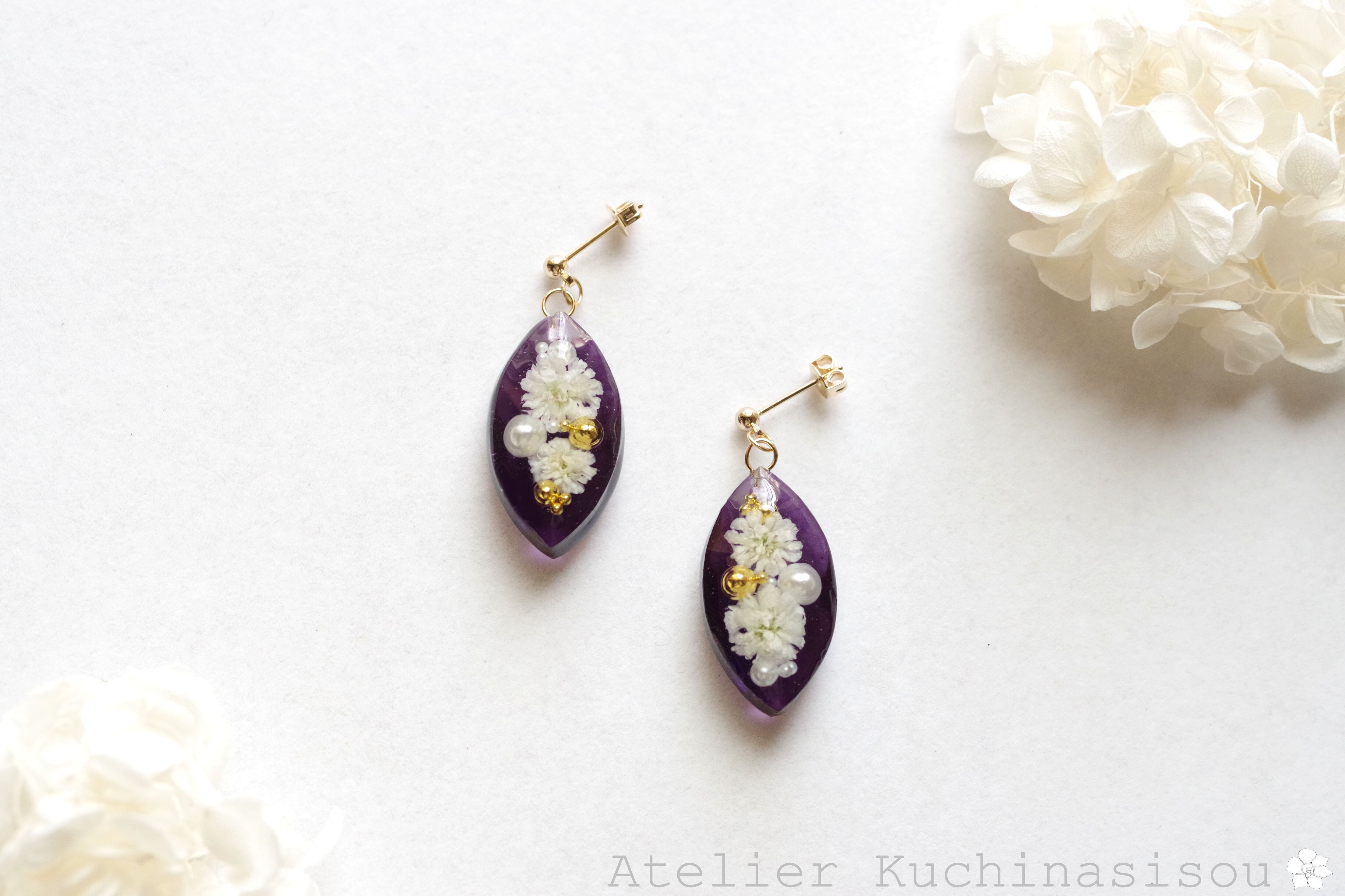 淑やかで落ち着いた紫色の背景にお花とパール、ブリオンをあしらった可憐なピアス。