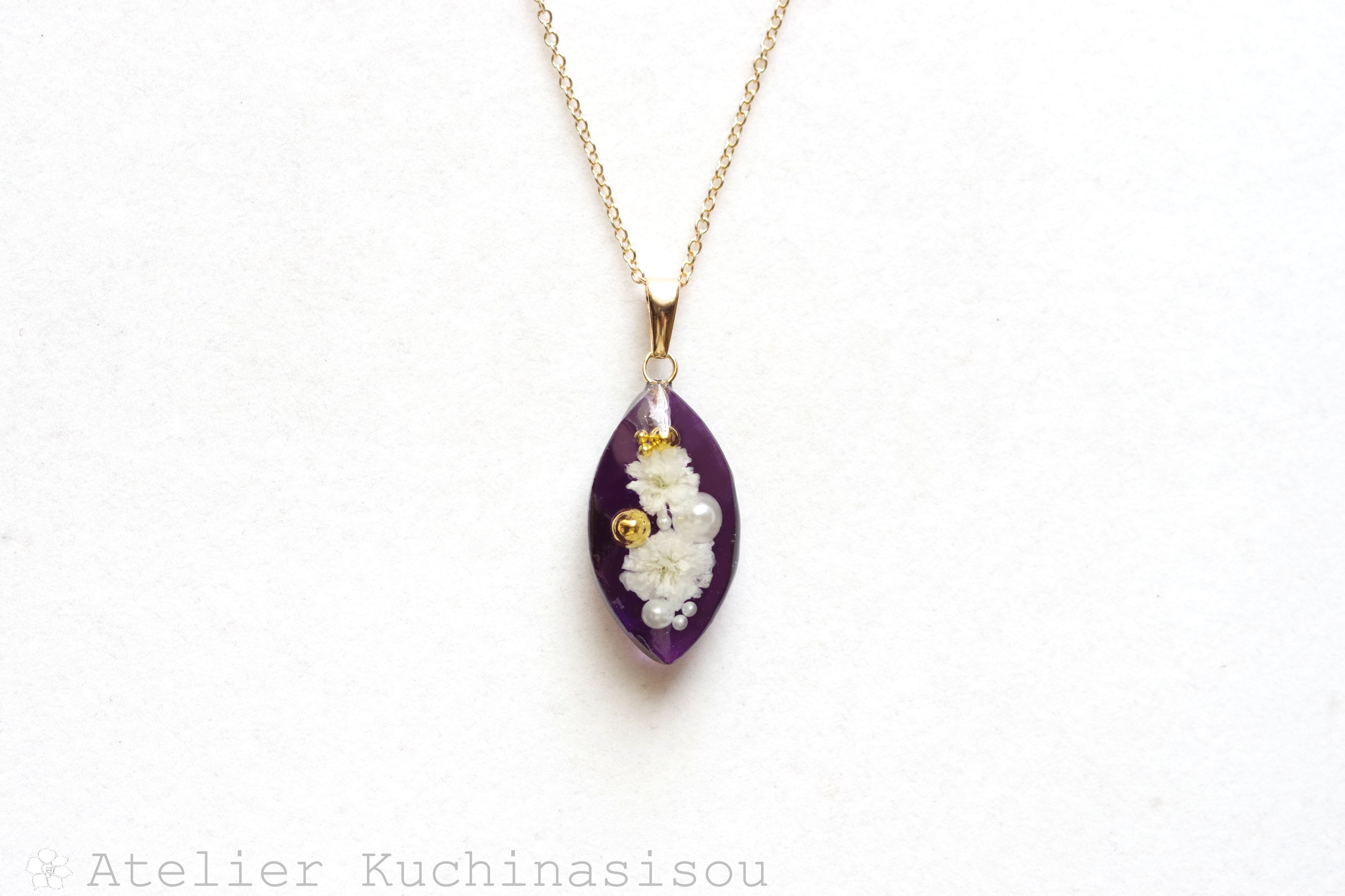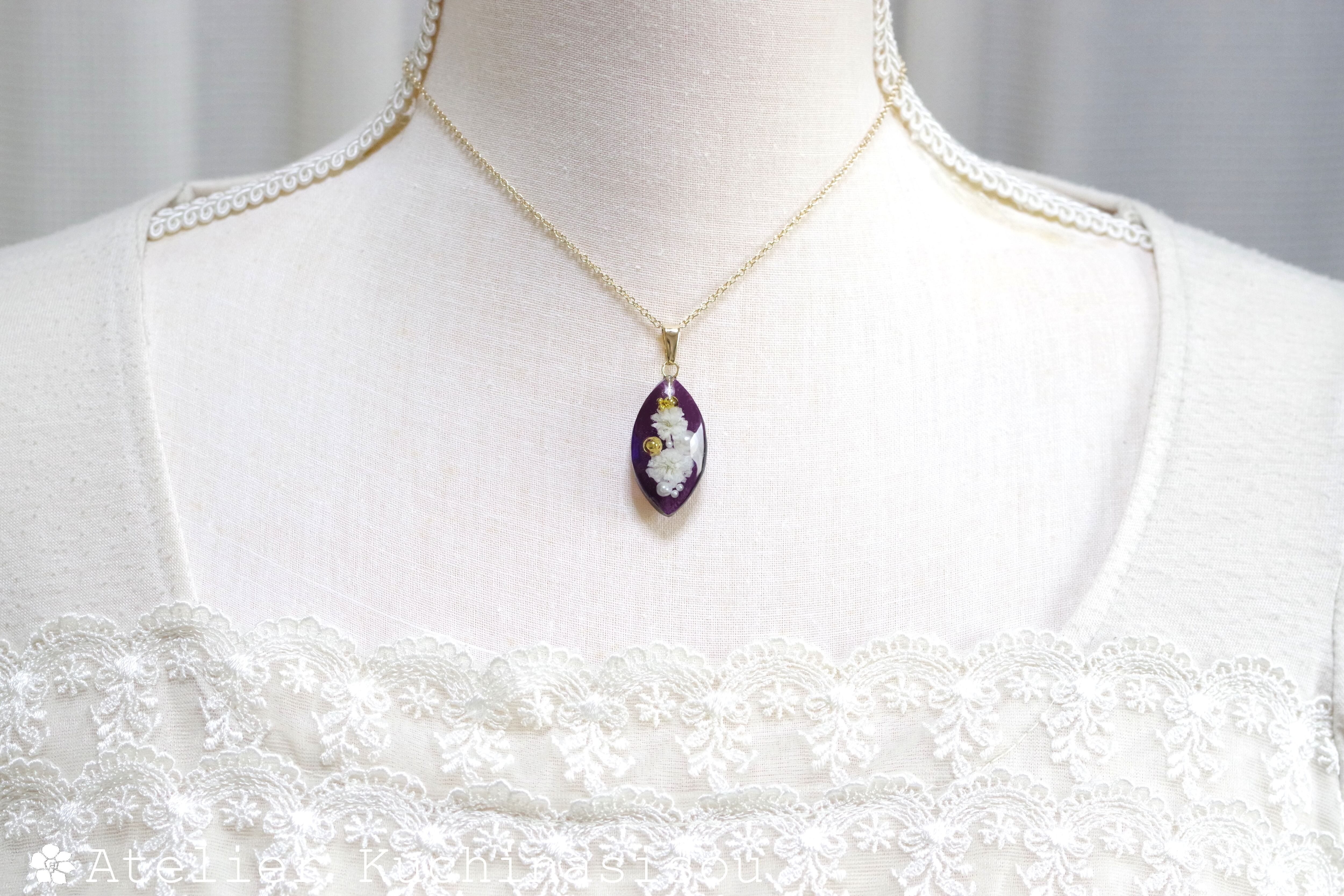 淑やかで落ち着いた紫色の背景にお花とパール、ブリオンをあしらった可憐なペンダント。