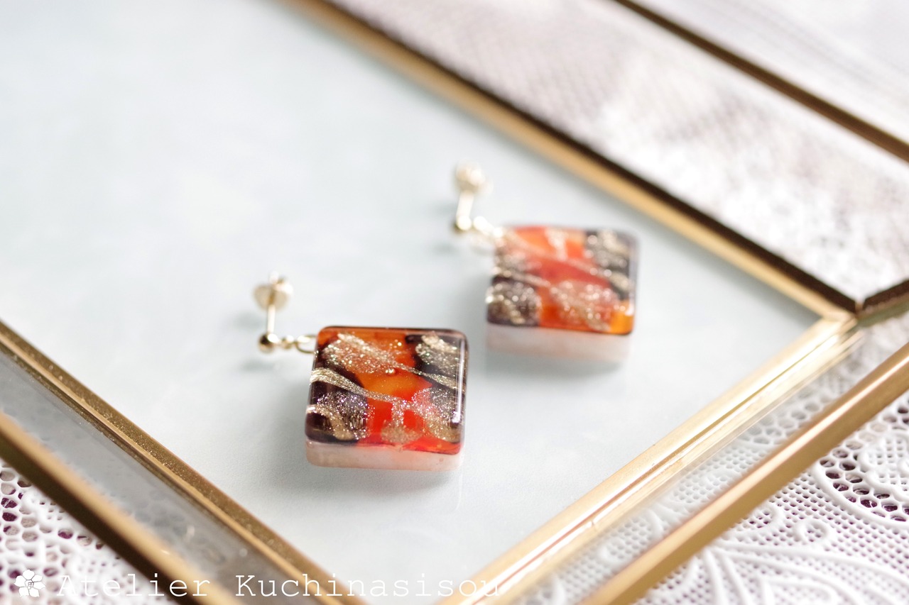 黒とオレンジとイエローのレジン、ゴールドのラインがなんとも華やかで、夕焼けを思わせるノスタルジックなカラーリングのピアス。