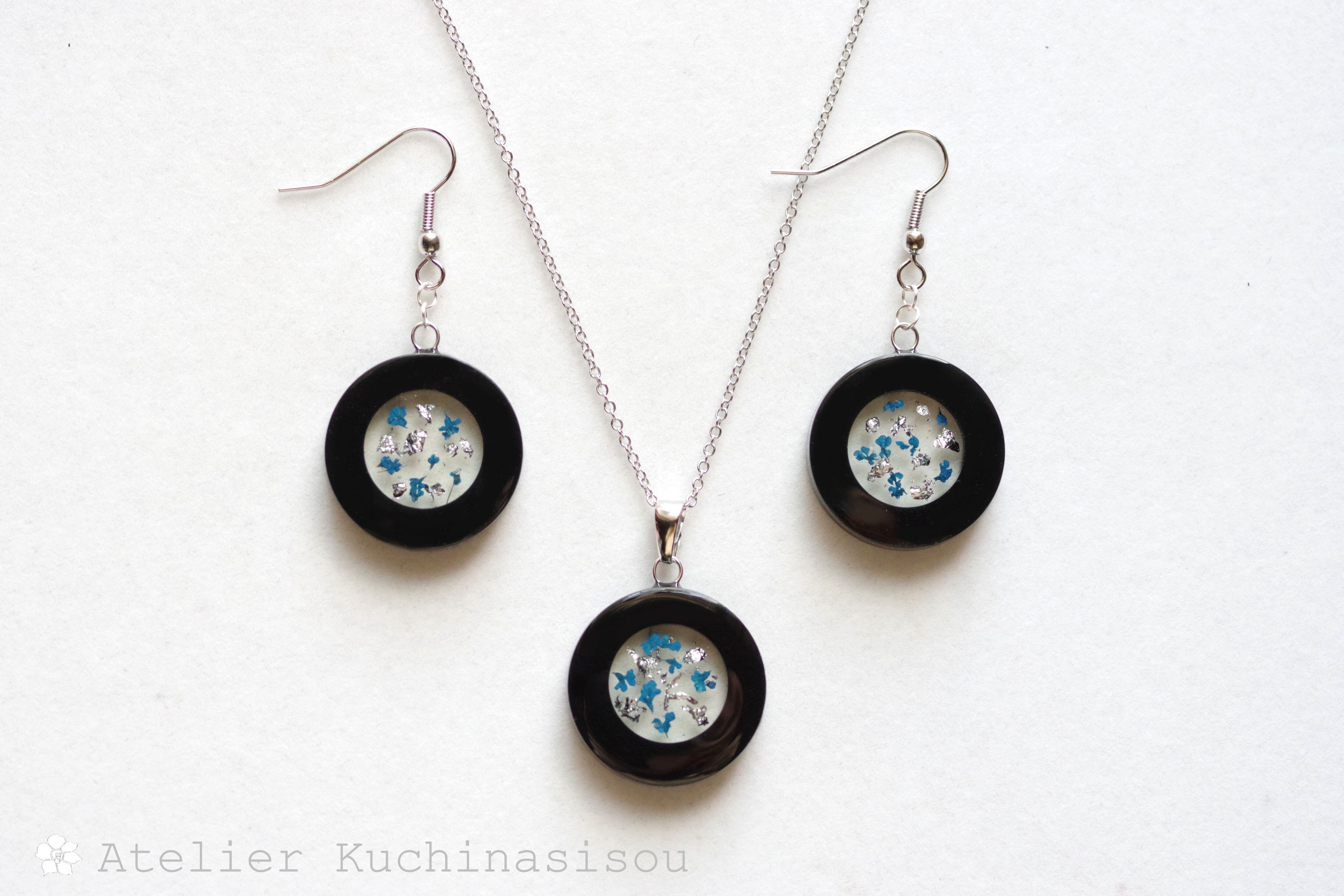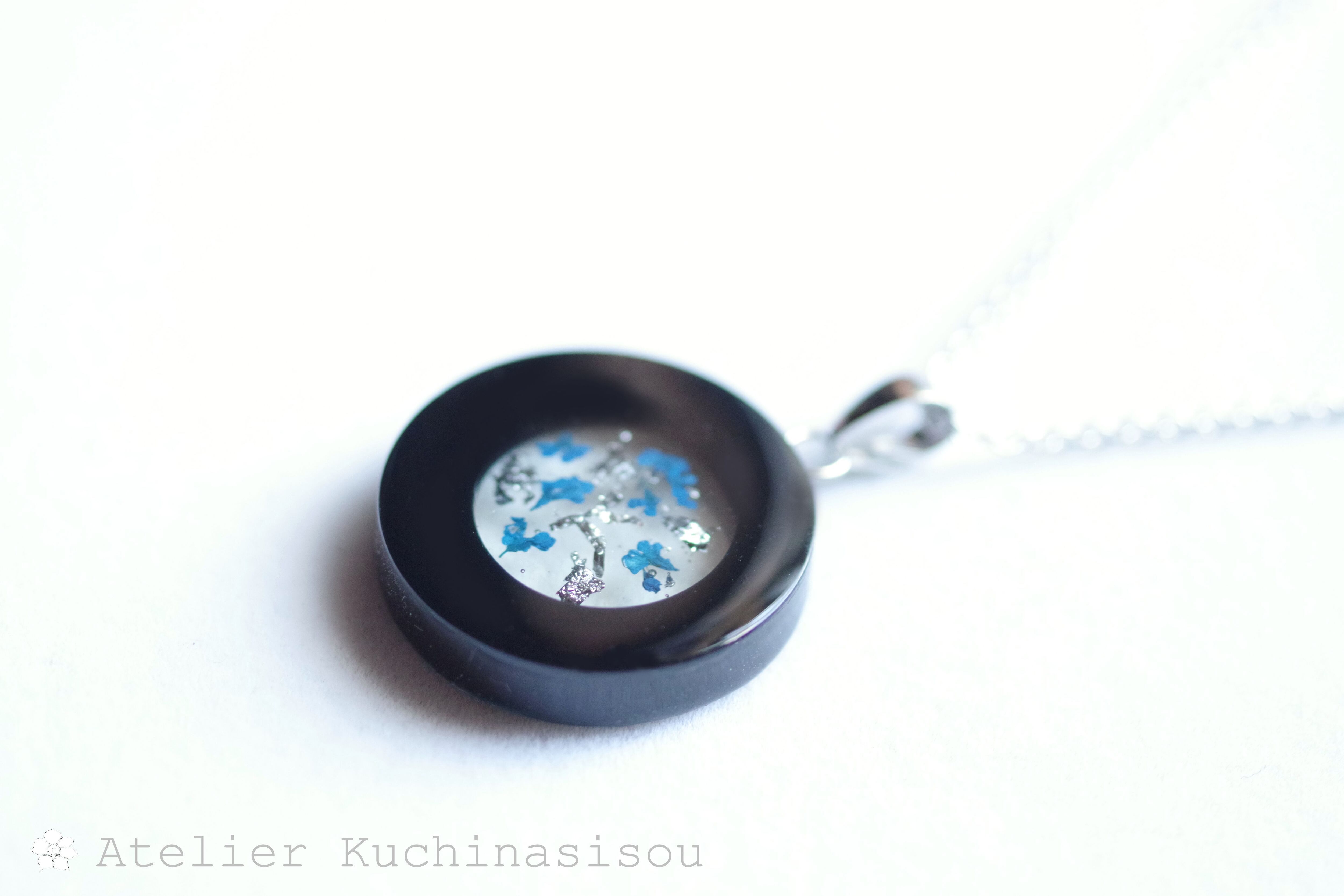 黒いレジンで透明なレジンを囲み、金箔と青色のお花を散らした、静謐で可憐なペンダント。
