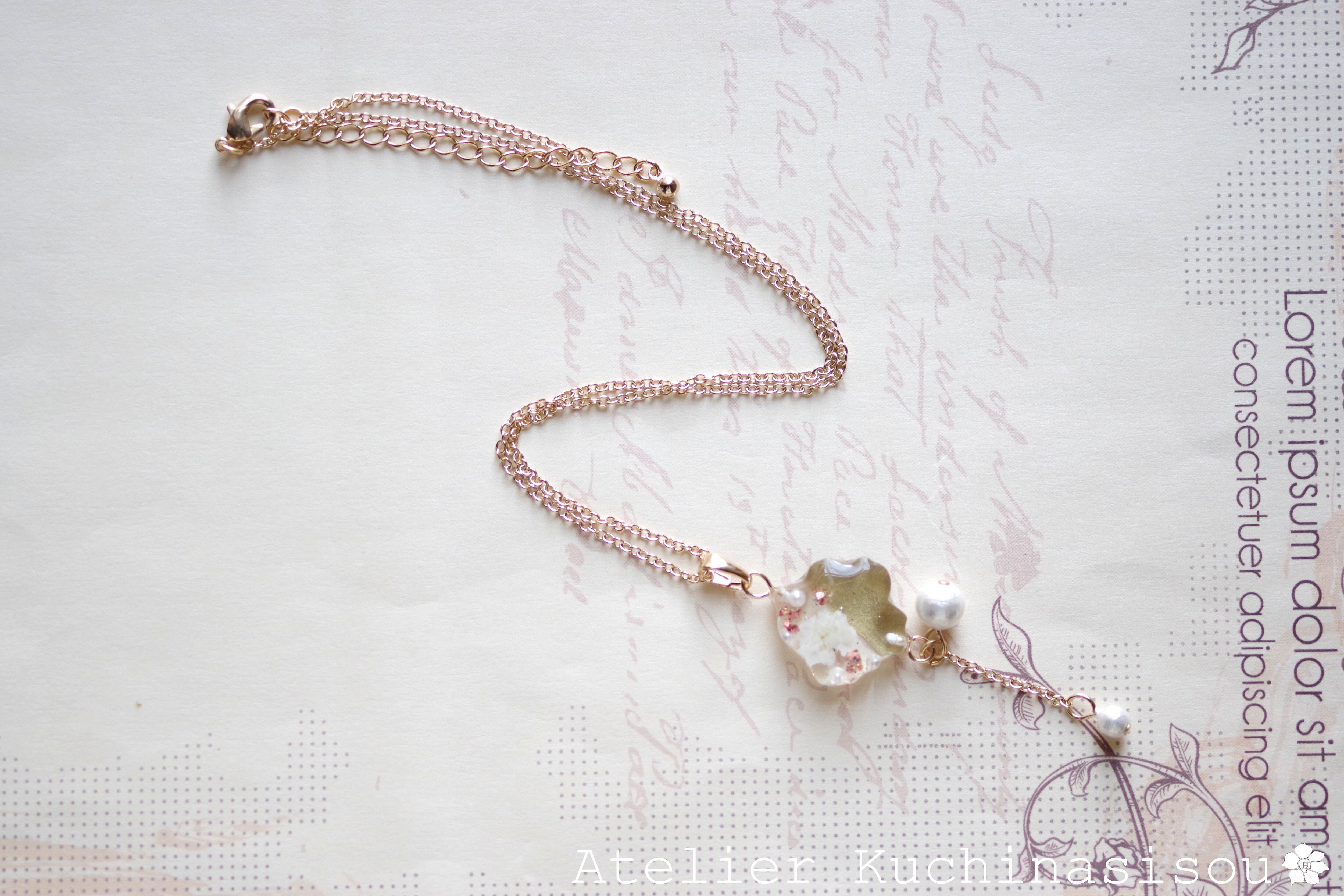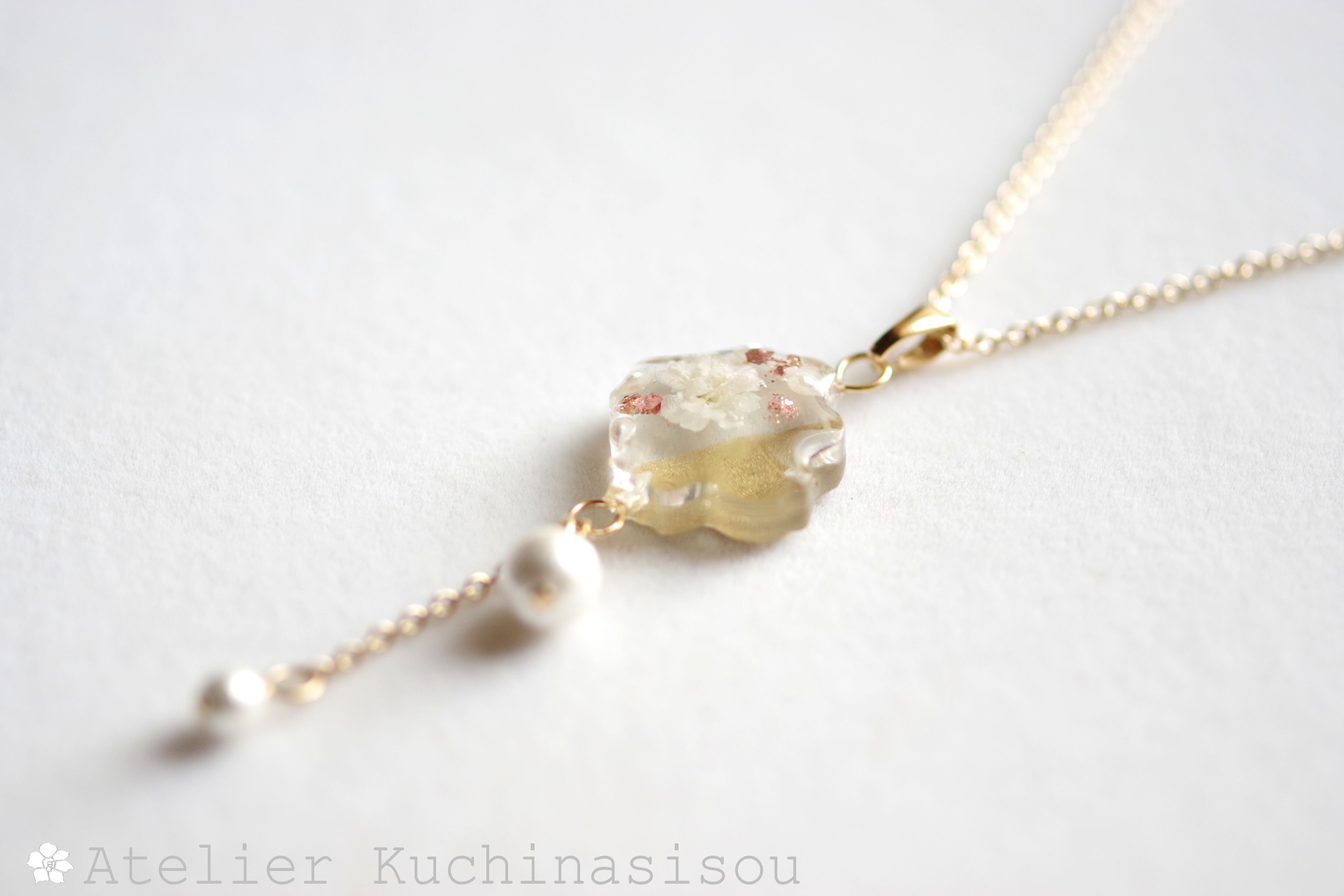 凹凸のレジンにお花とパールを封じ込め、ゴールドで装飾し、大小二粒のコットンパールをあしらったペンダント。