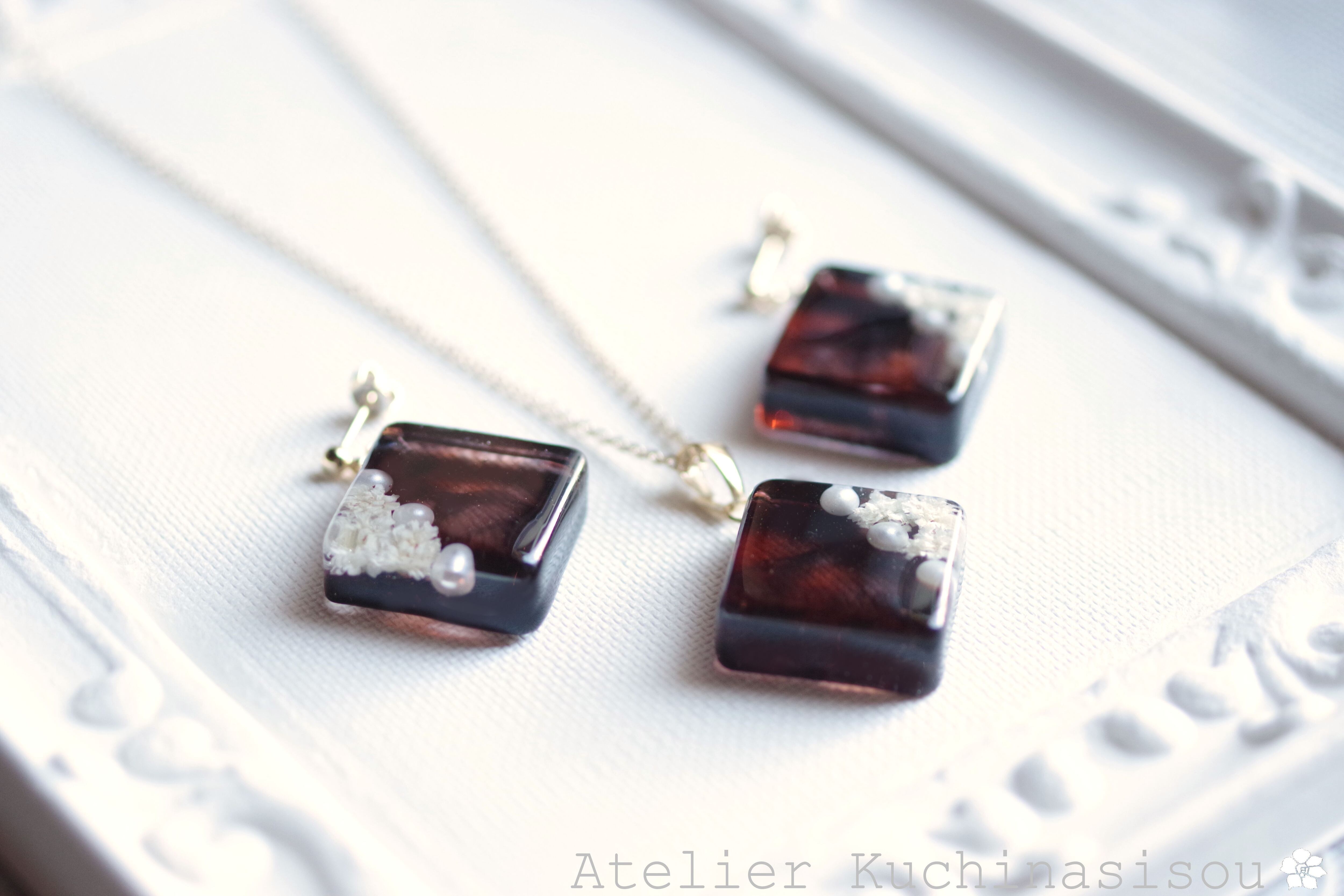 パールとお花をスクエア型のレジンに封じ込め、ブラウンとブルーグレーで着色したピアス。