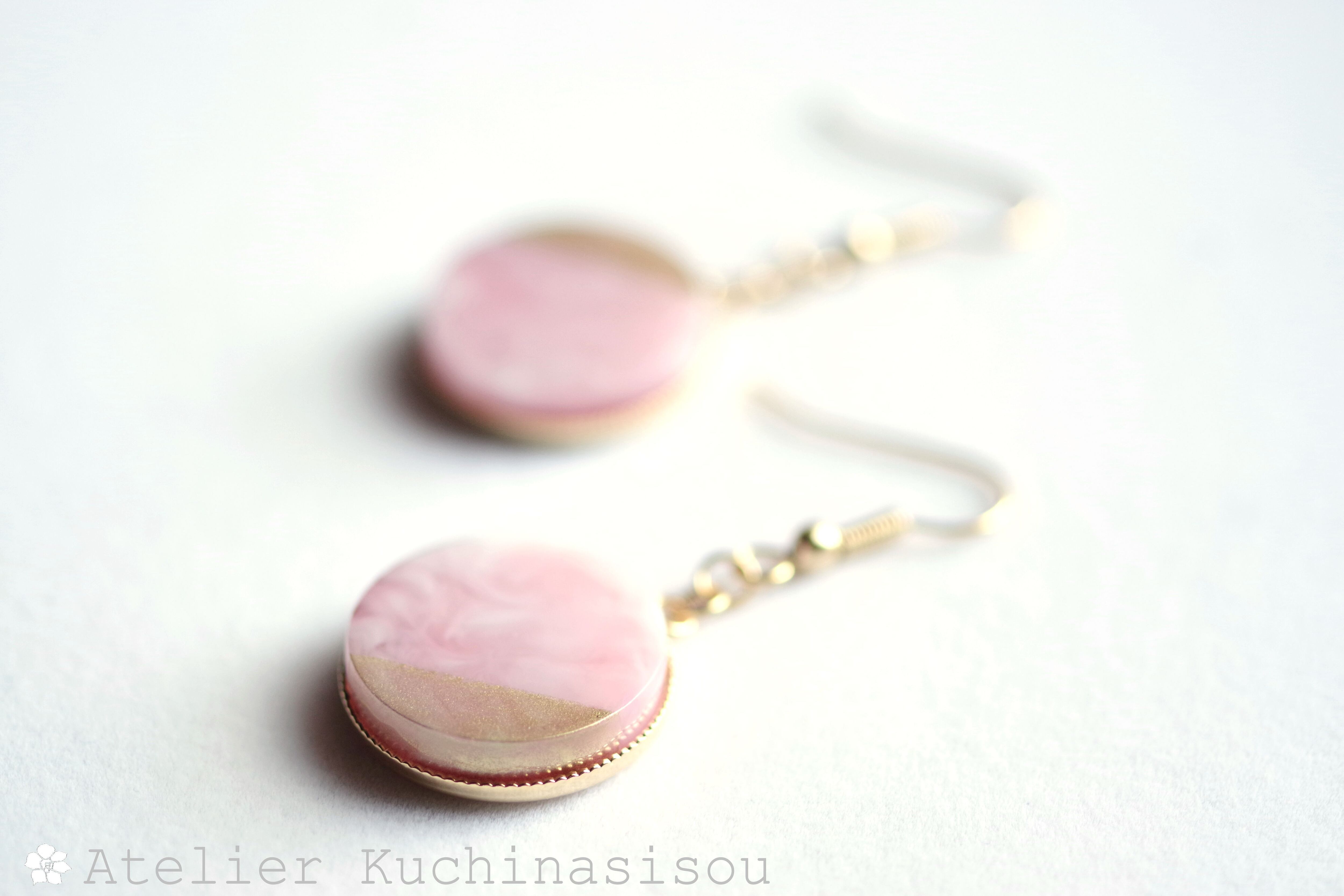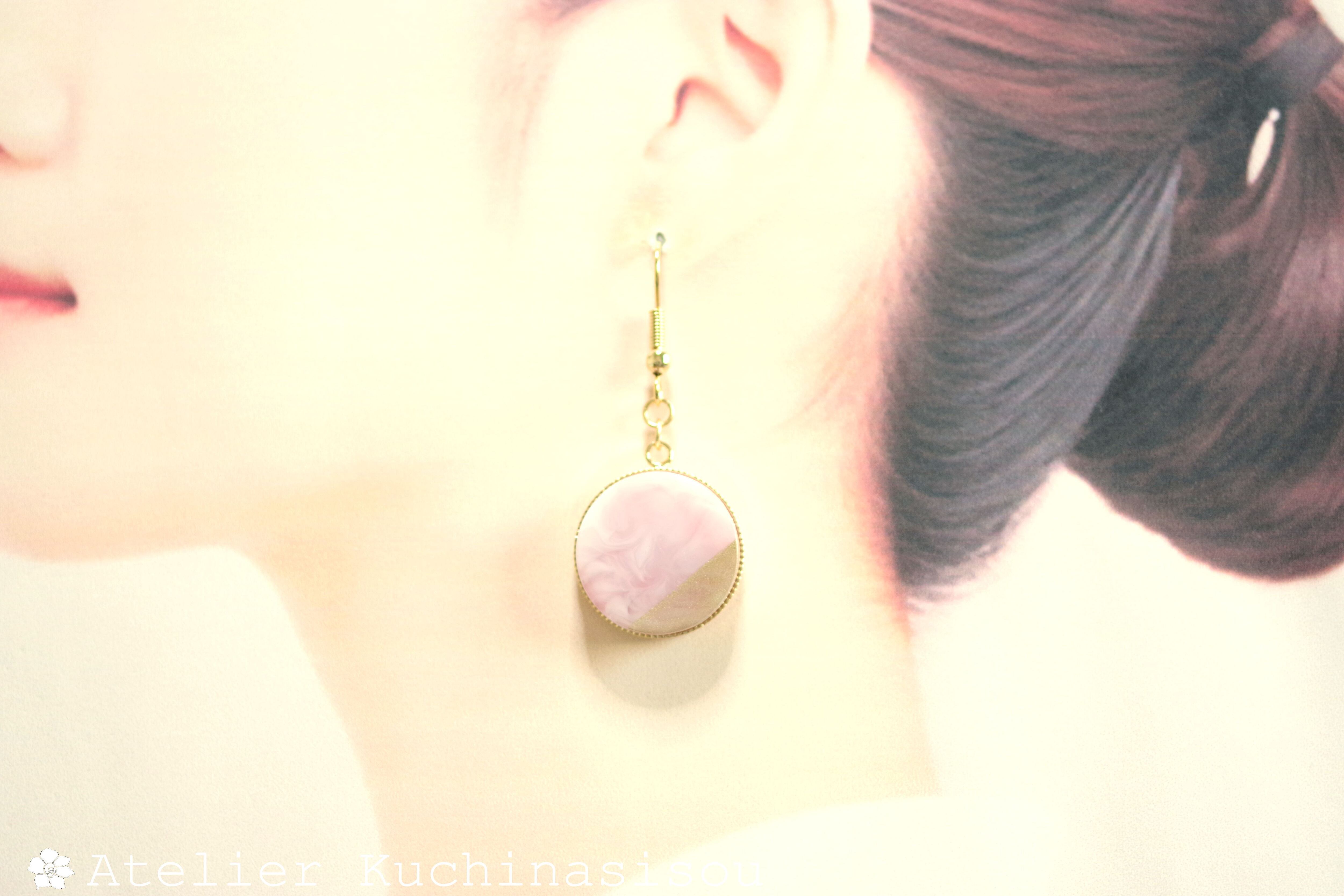 ピンクとホワイトが描く優美なマーブル模様に、ゴールドの装飾を加えたピアス。