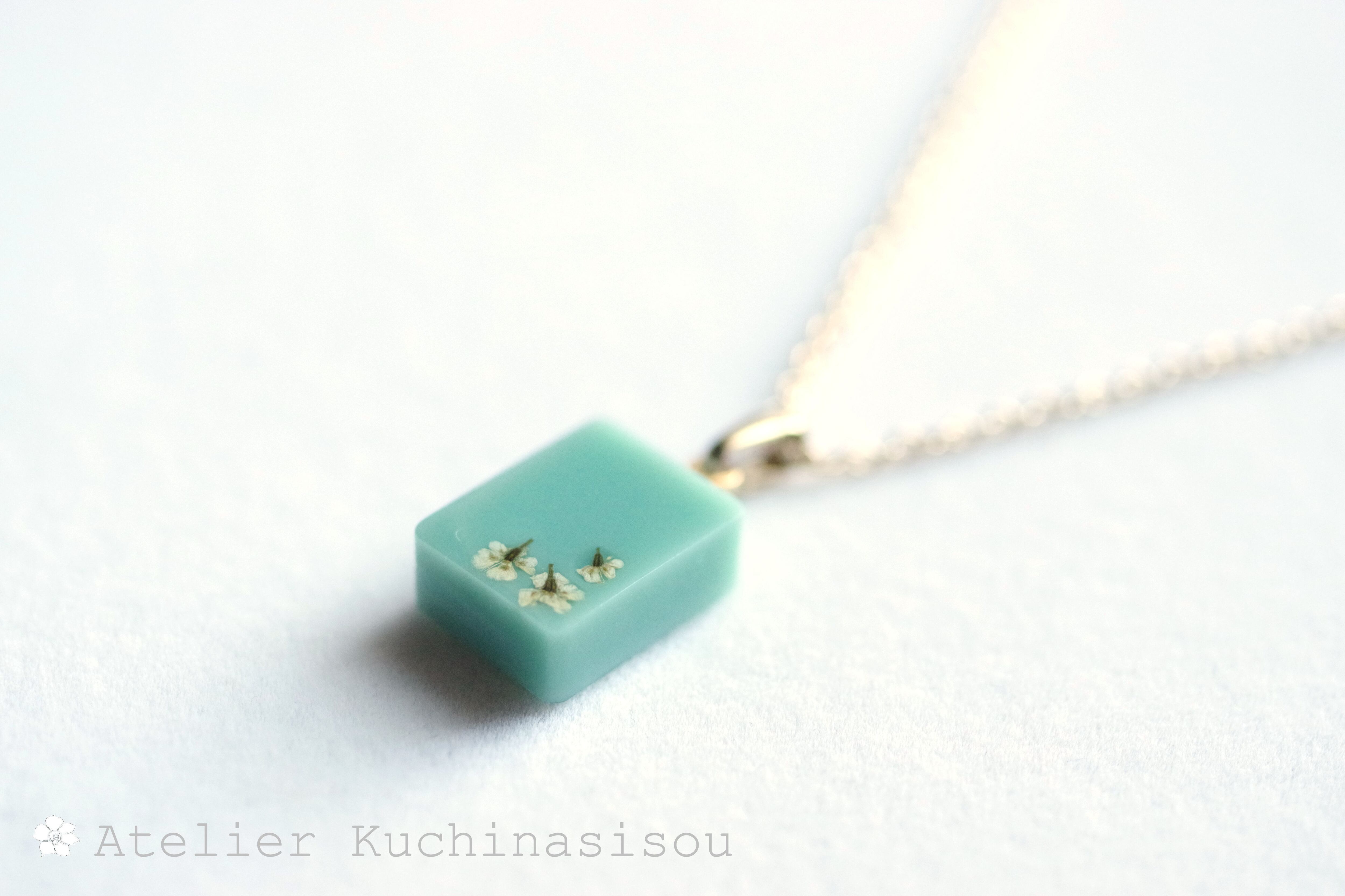 緑のレジンにお花を三輪あしらった、シンプルながらも可憐なペンダント。