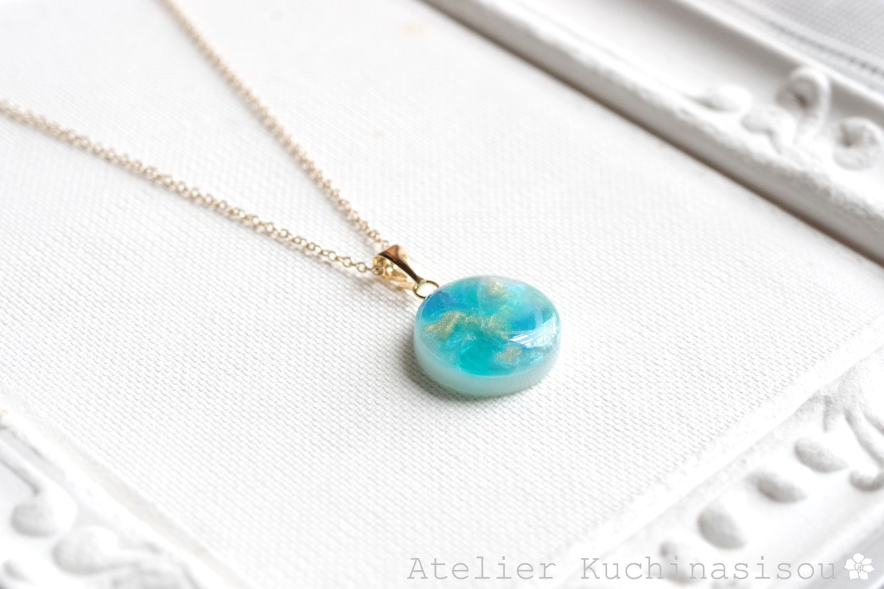 数種類のブルーと光沢のあるパールホワイトが美しい模様を描いている、爽やかで瑞々しいペンダント。