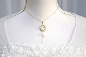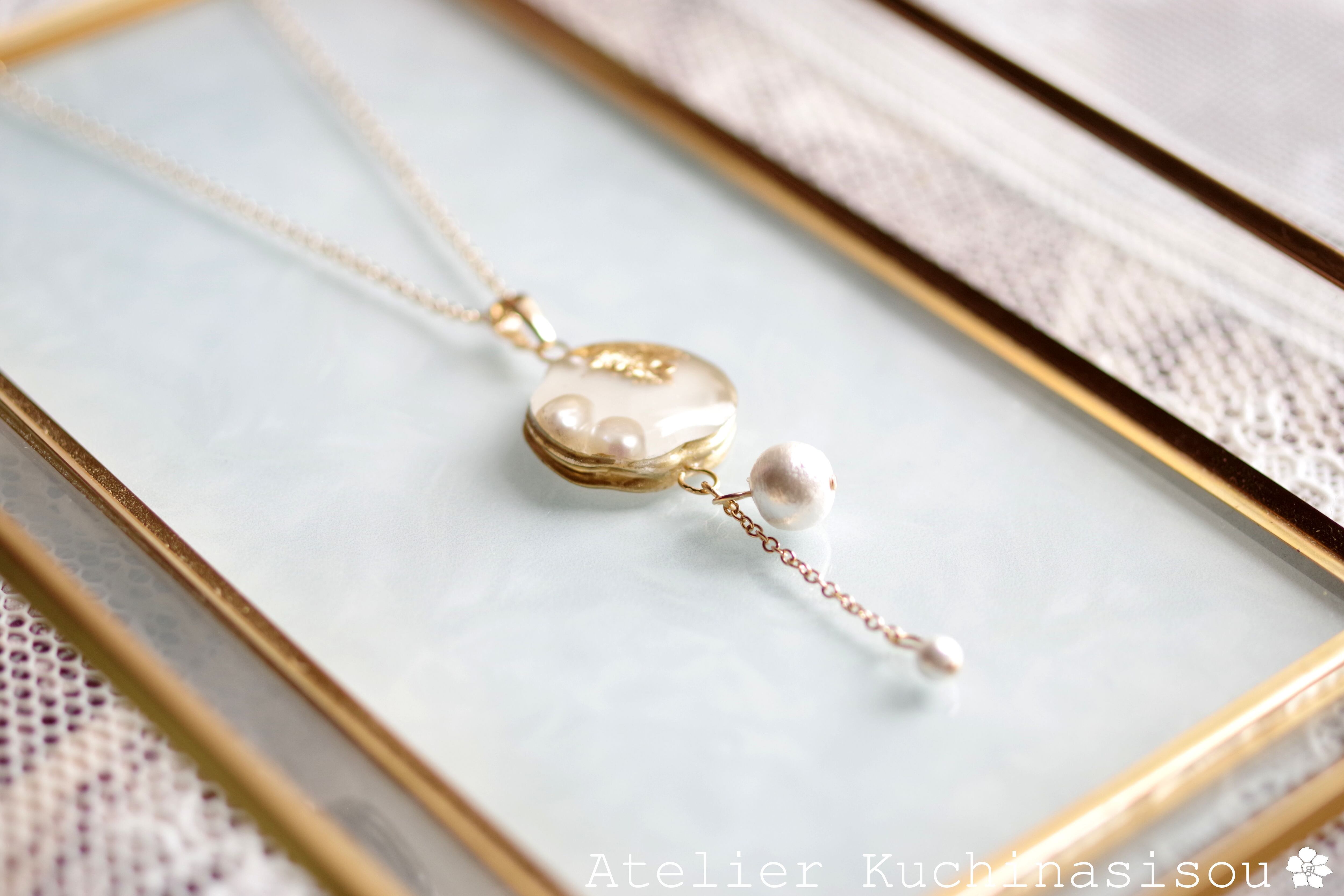 大小二粒のコットンパールを吊るして、高級感に可憐さを添えたアクセサリーに仕上げました。