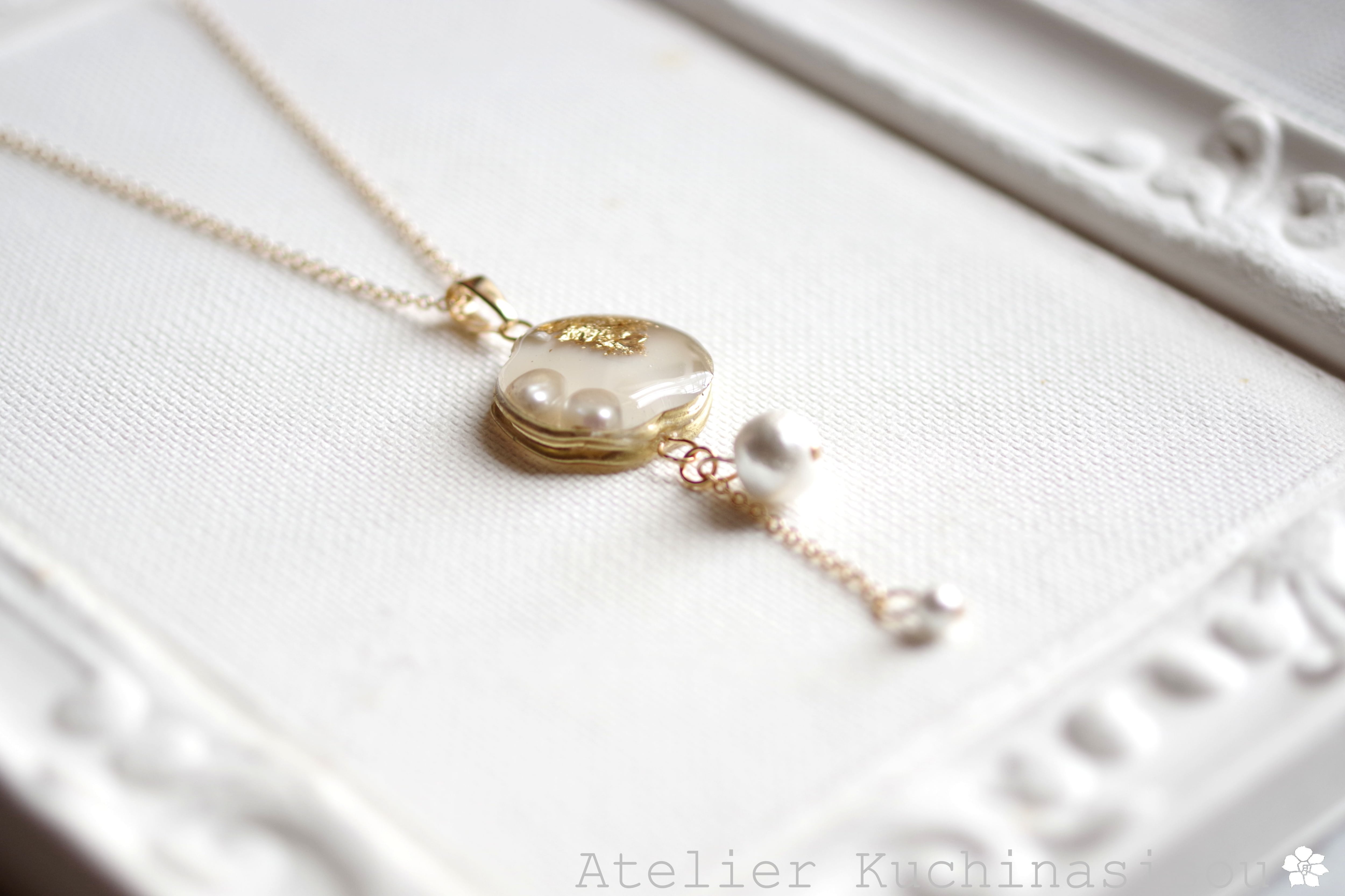アゲートのようなレジンに淡水パールと金箔を沈めました。