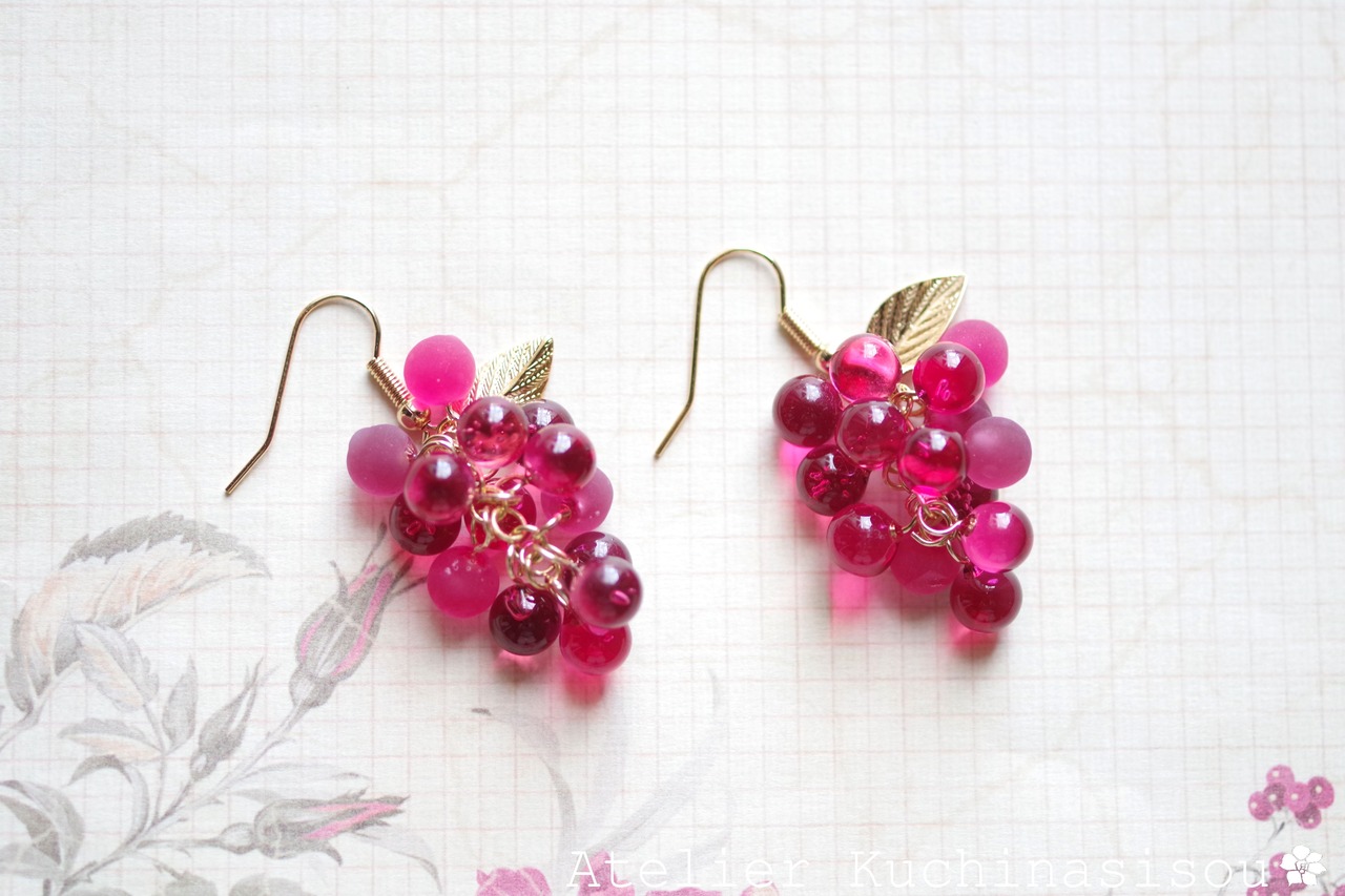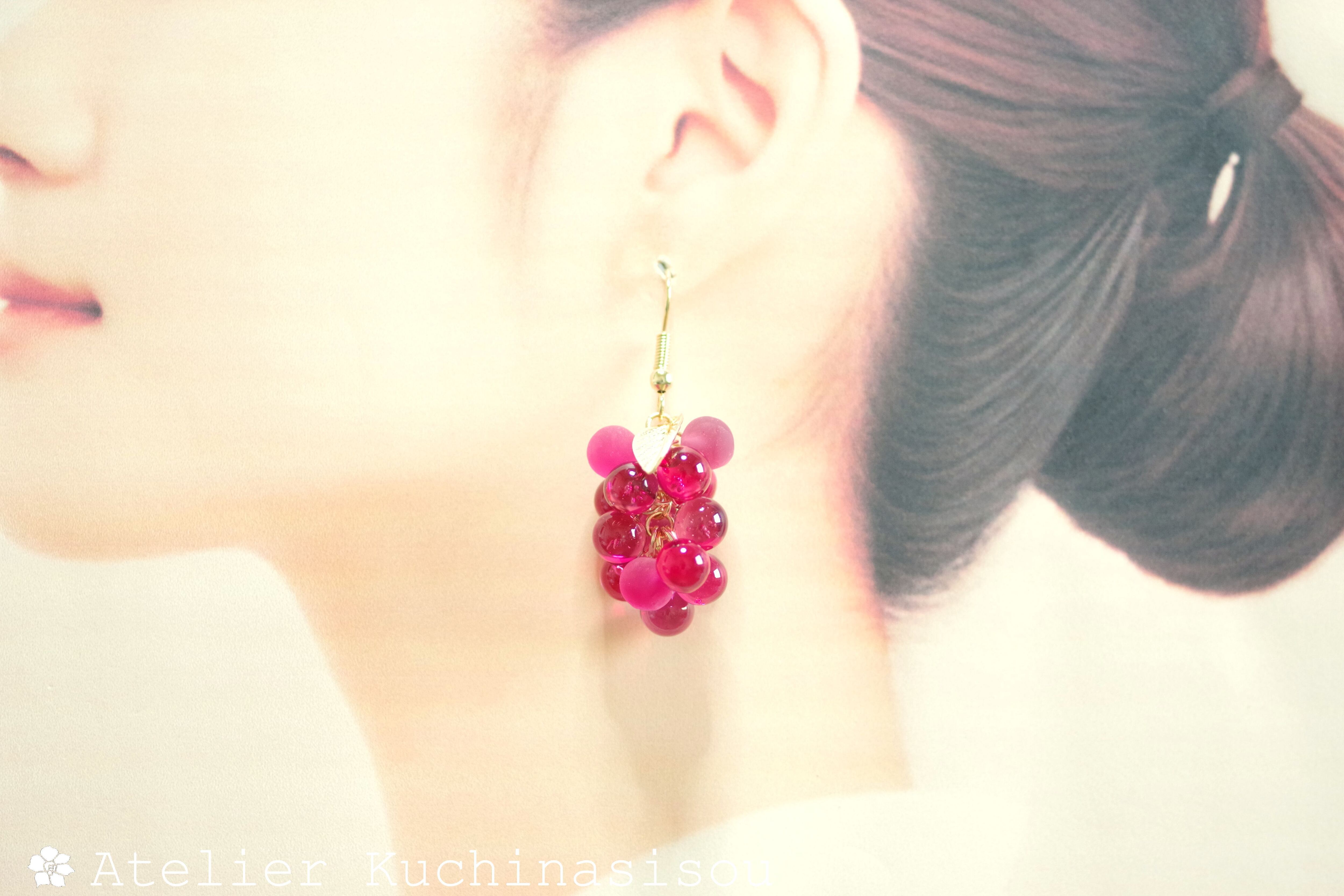 レジンで二種類の赤色の球体を作り、葡萄の房のように連ね、葉っぱチャームを添えたピアス。