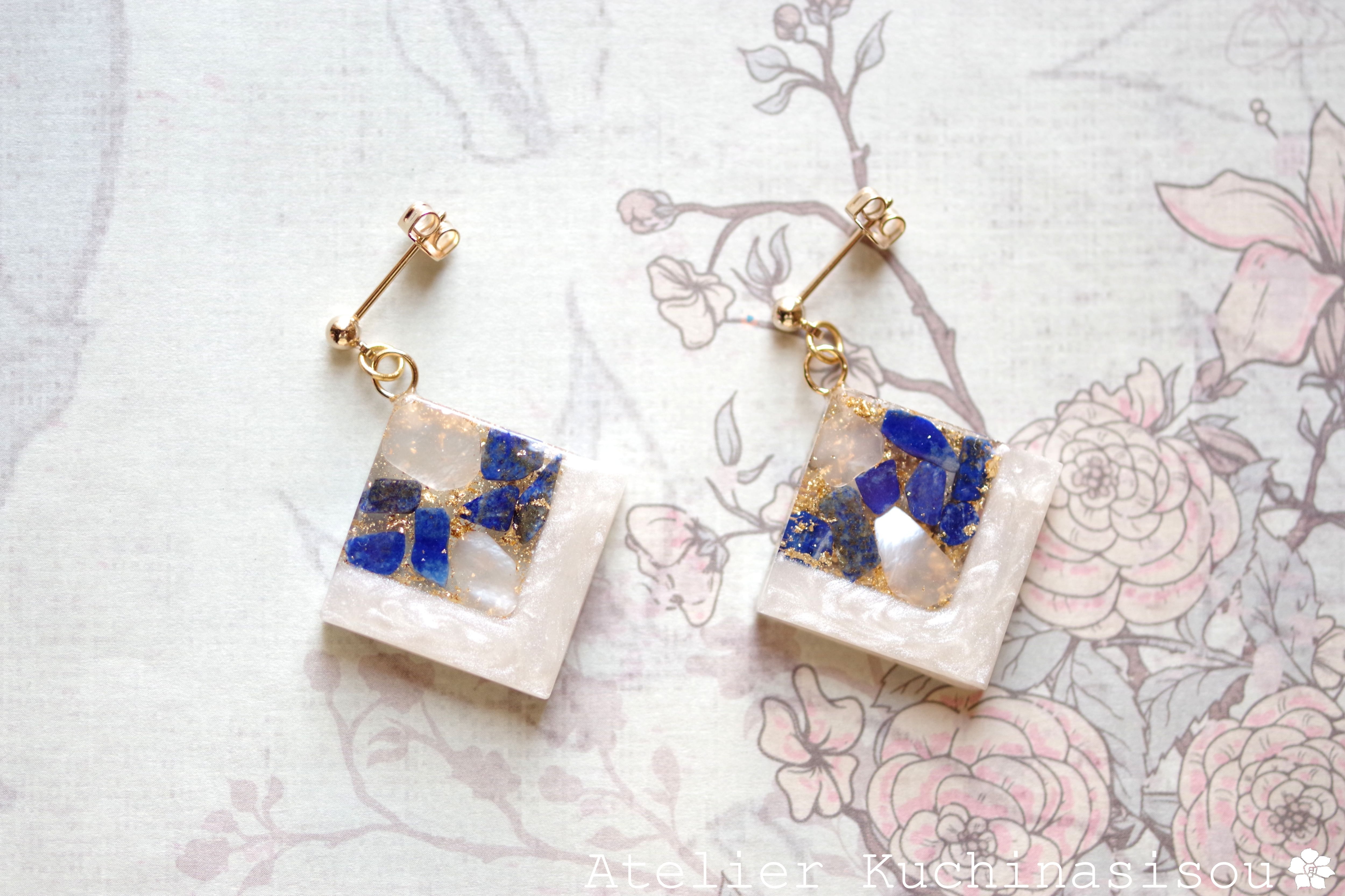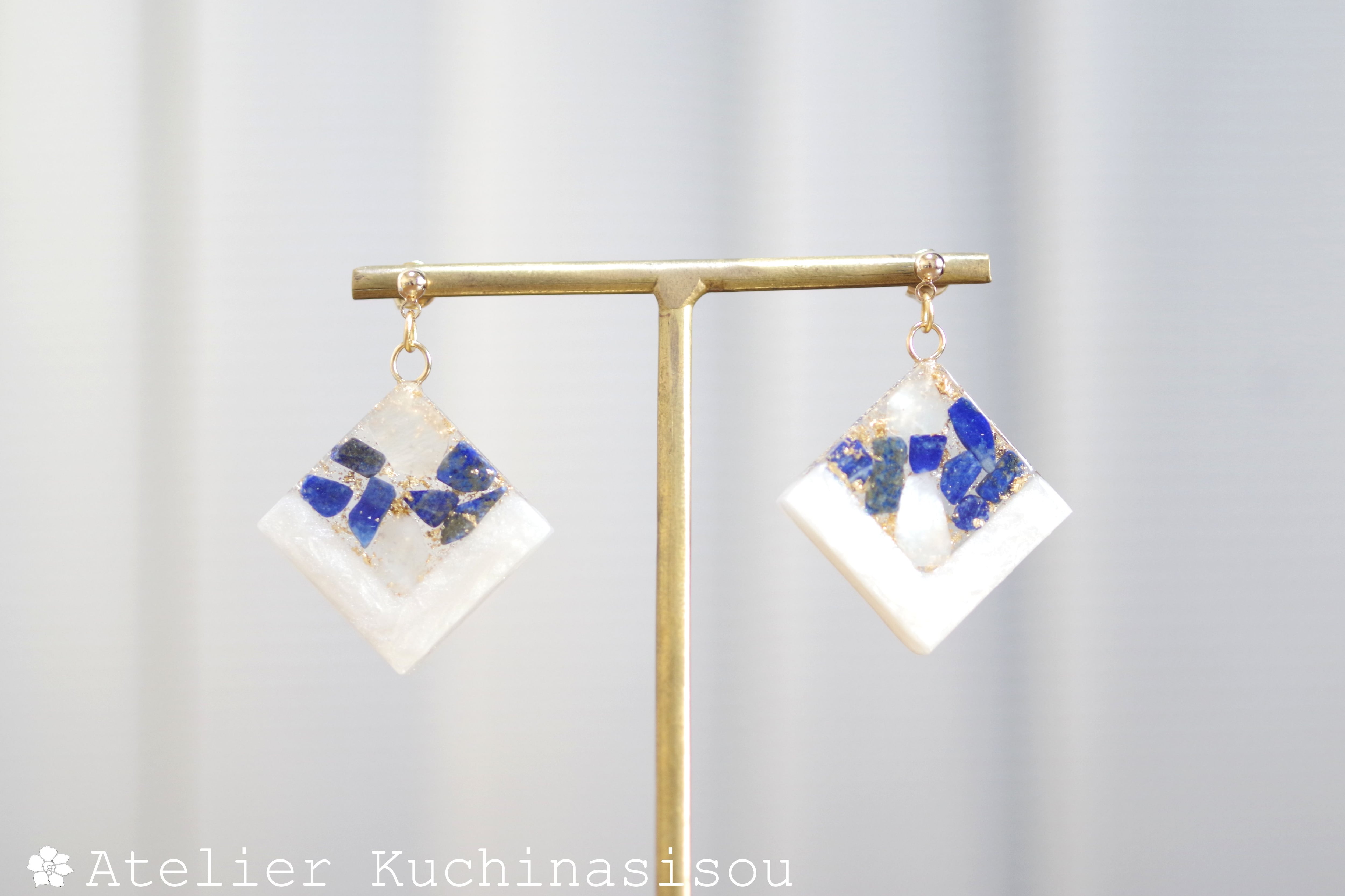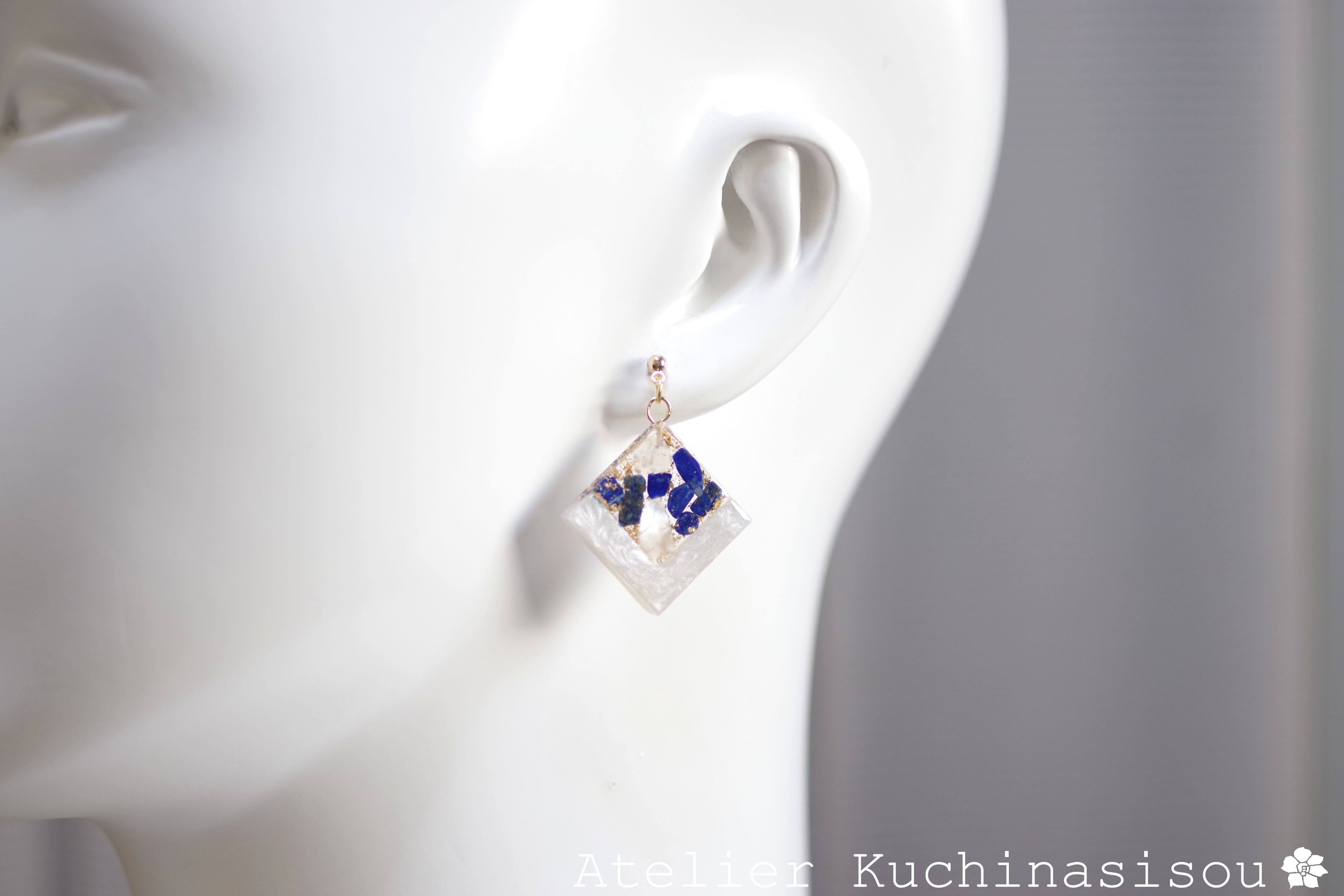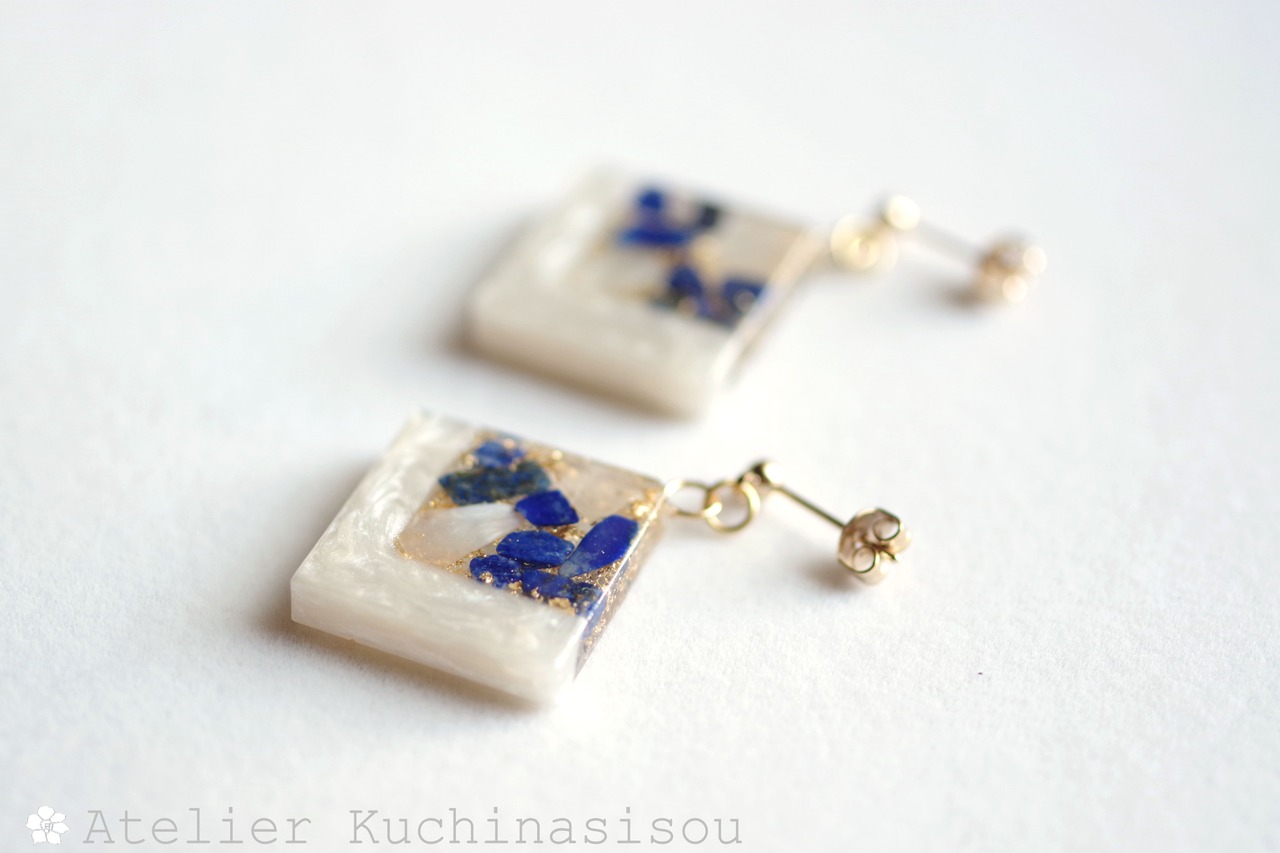 透明のレジンにホワイトシェルとラピスラズリのさざれを沈め、光沢のあるホワイトで囲ったピアス。