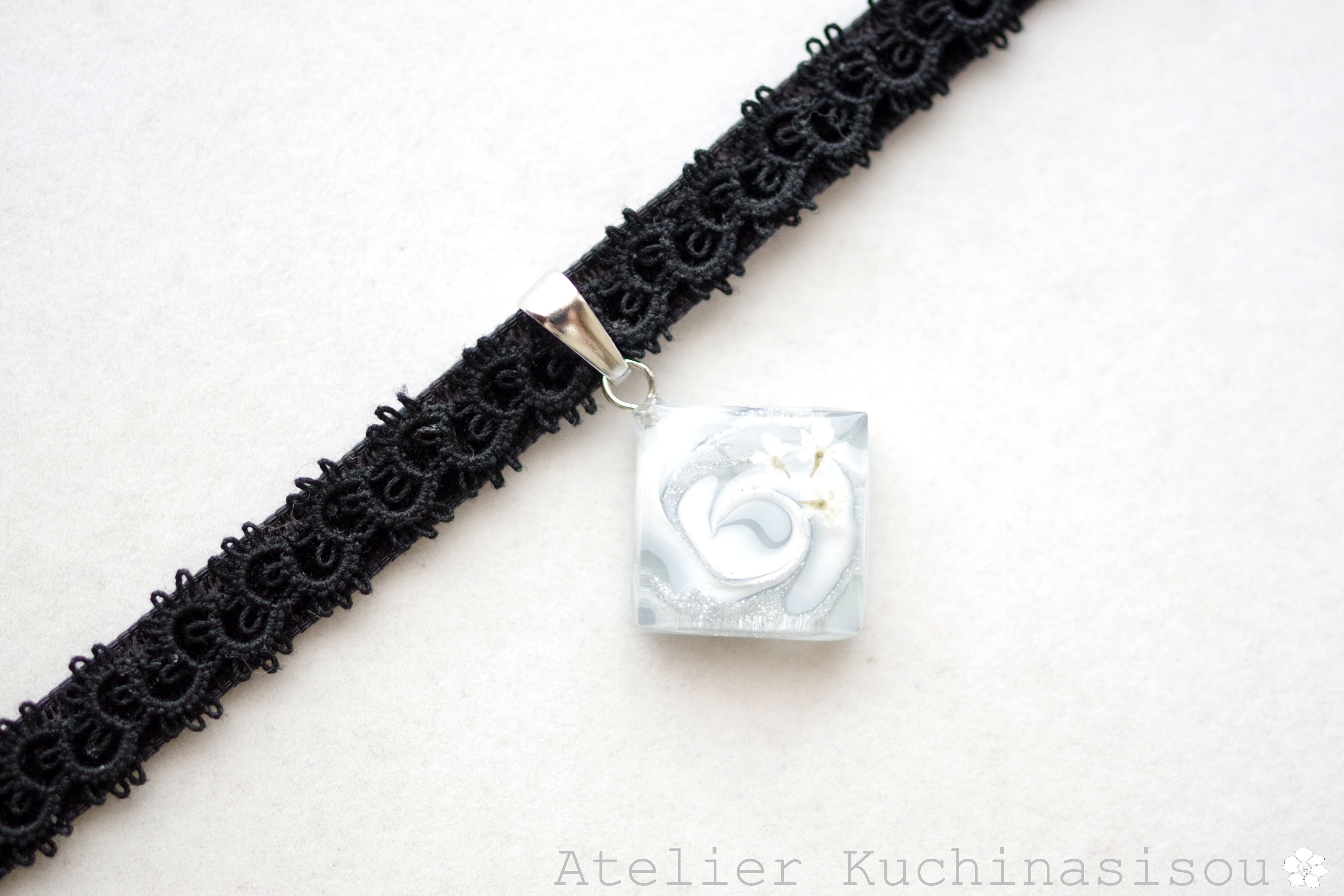 白とシルバーのマーブル模様の隙間から覗くひそやかなグレーが大人っぽいレジンを、ベルベットリボンにタティングレースで装飾を施したチョーカーに仕上げました。