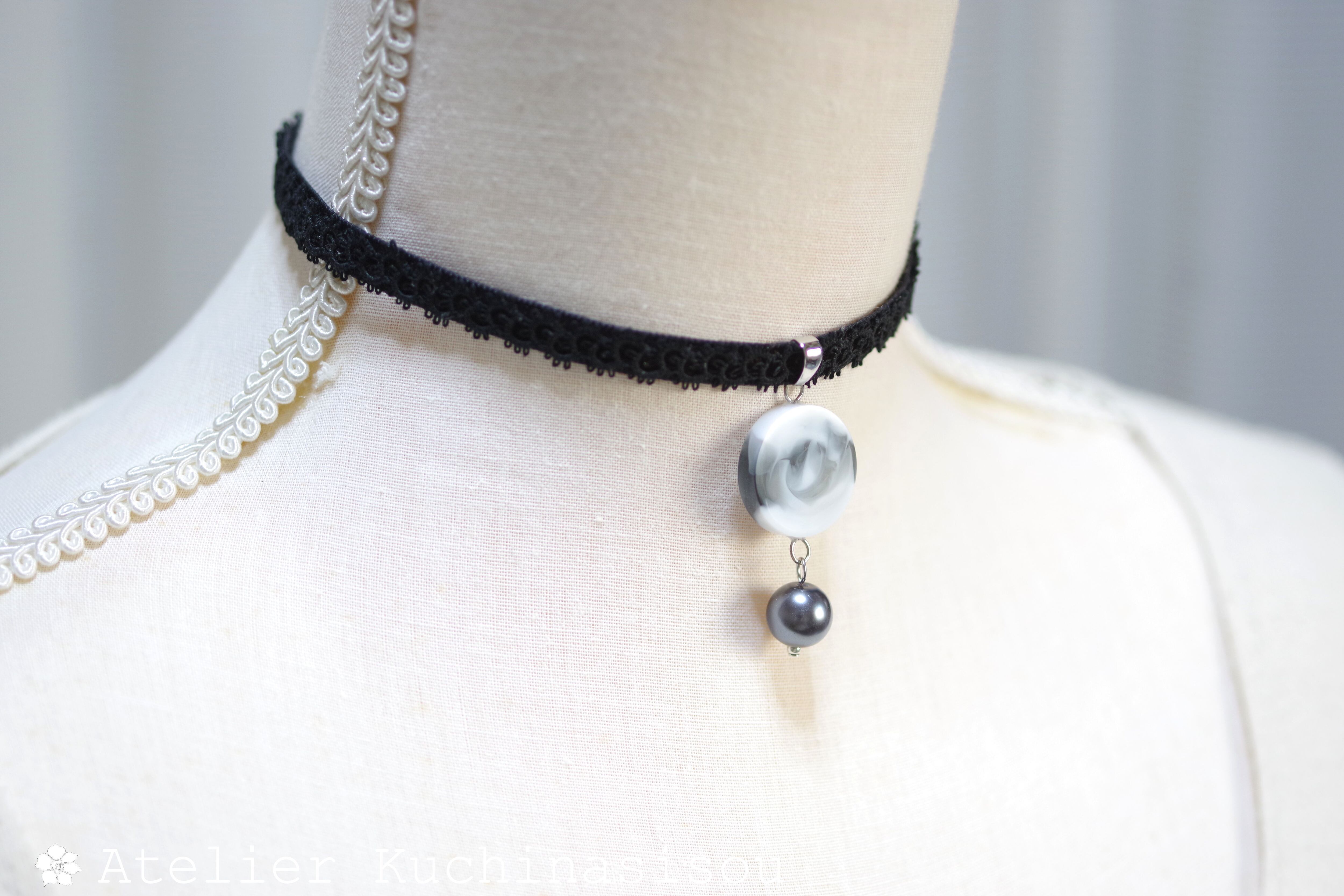 二種類のグレーとホワイトが優美なマーブル模様を描くレジンを、ベルベットリボンにタティングレースで装飾を施したチョーカーに仕上げました。