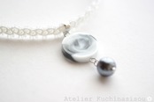 二種類のグレーとホワイトが優美なマーブル模様を描くレジンを、サテンリボンにタティングレースで装飾を施したチョーカーに仕上げました。