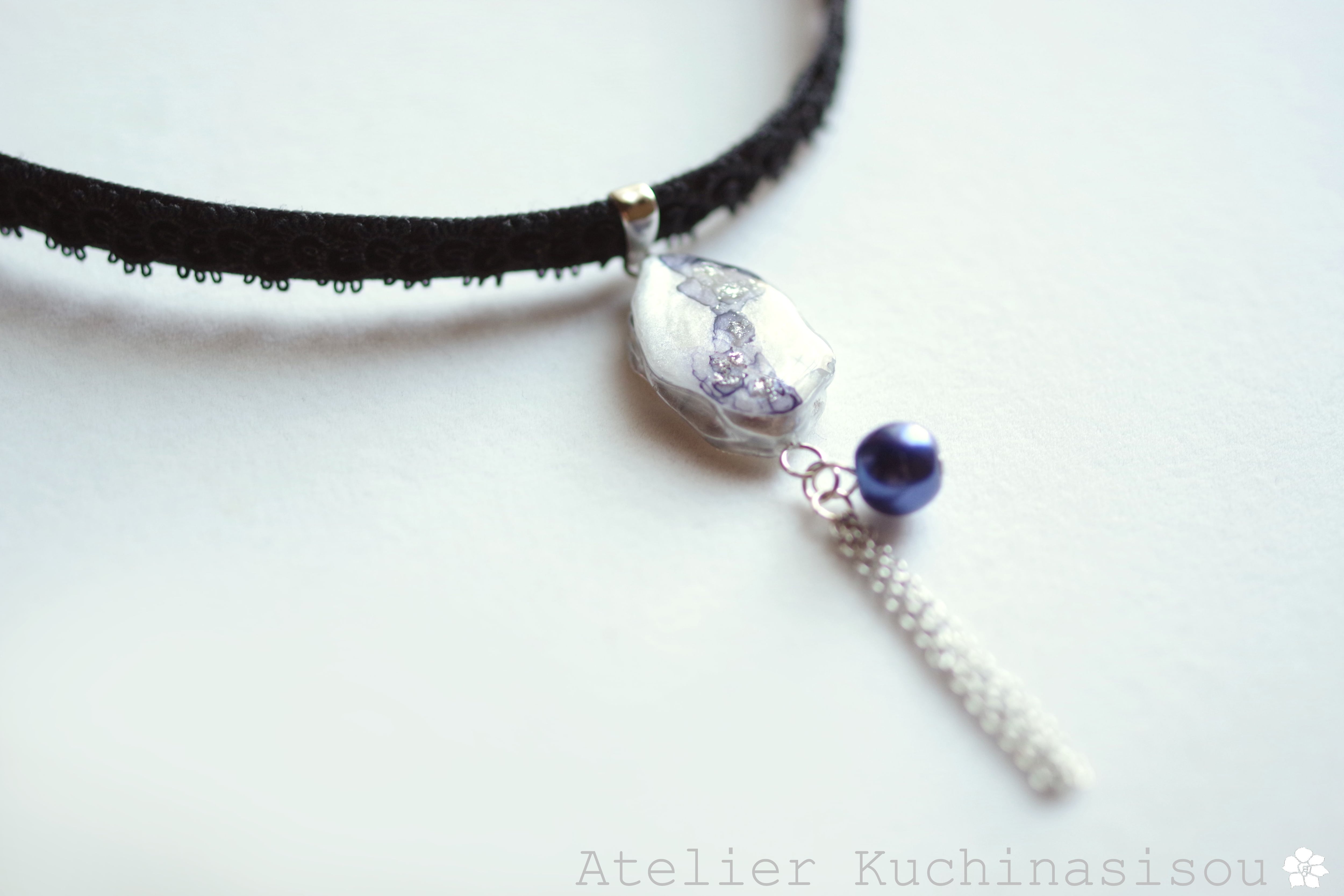 スライスアゲートのような光沢のある白いレジンにブルーの模様を描き、ガラスパールとフリンジを添え、ベルベットリボンにタティングレースで装飾を施したチョーカーに仕上げました。