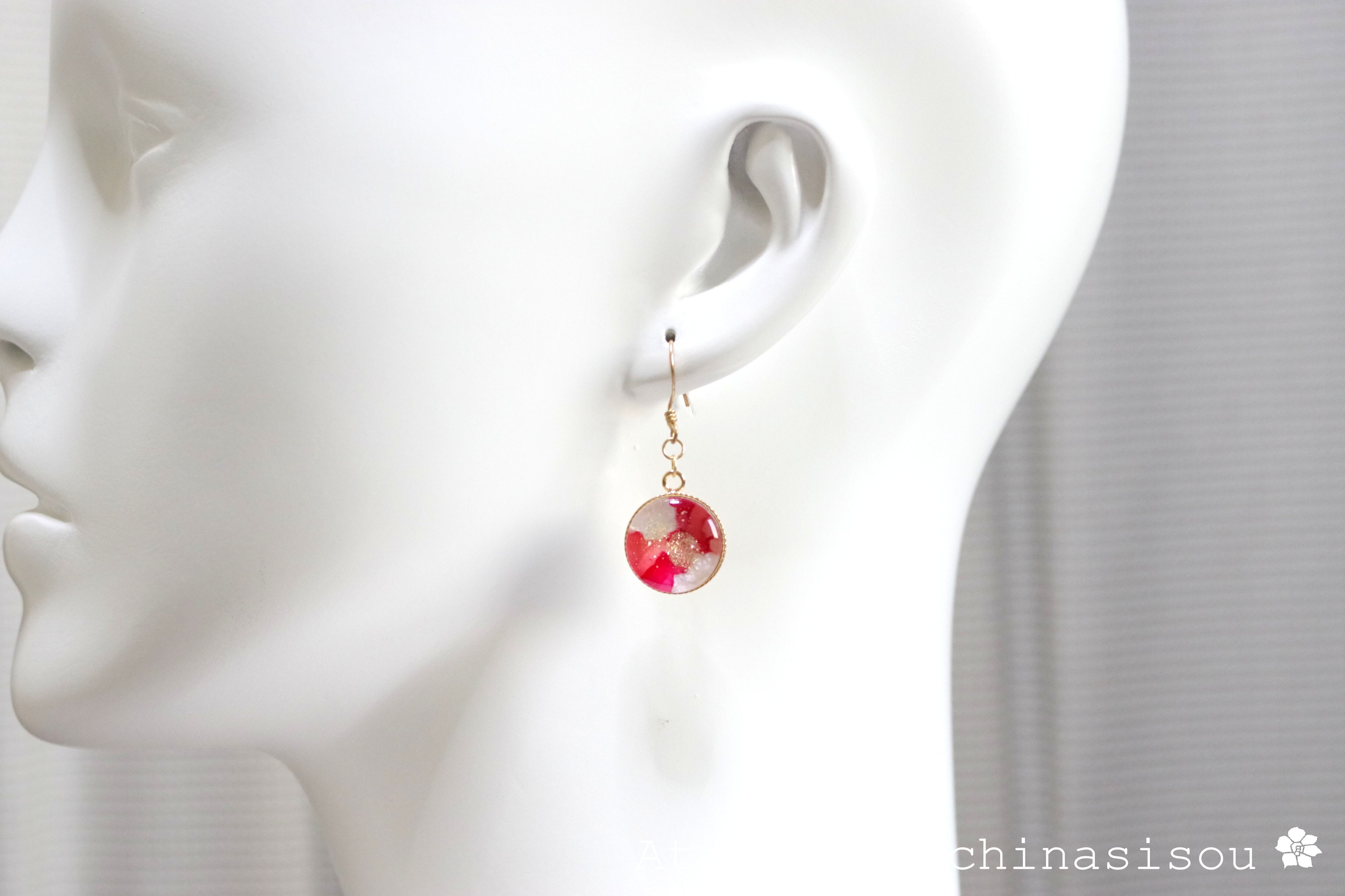 二種類のピンクで描いた模様が可憐な、小粒のレジンのピアス。