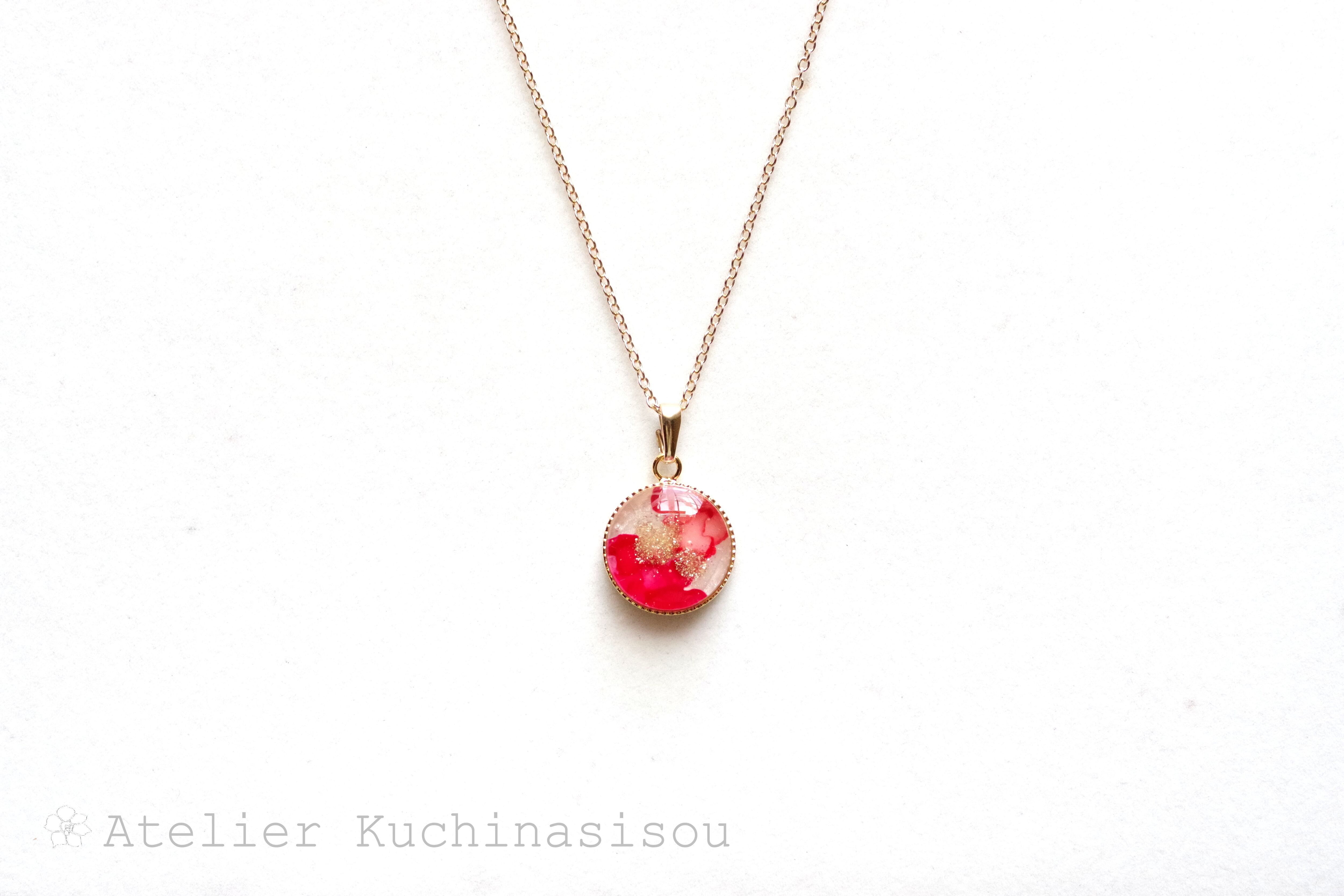 二種類のピンクで描いた模様が可憐な、小粒のレジンのペンダント。