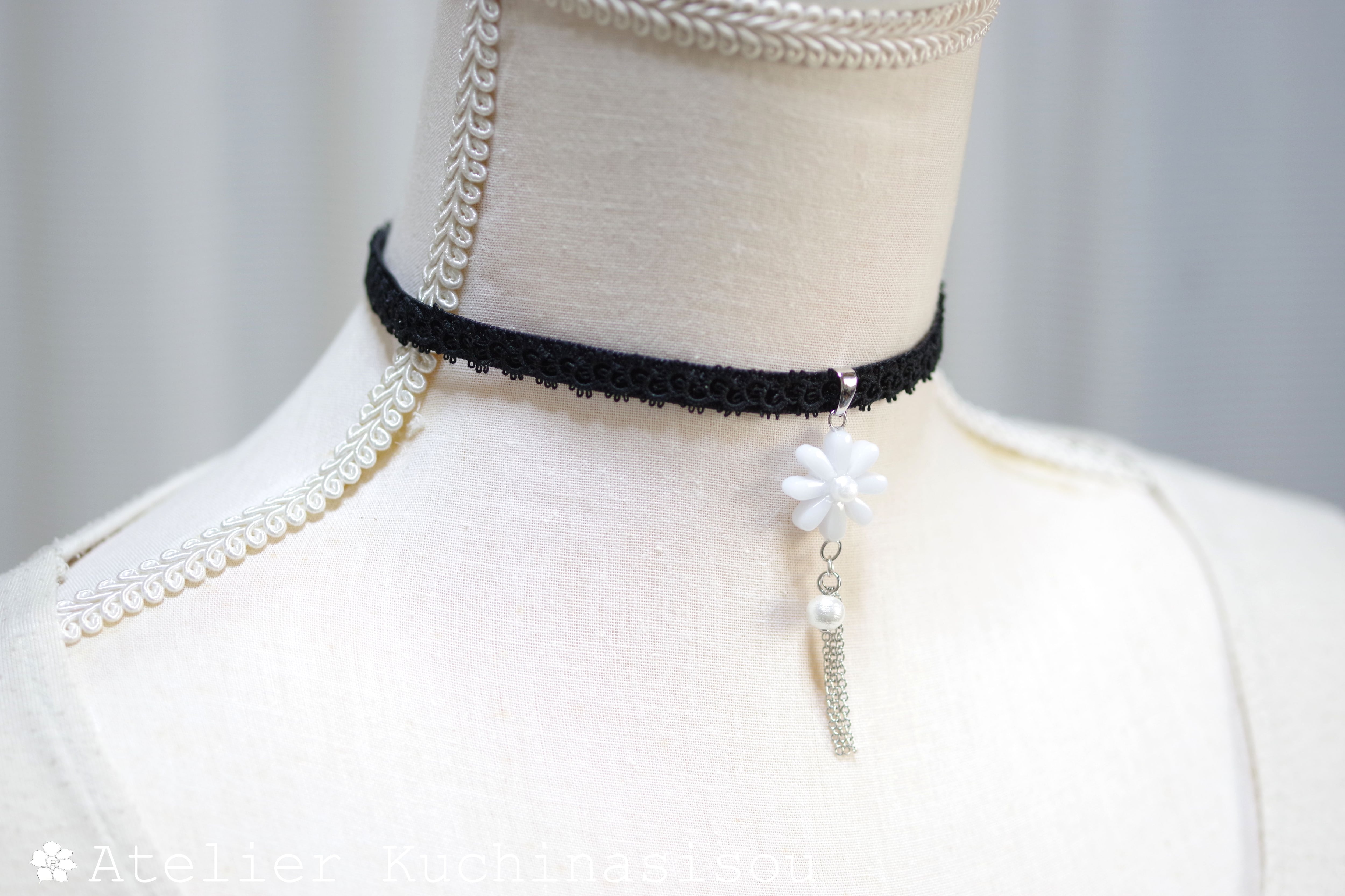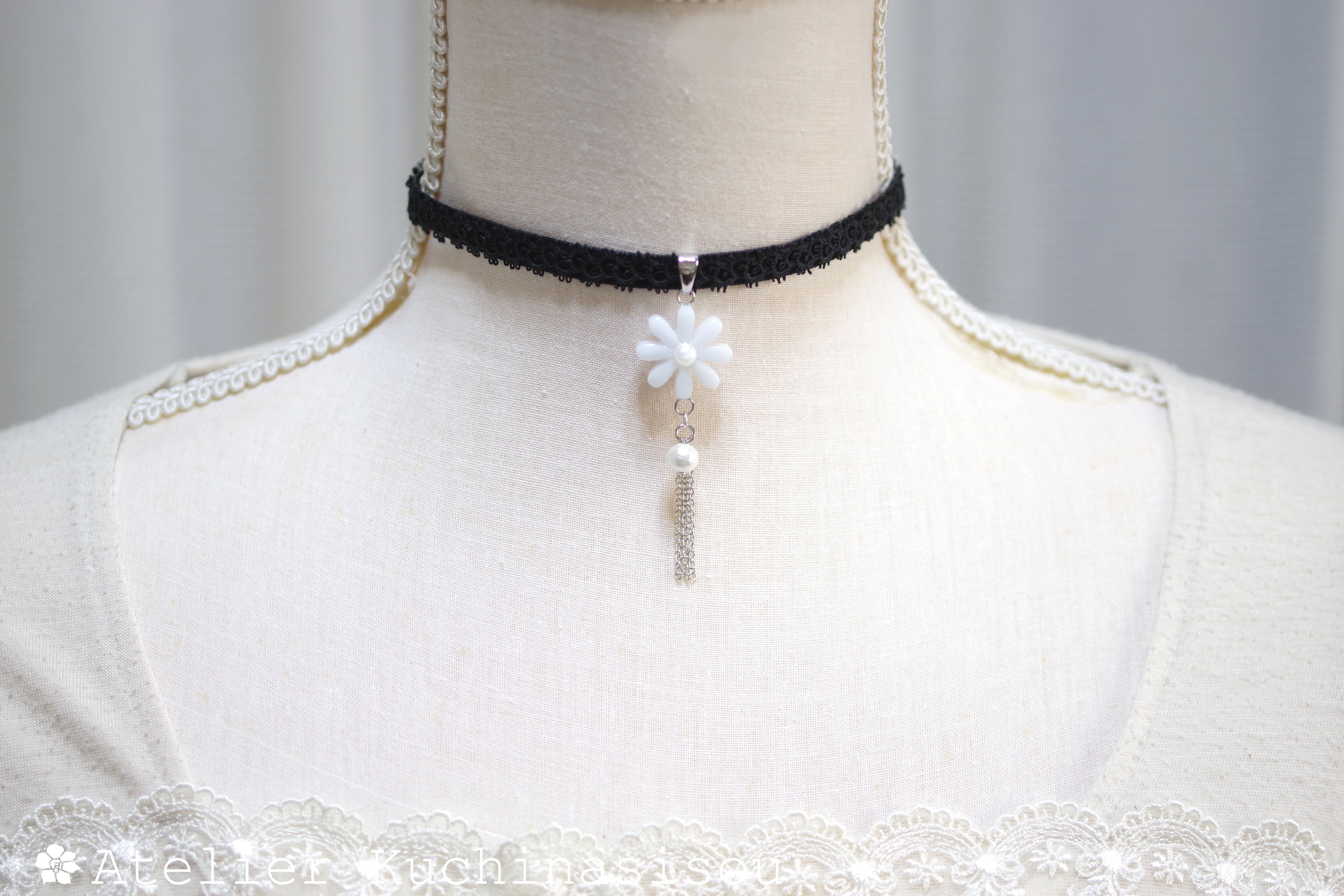 中心の花芯とコットンパールの光沢のある輝きが上品なチョーカー。