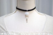 淡い淡い、どこまでも仄かでほとんど白と区別がつかないような水色のお花のレジンを、ベルベットリボンにタティングレースで装飾を施したチョーカーに仕上げました。