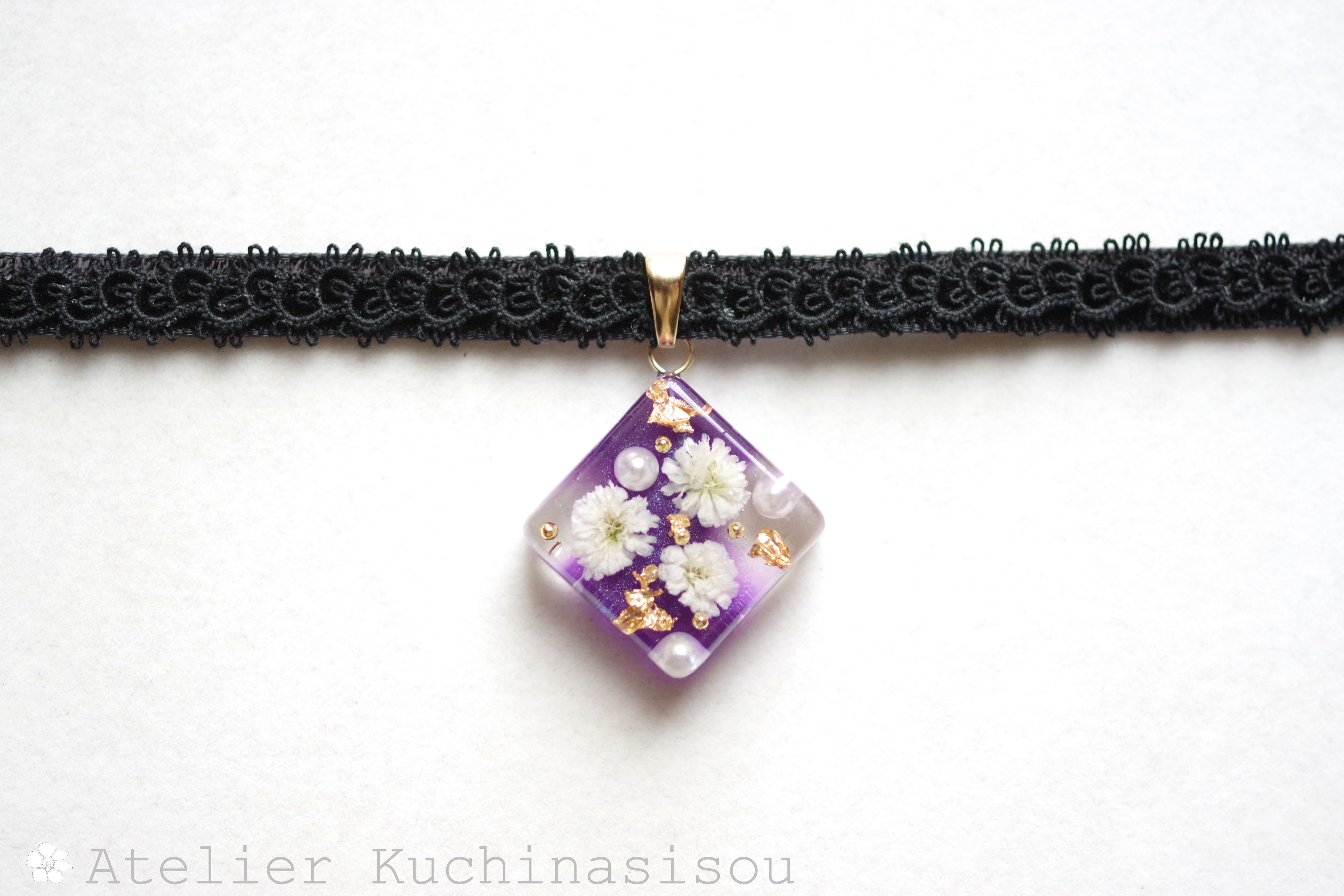 白いお花とパール、金箔を散らし、背景に光沢のあるパープルをのせた、淑やかで大人っぽいレジンを、ベルベットリボンにタティングレースで装飾を施したチョーカーに仕上げました。