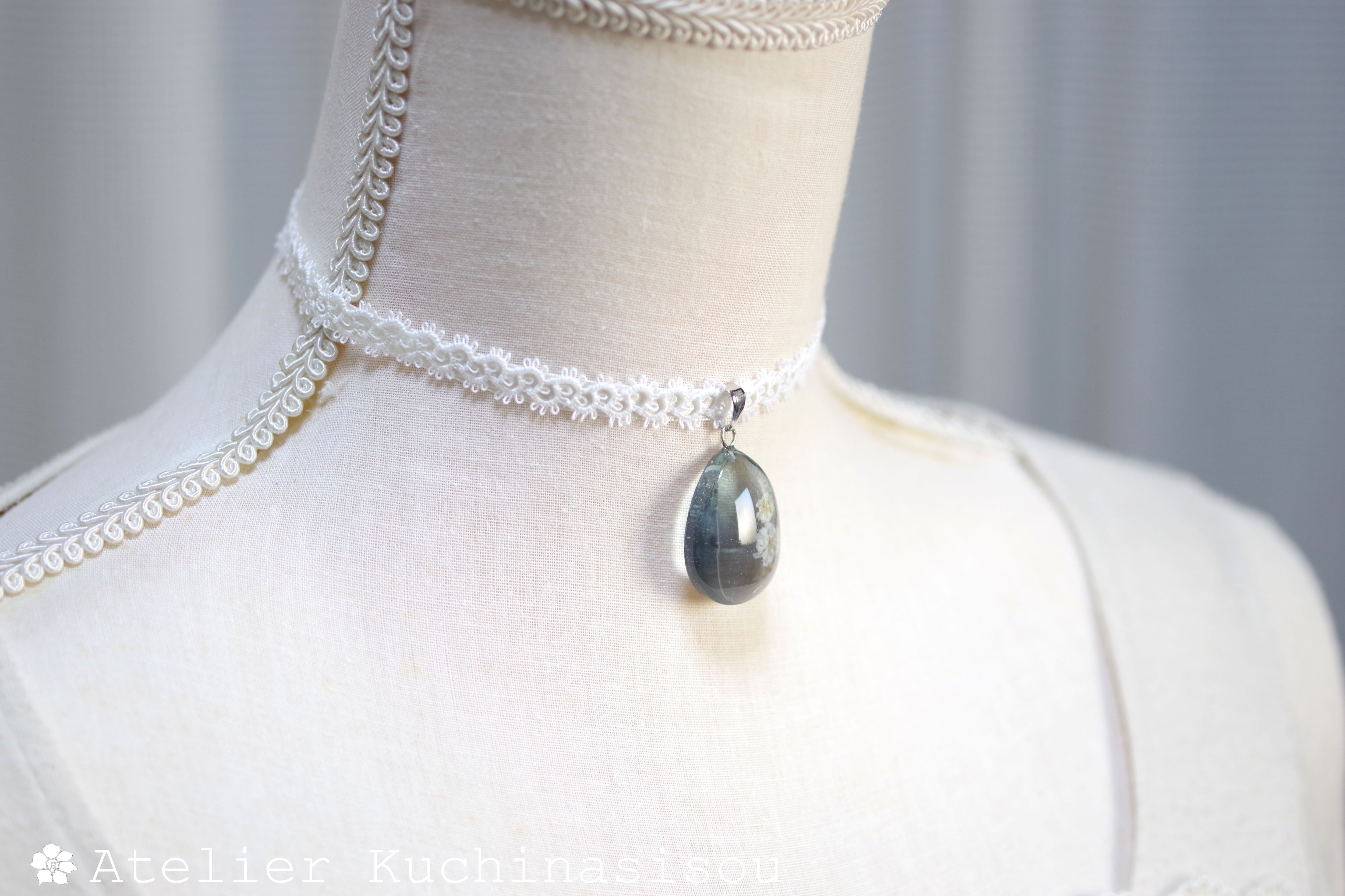 ドロップ型にお花を二輪咲かせた可憐なレジンを、サテンリボンにタティングレースで装飾を施したチョーカーに仕上げました。
