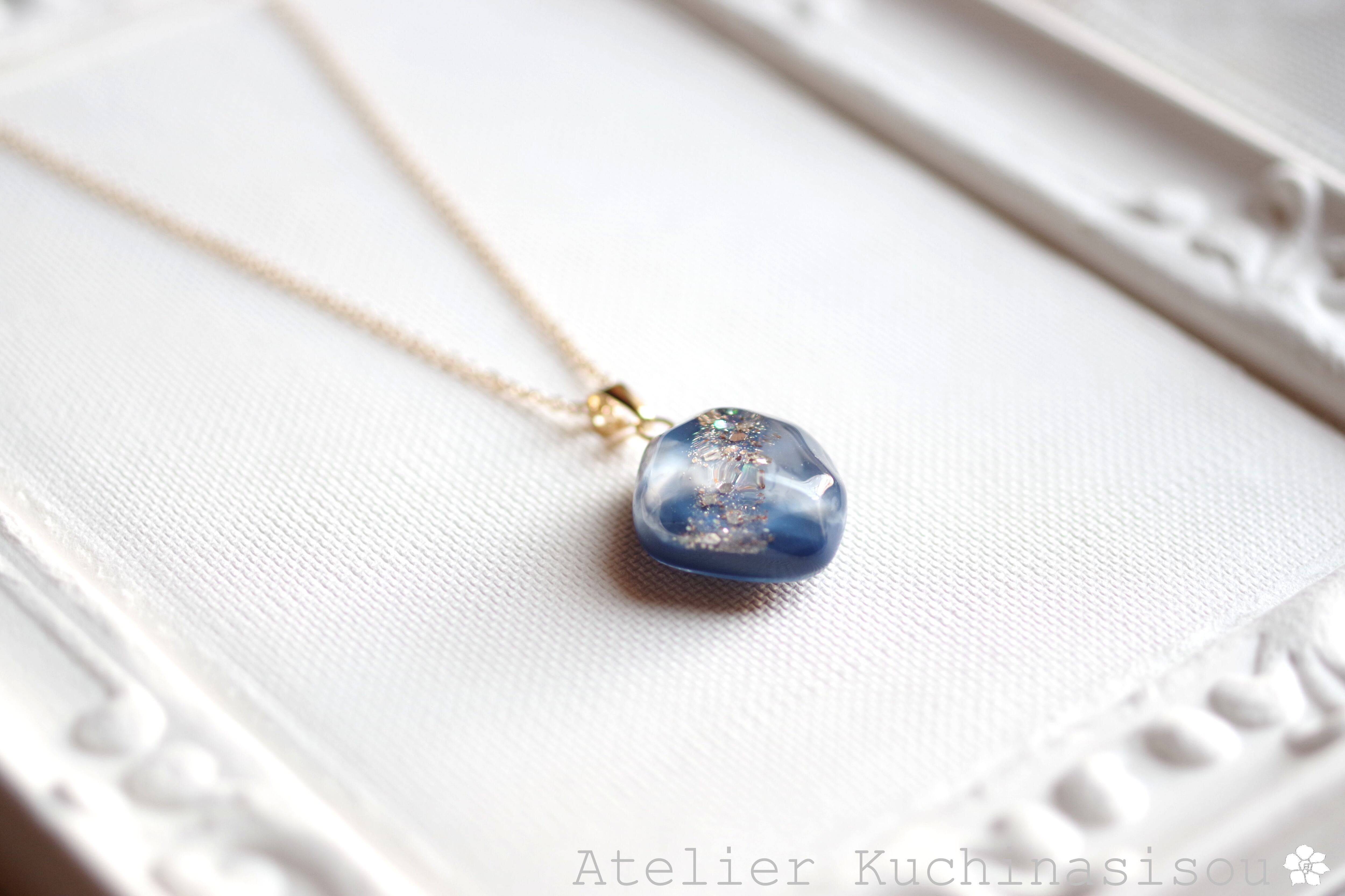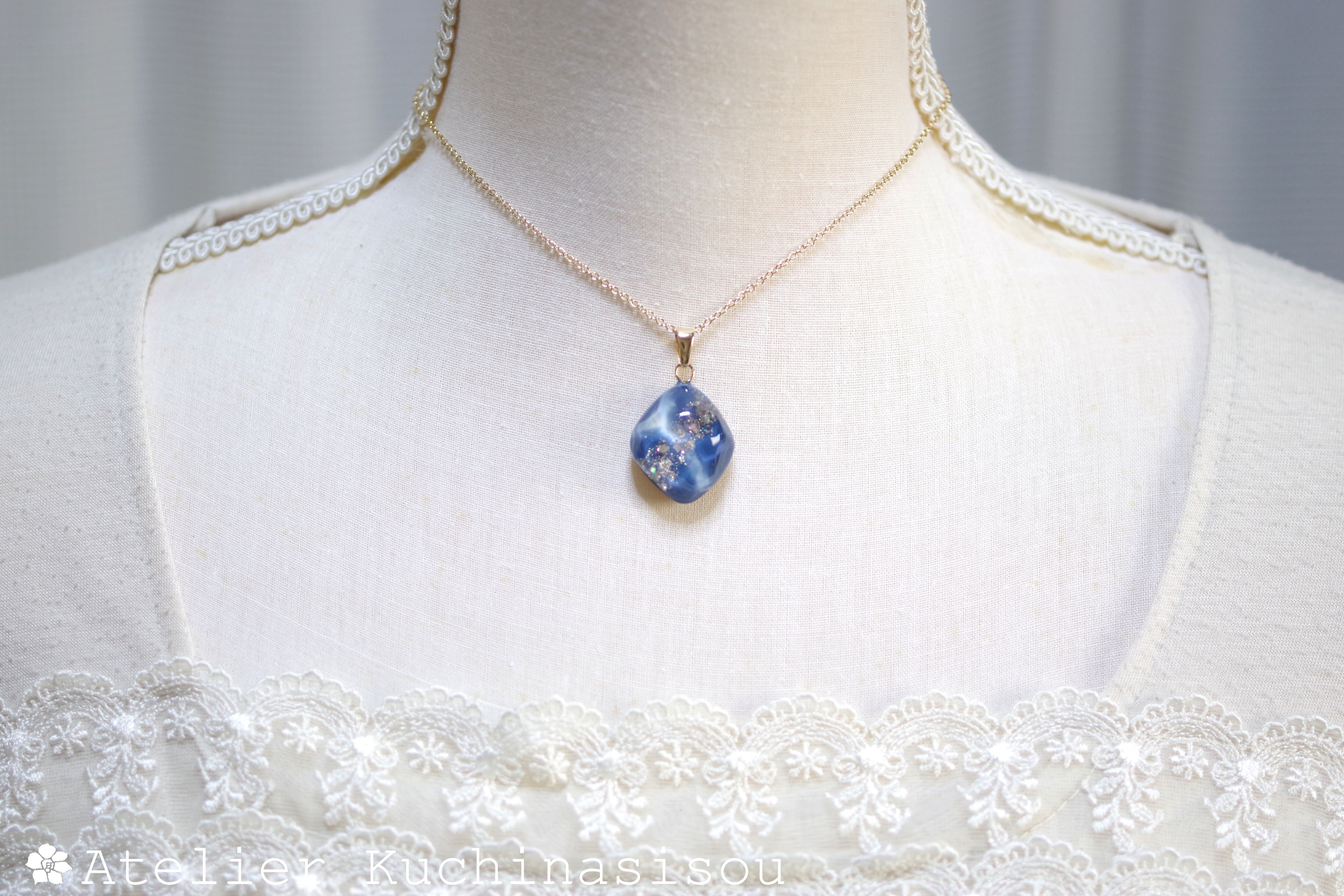 コバルトブルーとホワイトのマーブル模様と、きらめくラメが華やかで美しいペンダント。