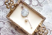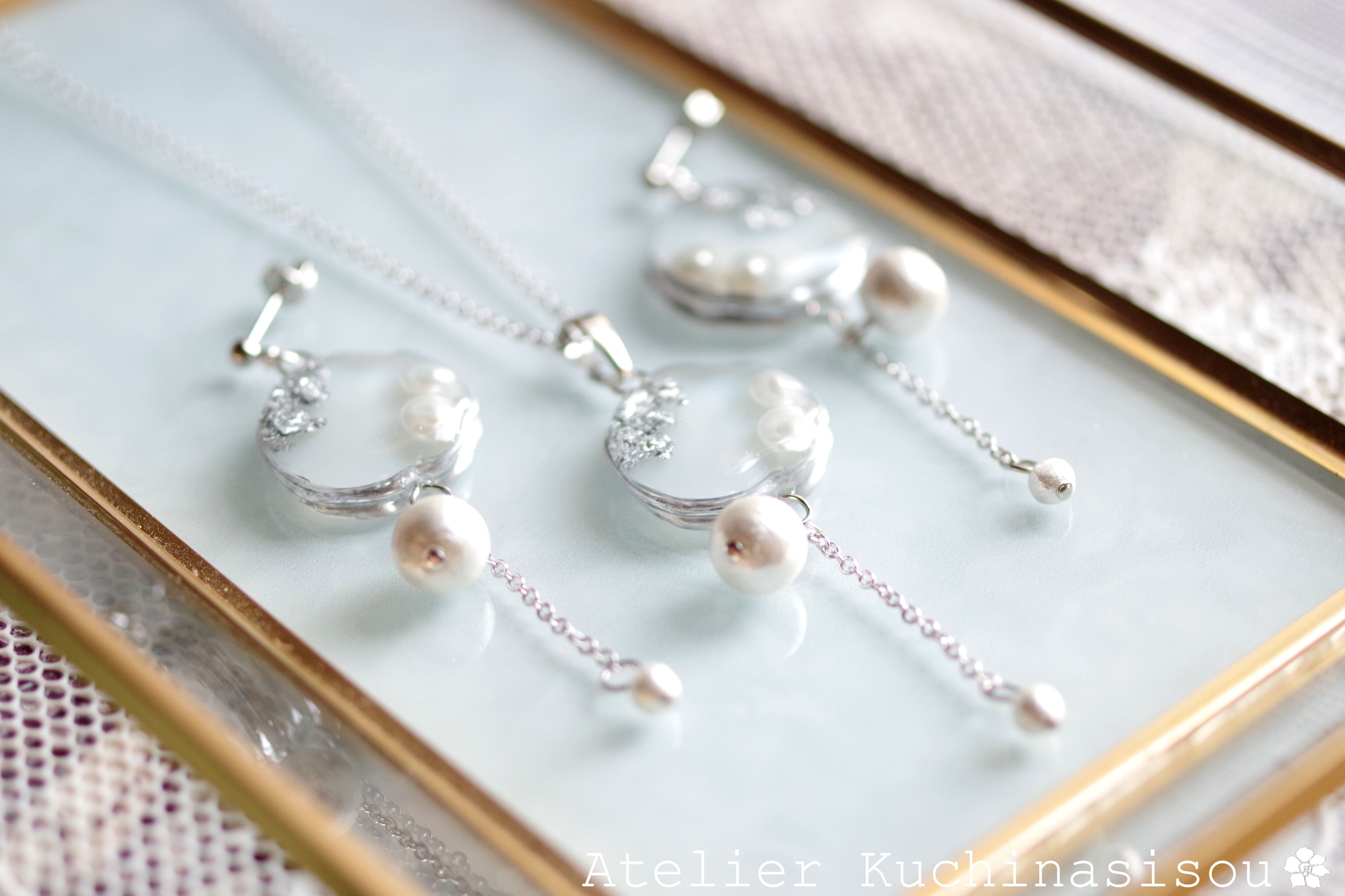 大小二粒のコットンパールを吊るして、高級感に可憐さを添えたアクセサリーに仕上げました。