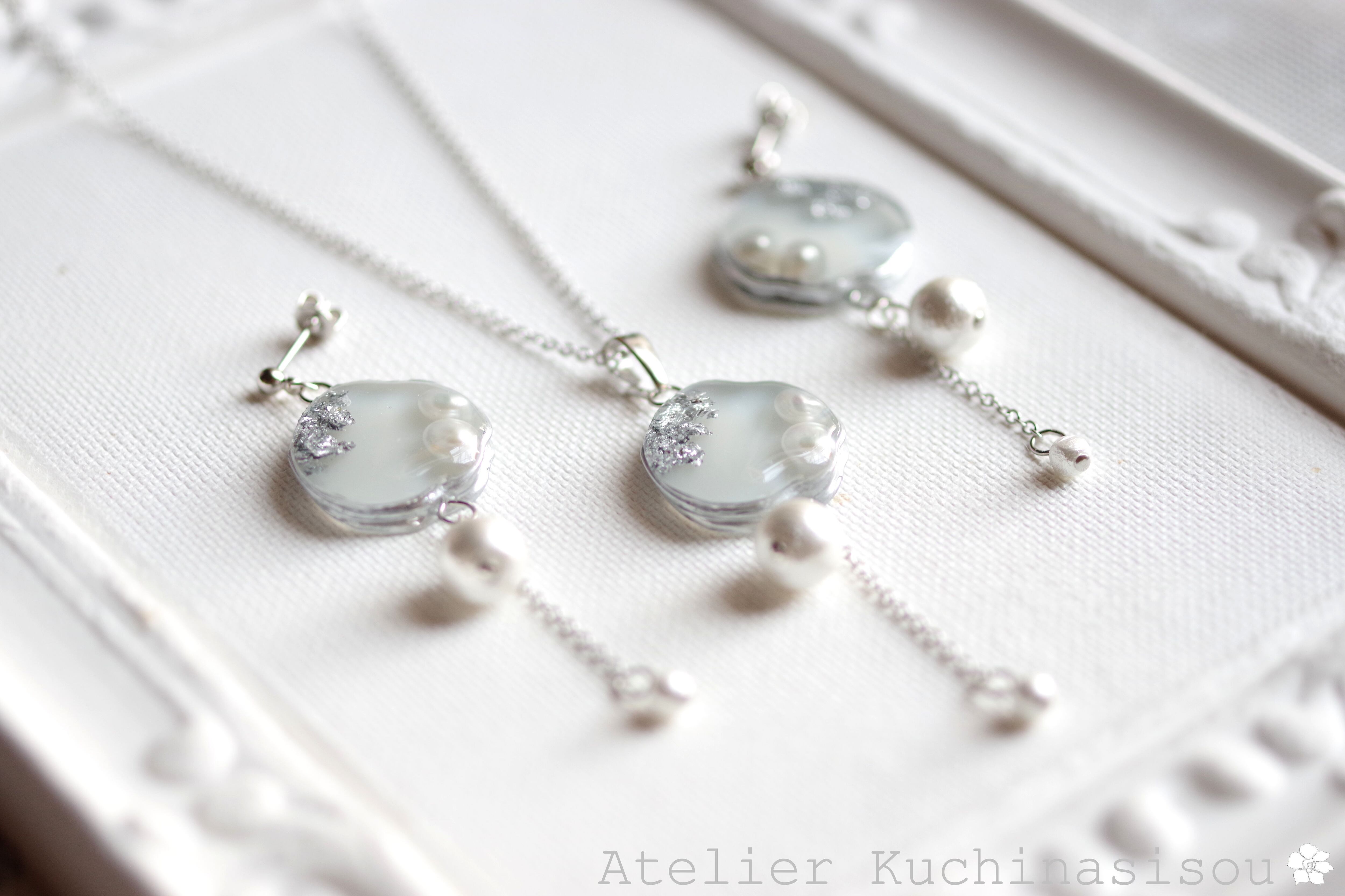 アゲートのようなレジンに淡水パールと銀箔を沈めました。