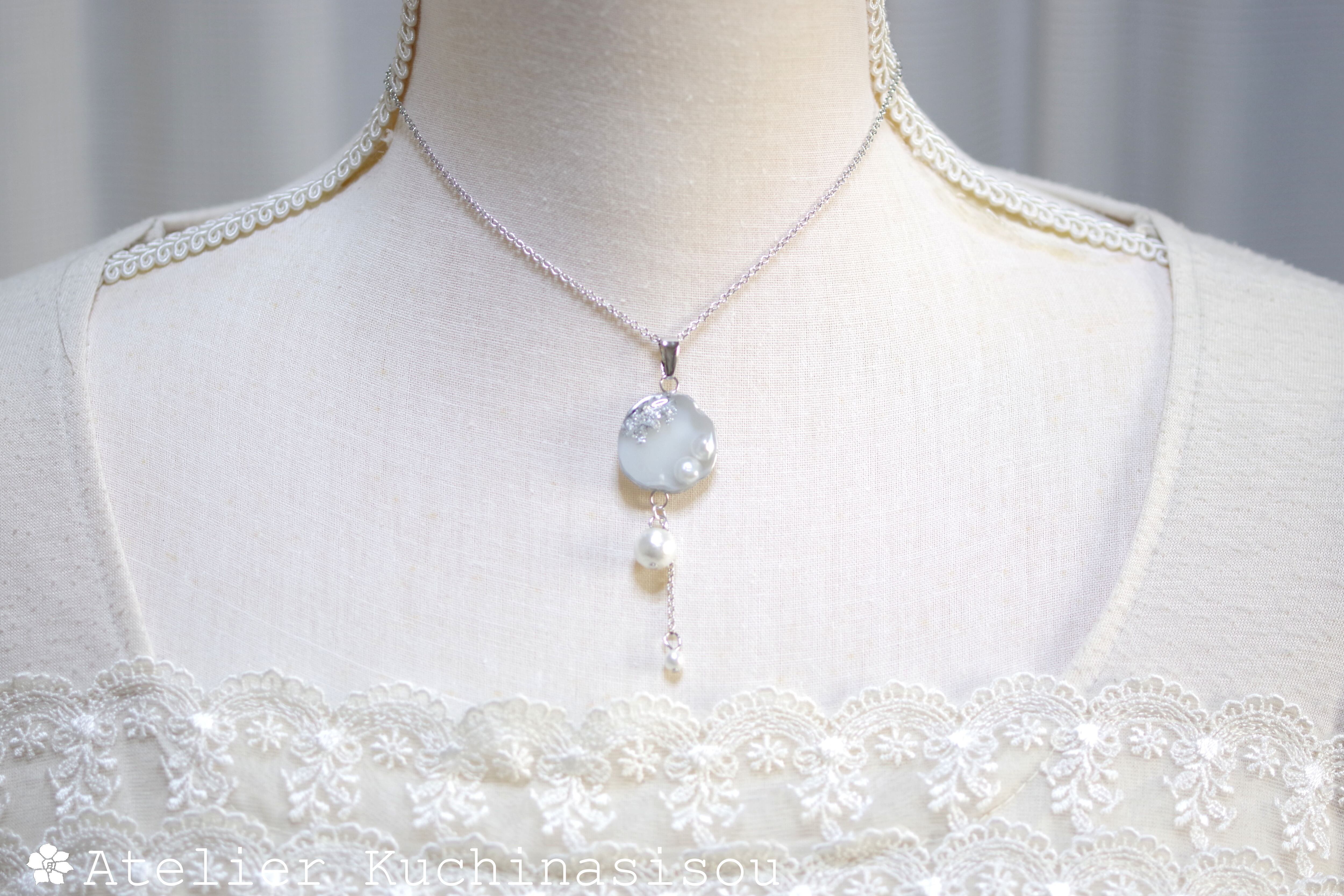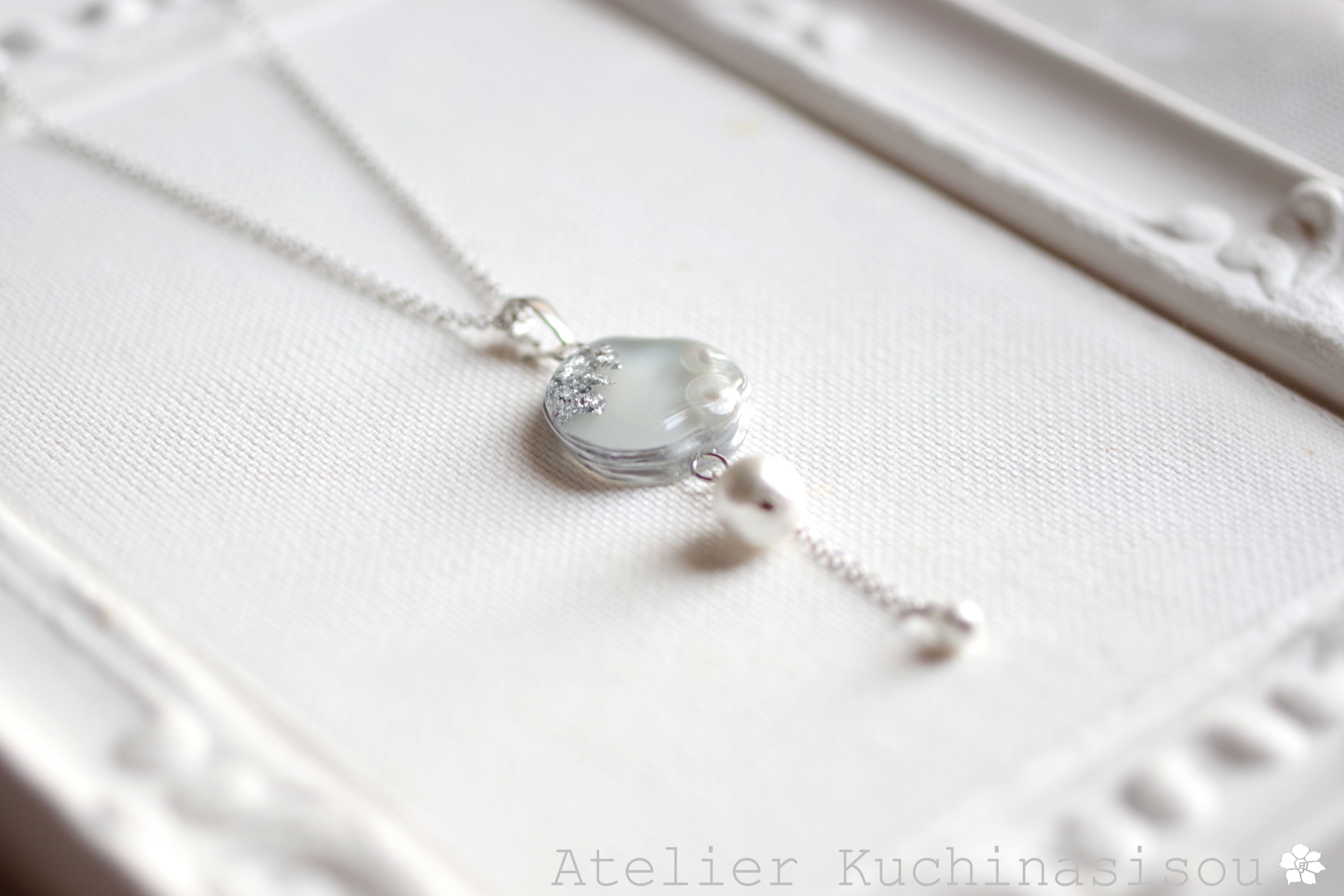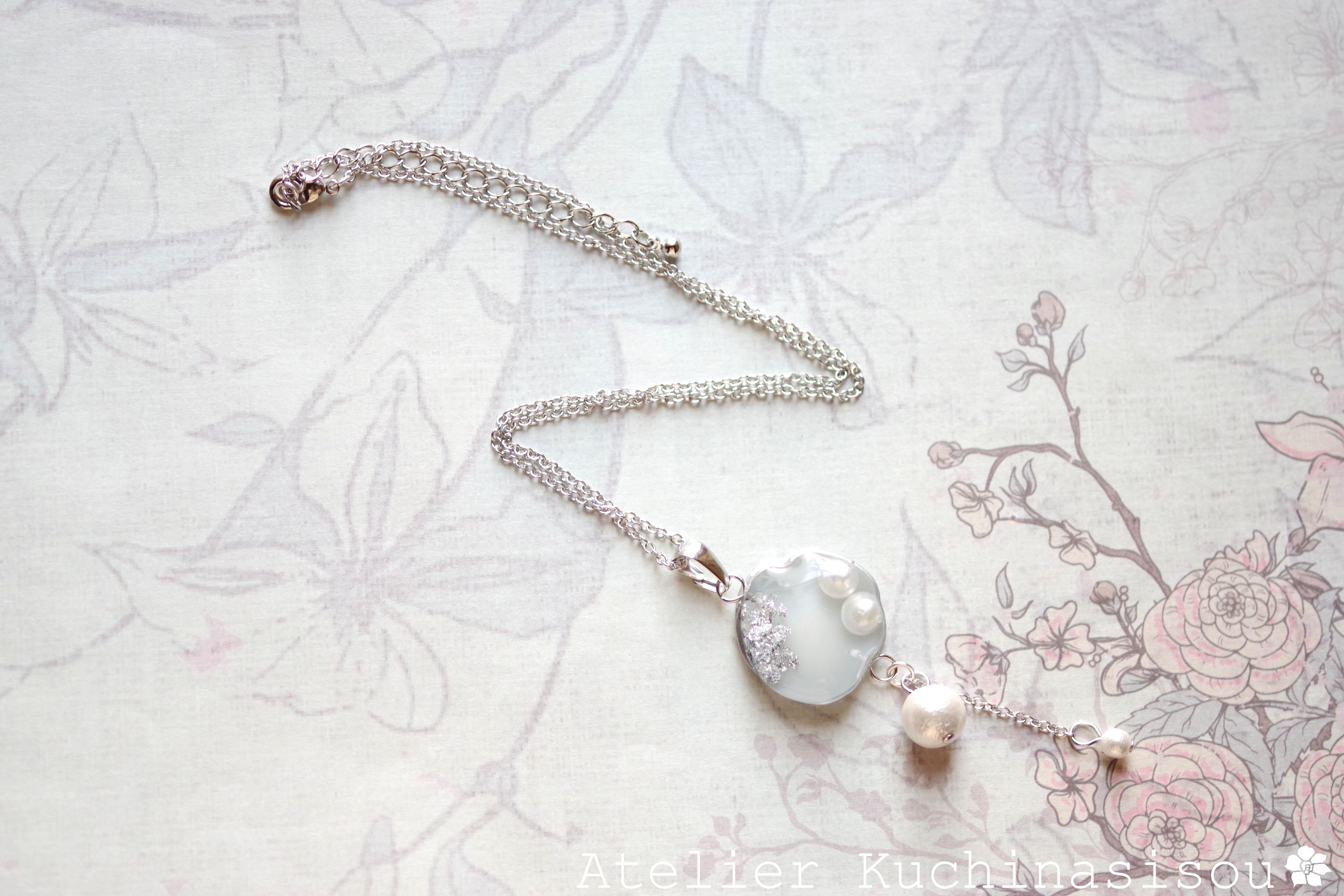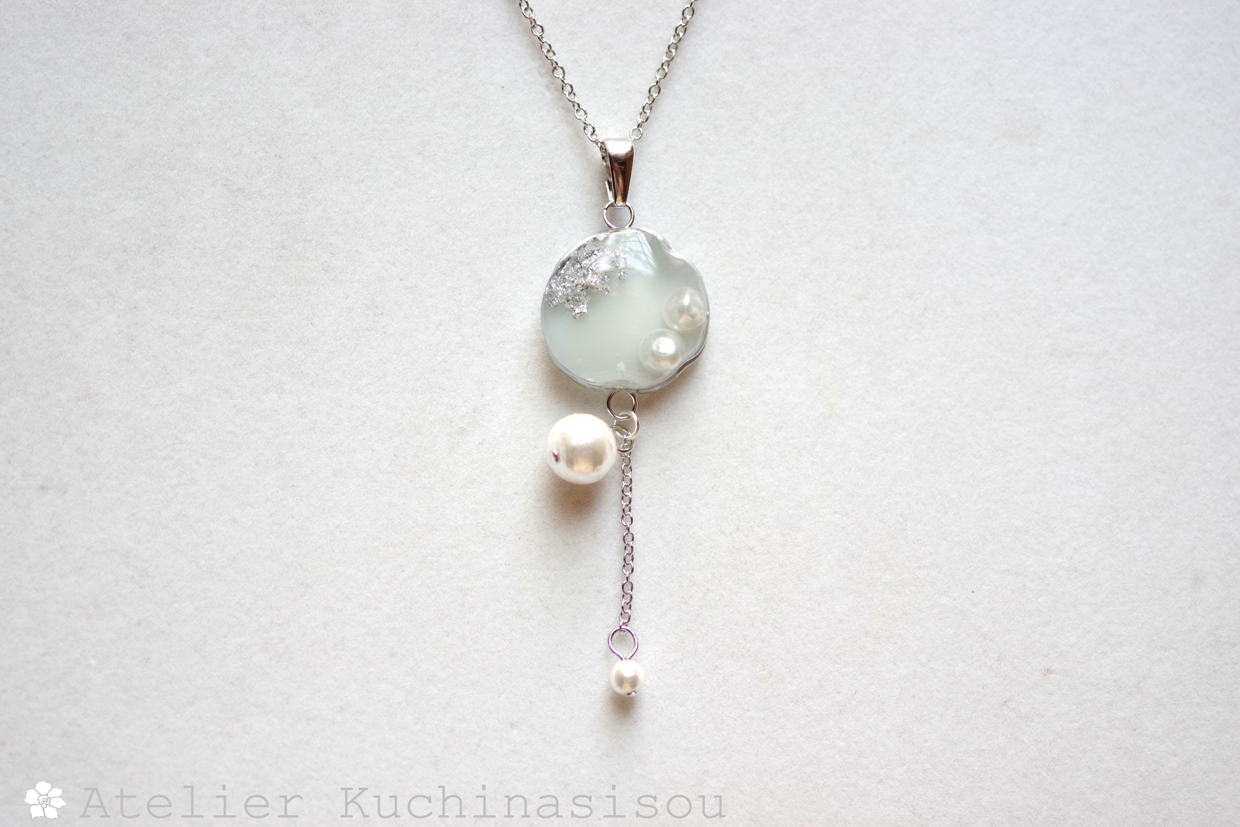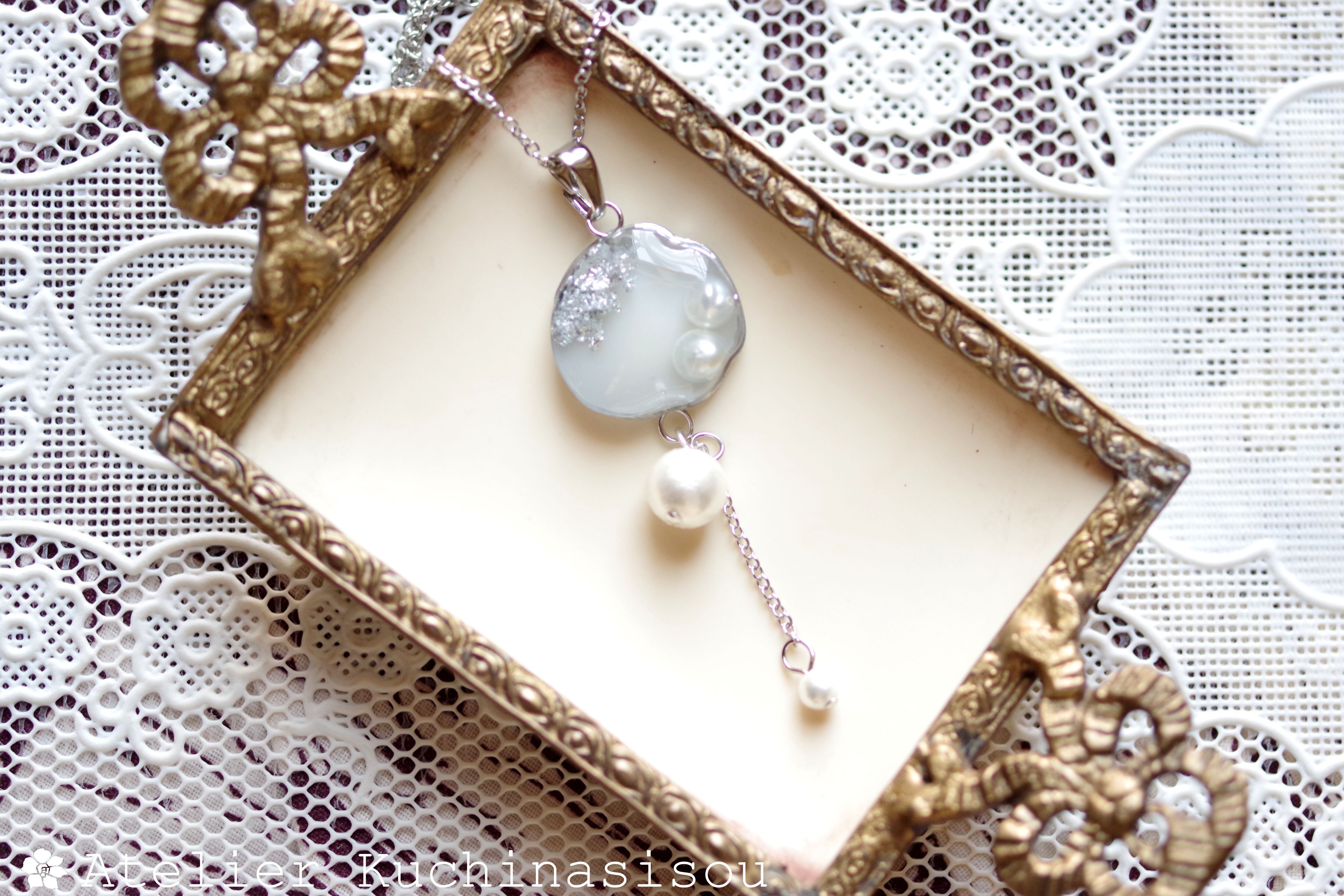 レジンアート スライスアゲートとコットンパールのペンダント〈みぞれ〉