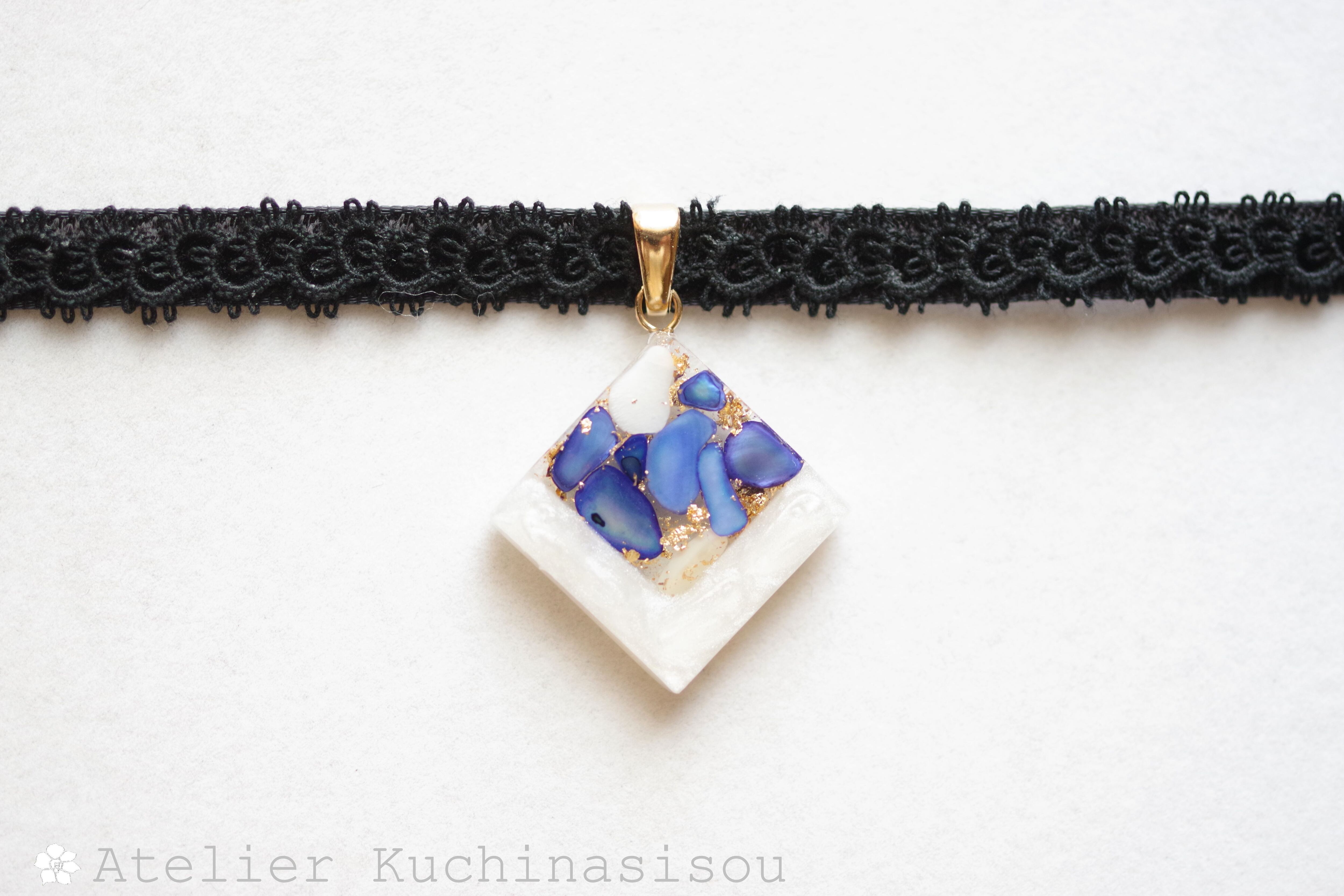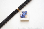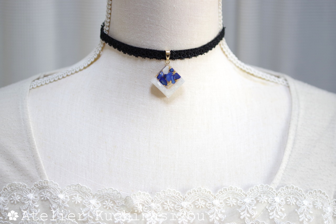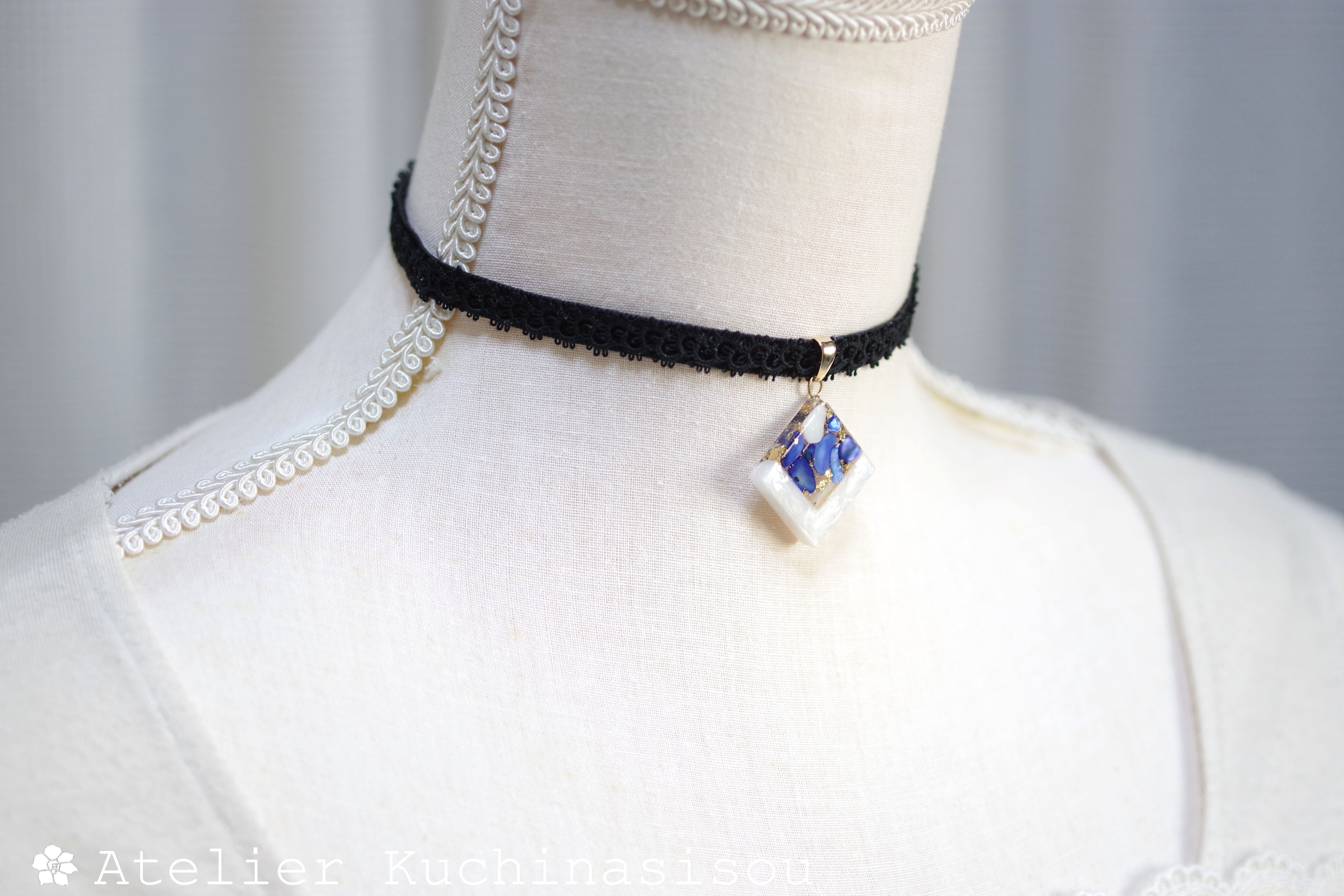 ホワイトシェルと鮮やかなコバルトブルーに着色されたシェルを沈め、光沢のあるホワイトで囲ったレジンを、ベルベットリボンにタティングレースで装飾を施したチョーカーに仕上げました。